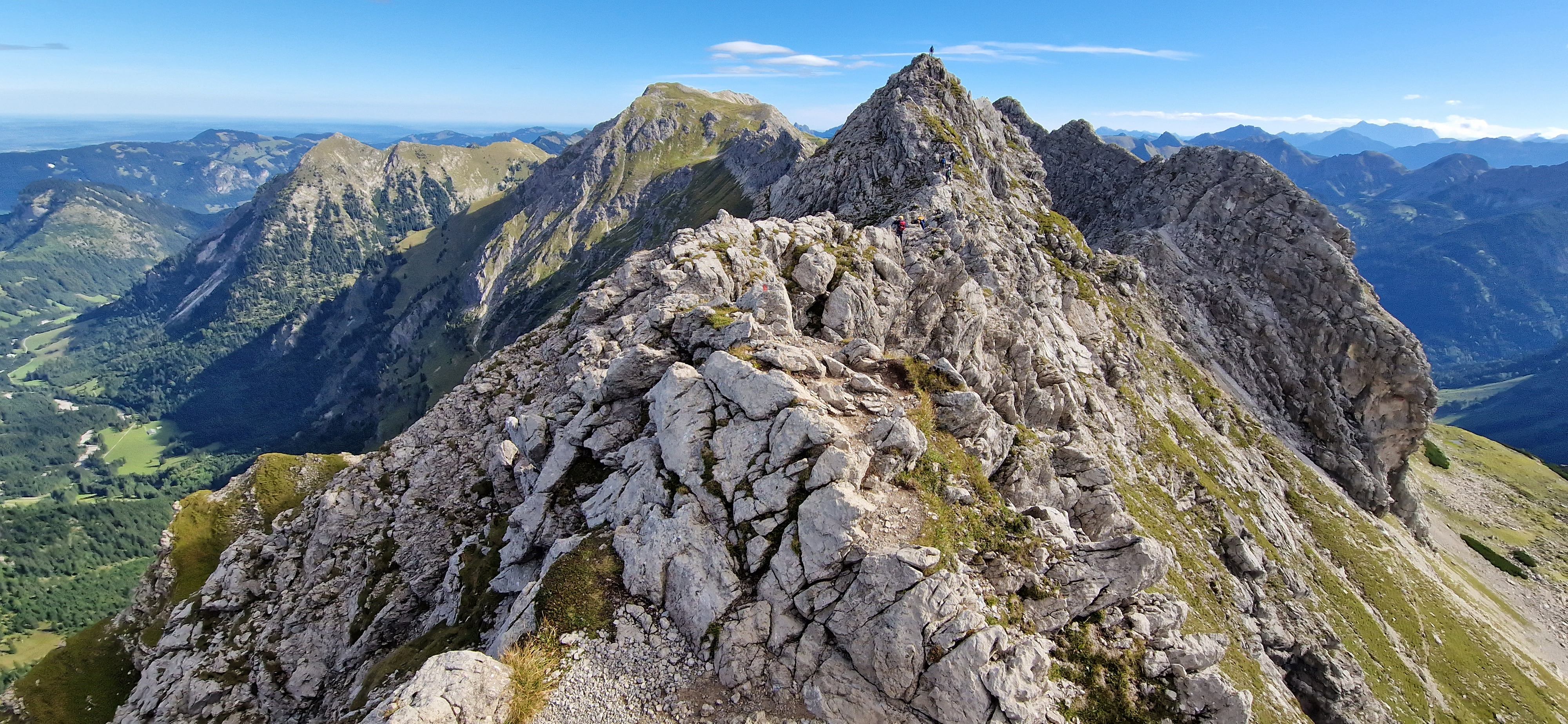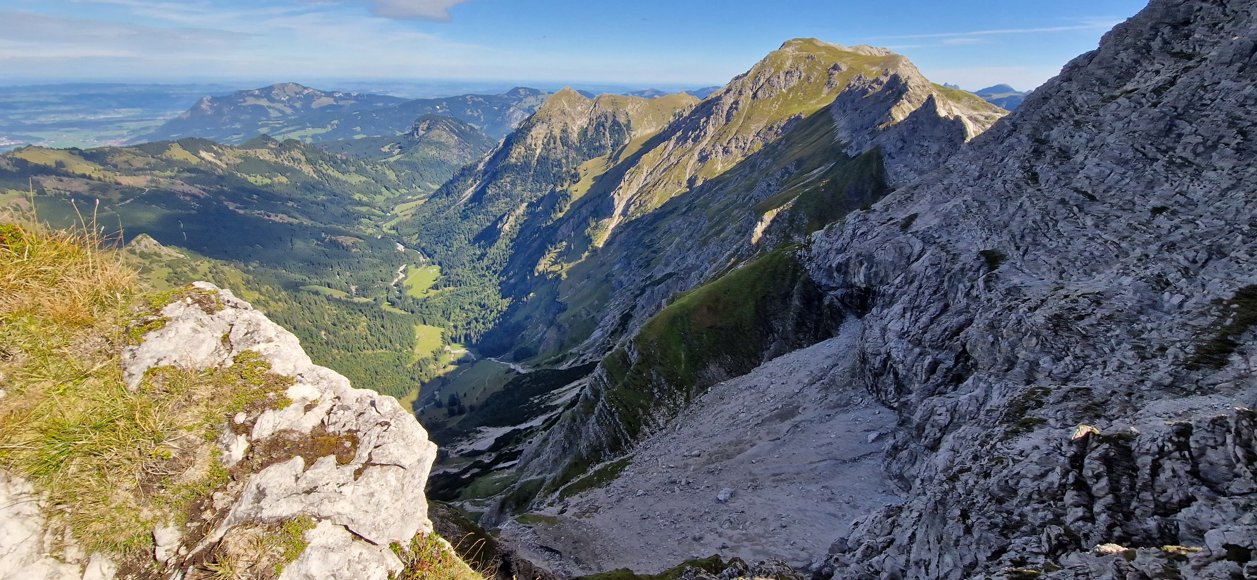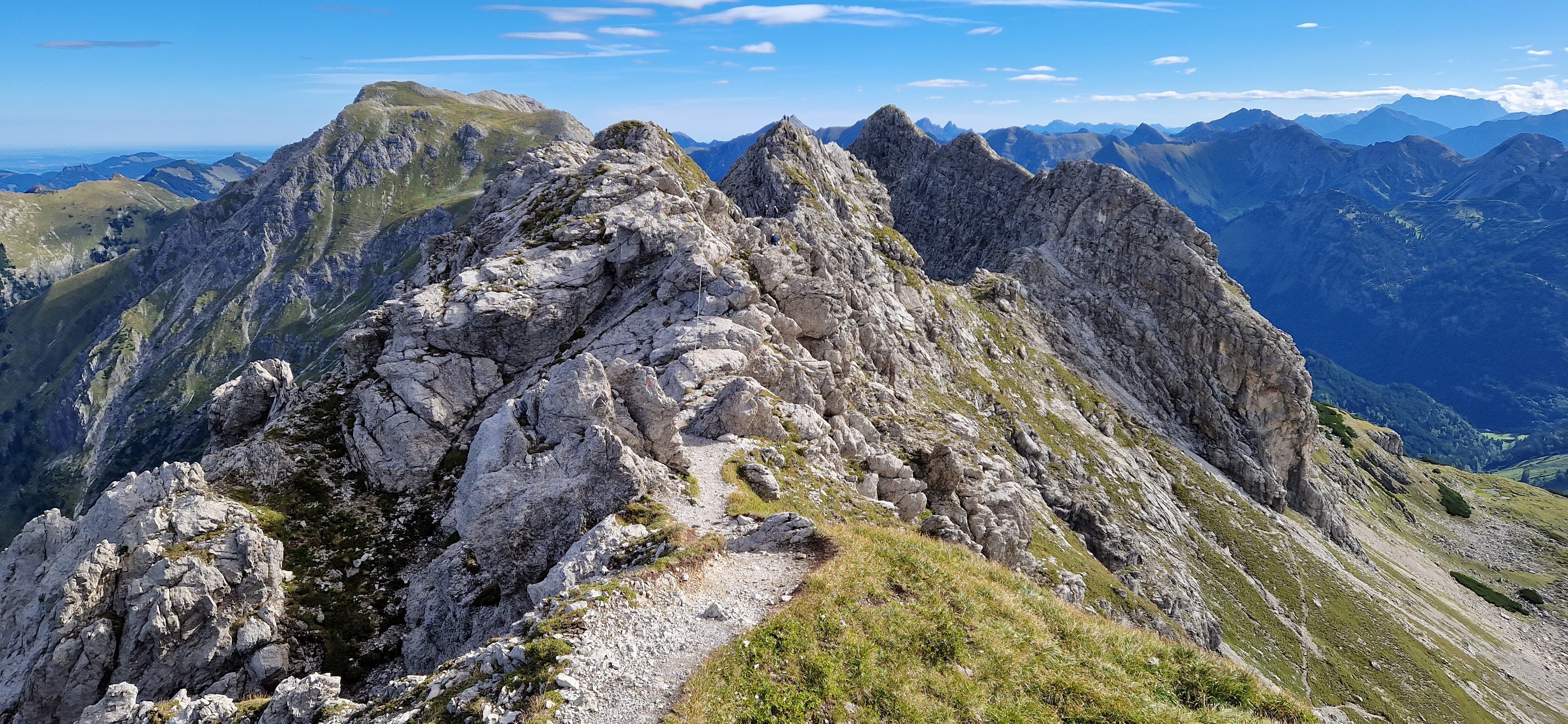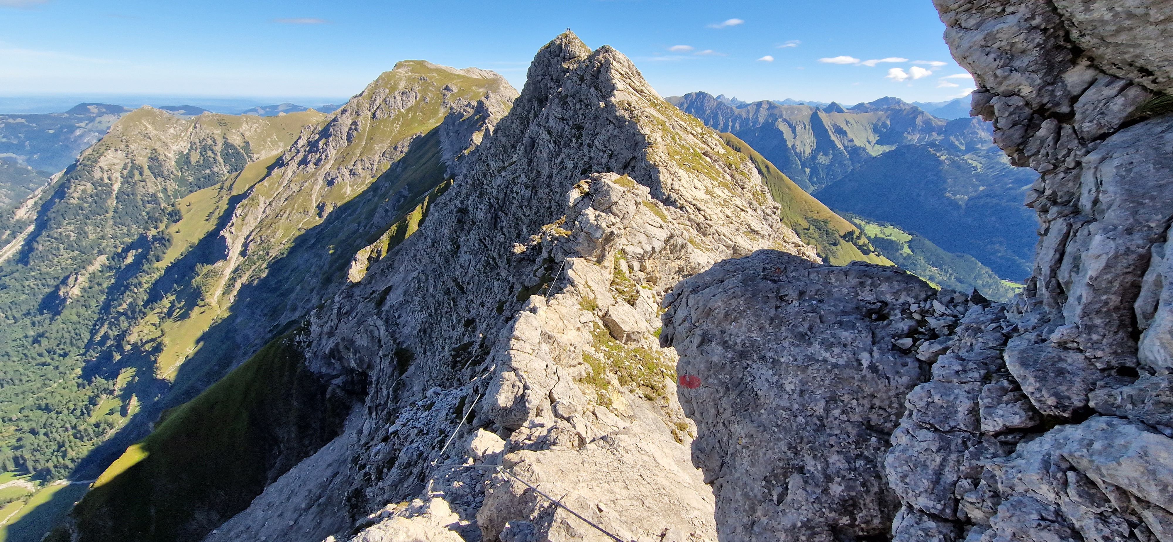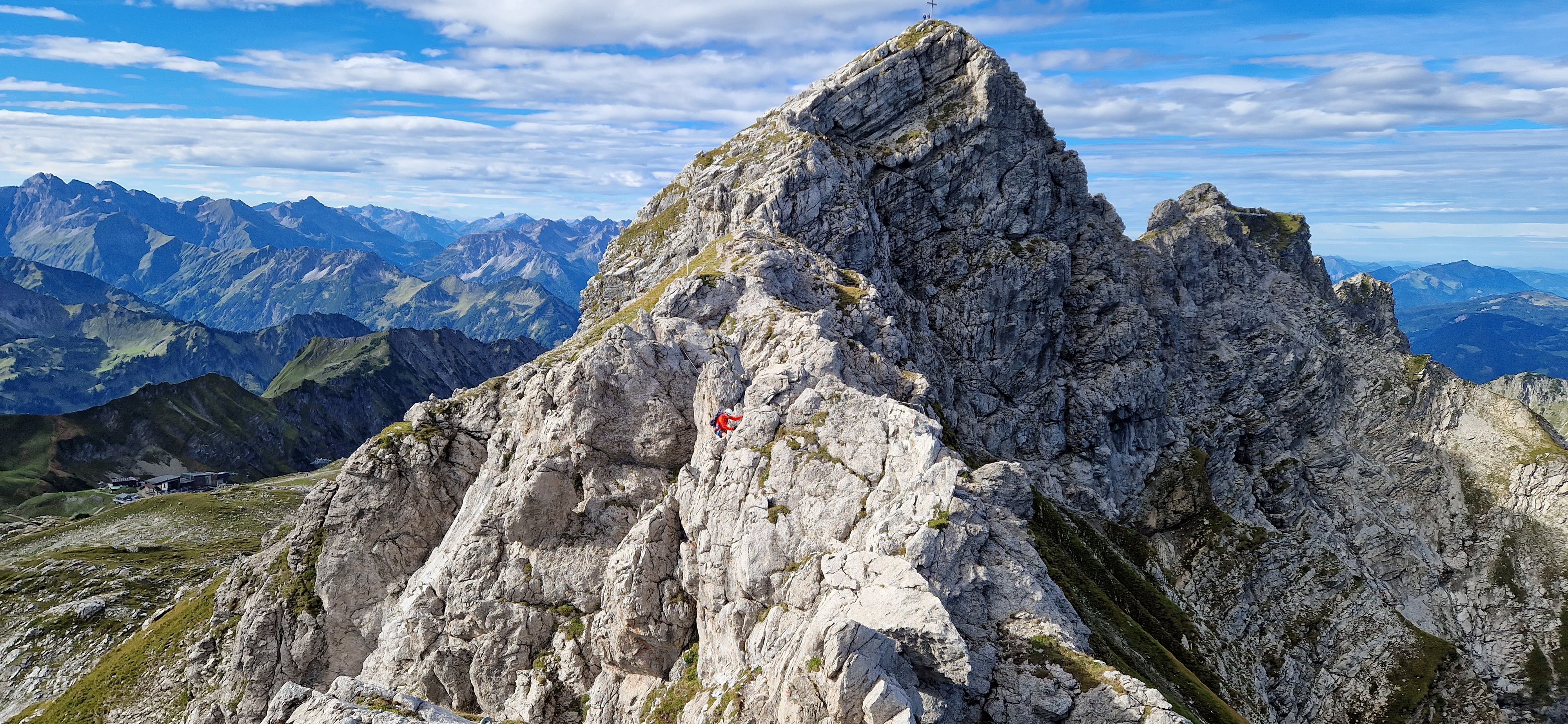 Nach einer Dienstreise in der Nähe beschließe ich einen Tag in Oberstdorf zu verbringen und den Hindelanger Klettersteig zu gehen. Oberstdorf ist mit der Bahn super zu erreichen und alles Wichtige ist fußläufig erreichbar. Ich habe ein Zimmer mit Frühstück in einer Pension in zentraler Lage. Fünf Minuten sind es zum Bahnhof und ebenso zum nächsten größeren Supermarkt, wo ich mich mit dem nötigsten für die Tour versorgen kann. Zum Frühstück habe ich mir zwei extra Brötchen für die Tour bestellt, damit ich nicht noch beim Bäcker vorbei muss. Mein Rucksack mit der kompletten Ausrüstung wird am Abend des Anreisetags nochmal gecheckt und gepackt. Am nächsten Tag geht es nach dem Frühstück los Richtung Seilbahnstation. Tipp: so früh wie möglich los, die Tour ist lang und für den Rückweg vom großen Daumen zur Bergstation Höfatsblick sollte man ca. zwei Stunden einplanen. Generell empfehle ich eine gute Planung und Vorbereitung der Tour. An der Talstation angekommen muss ich leider etwas Wartezeit in Kauf nehmen, da mehrere Schulklassen bereits vor mir da sind. Vom Nebelhorn Gipfel ist der gesamte Gebirgskamm und damit der Verlauf des Hindelanger Klettersteiges bis hin zum Großen Daumen zu überblicken. Unterhalb der Station quert ein kleiner Bergpfad in Richtung Einstieg. Ich genieße die Aussicht bei herrlichem Wetter. Mit gut einer dreiviertel Stunde hinter Plan lege ich meine Klettersteig-Ausrüstung an und beginne die Tour.