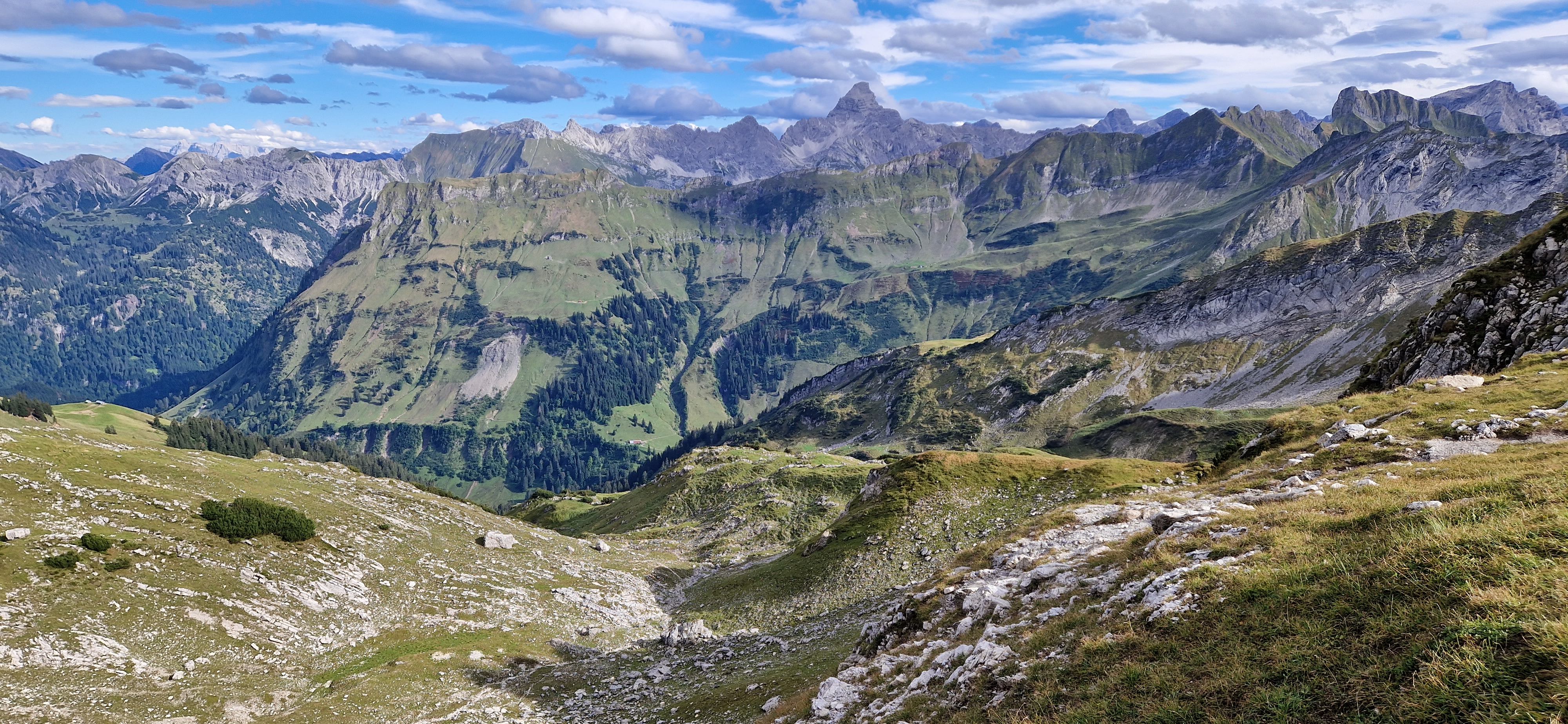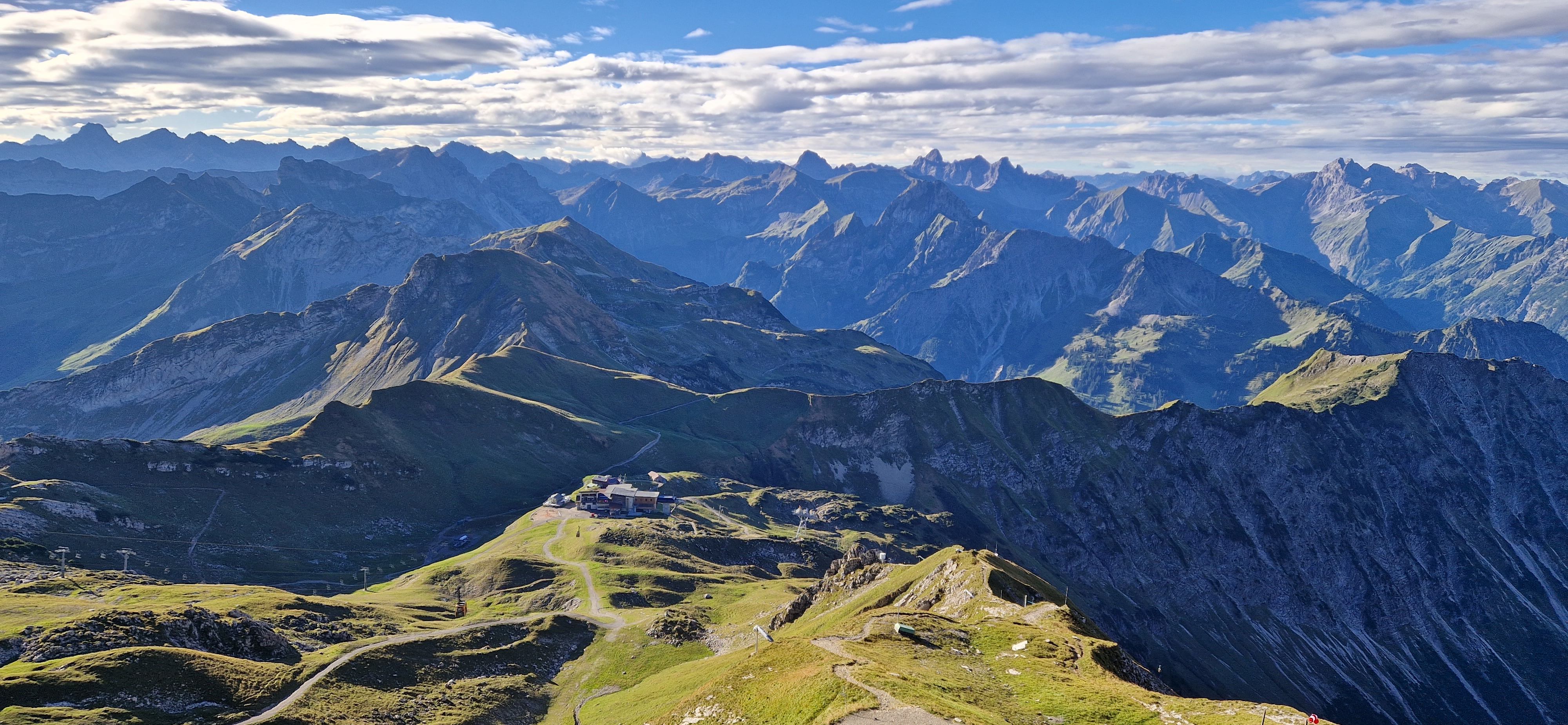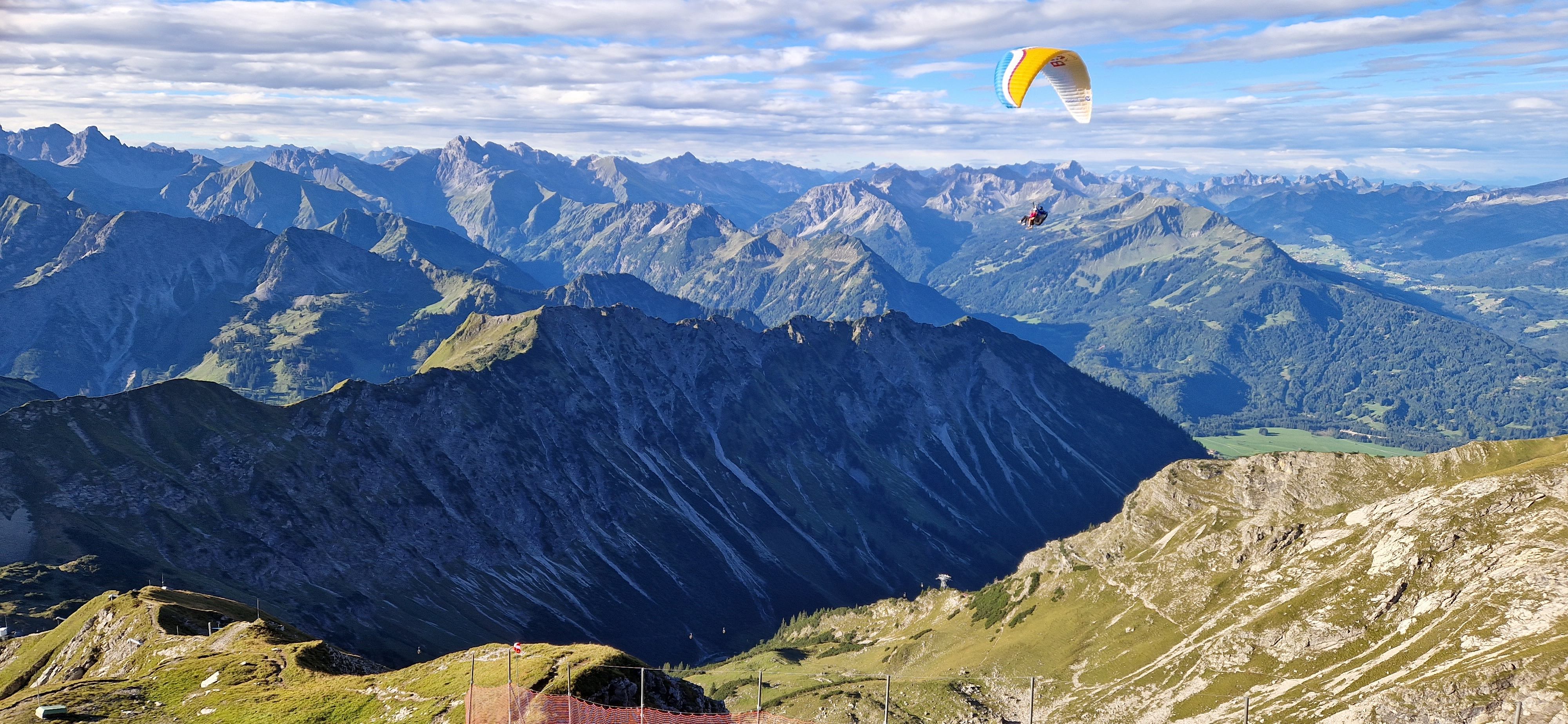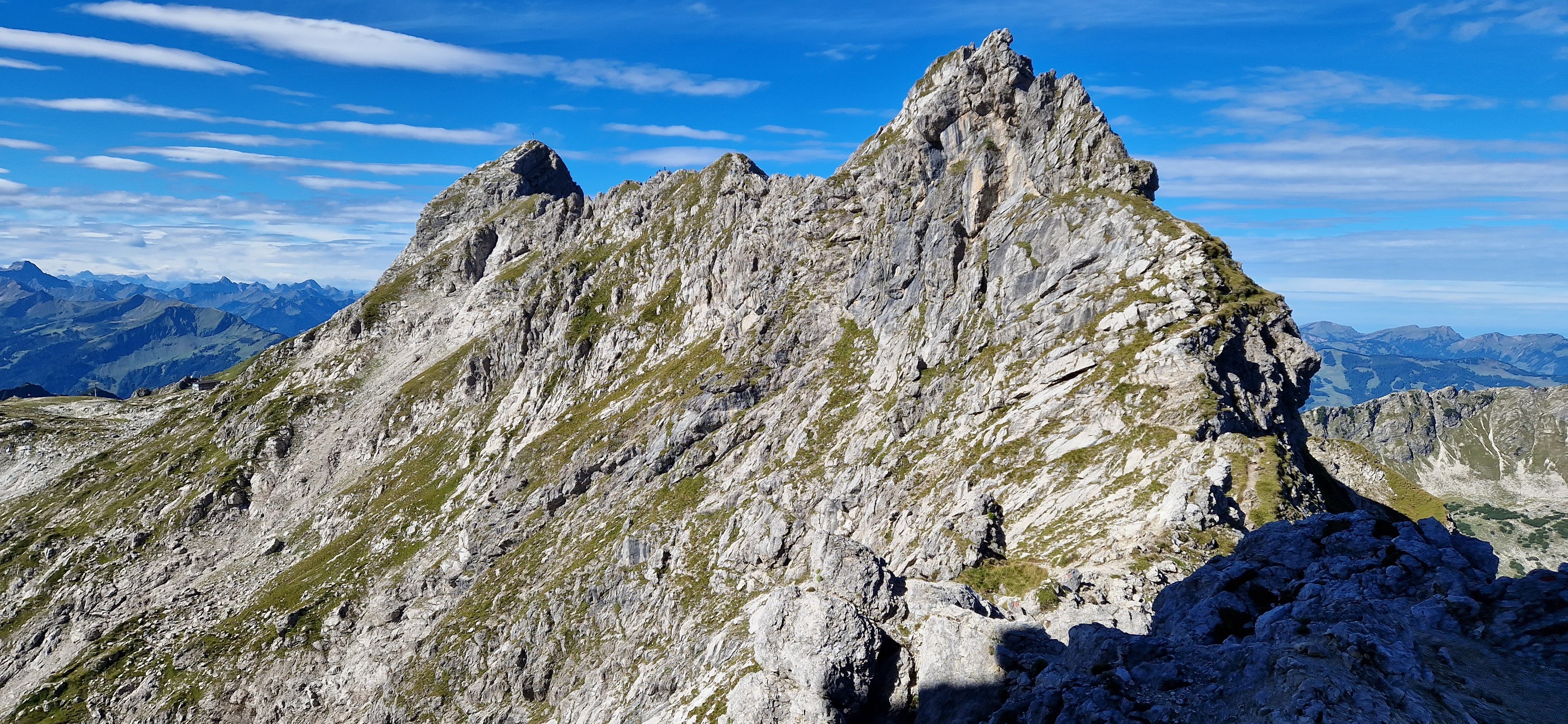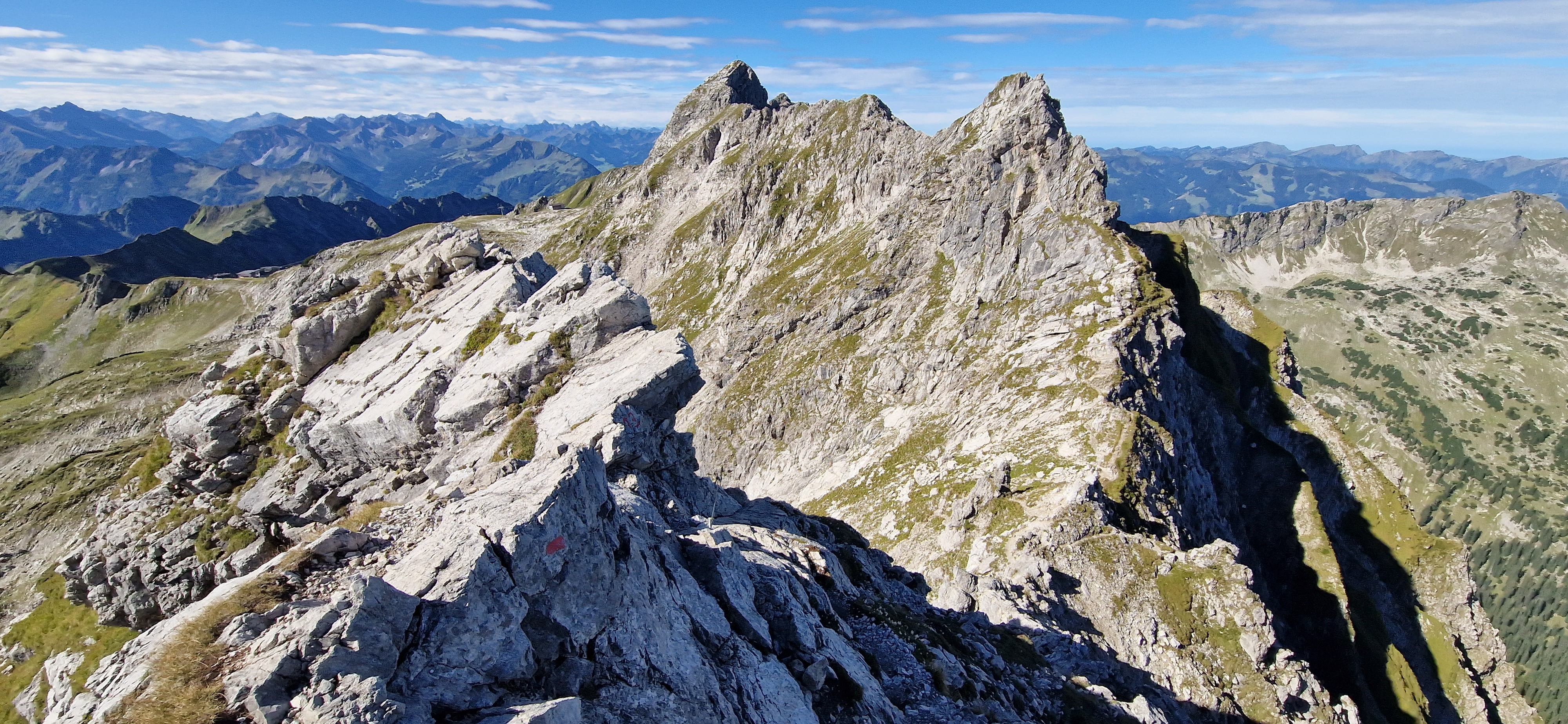 Nach einer Dienstreise in der Nähe beschließe ich einen Tag in Oberstdorf zu verbringen und den Hindelanger Klettersteig zu gehen. Oberstdorf ist mit der Bahn super zu erreichen und alles Wichtige ist fußläufig erreichbar. Ich habe ein Zimmer mit Frühstück in einer Pension in zentraler Lage. Fünf Minuten sind es zum Bahnhof und ebenso zum nächsten größeren Supermarkt, wo ich mich mit dem nötigsten für die Tour versorgen kann. Zum Frühstück habe ich mir zwei extra Brötchen für die Tour bestellt, damit ich nicht noch beim Bäcker vorbei muss. Mein Rucksack mit der kompletten Ausrüstung wird am Abend des Anreisetags nochmal gecheckt und gepackt. Am nächsten Tag geht es nach dem Frühstück los Richtung Seilbahnstation. Tipp: so früh wie möglich los, die Tour ist lang und für den Rückweg vom großen Daumen zur Bergstation Höfatsblick sollte man ca. zwei Stunden einplanen. Generell empfehle ich eine gute Planung und Vorbereitung der Tour. An der Talstation angekommen muss ich leider etwas Wartezeit in Kauf nehmen, da mehrere Schulklassen bereits vor mir da sind. Vom Nebelhorn Gipfel ist der gesamte Gebirgskamm und damit der Verlauf des Hindelanger Klettersteiges bis hin zum Großen Daumen zu überblicken. Unterhalb der Station quert ein kleiner Bergpfad in Richtung Einstieg. Ich genieße die Aussicht bei herrlichem Wetter. Mit gut einer dreiviertel Stunde hinter Plan lege ich meine Klettersteig-Ausrüstung an und beginne die Tour.