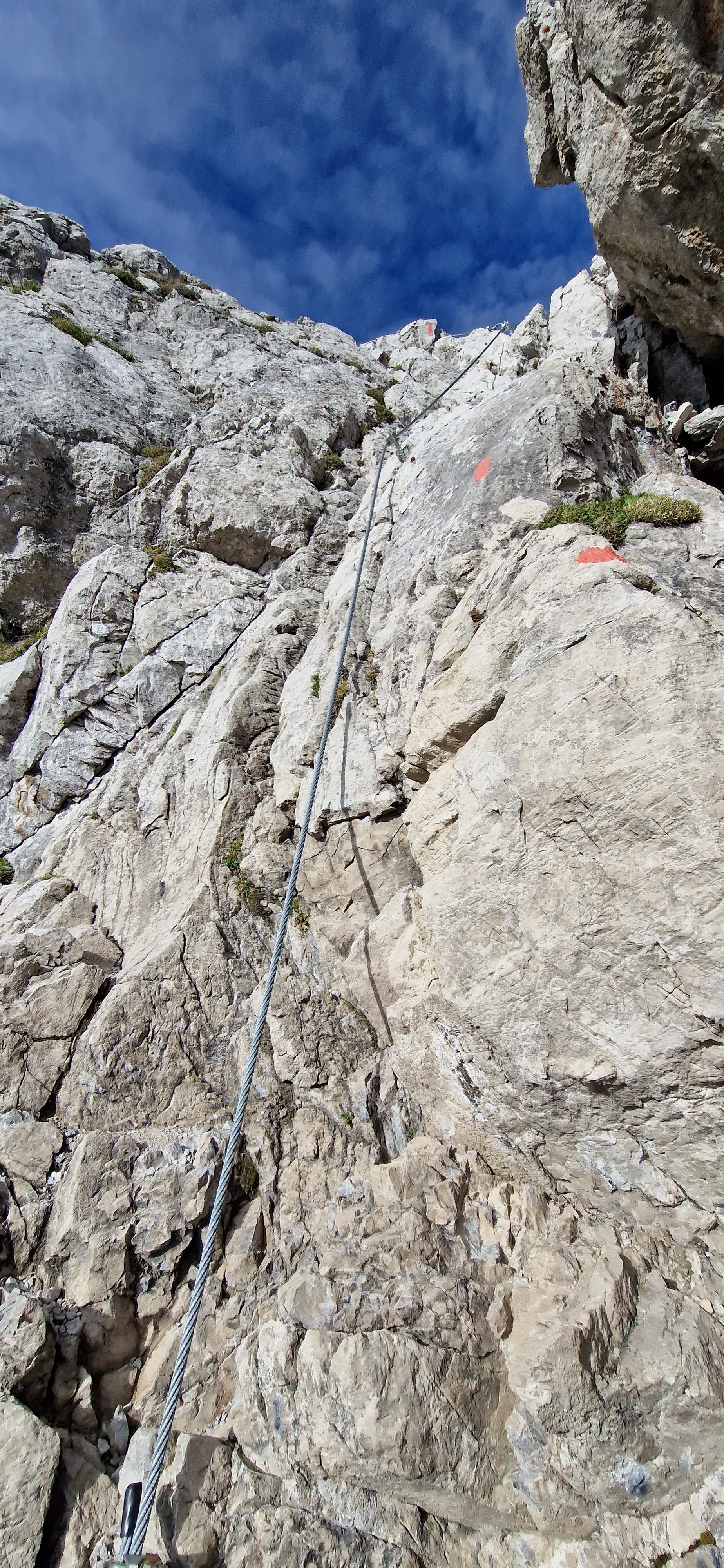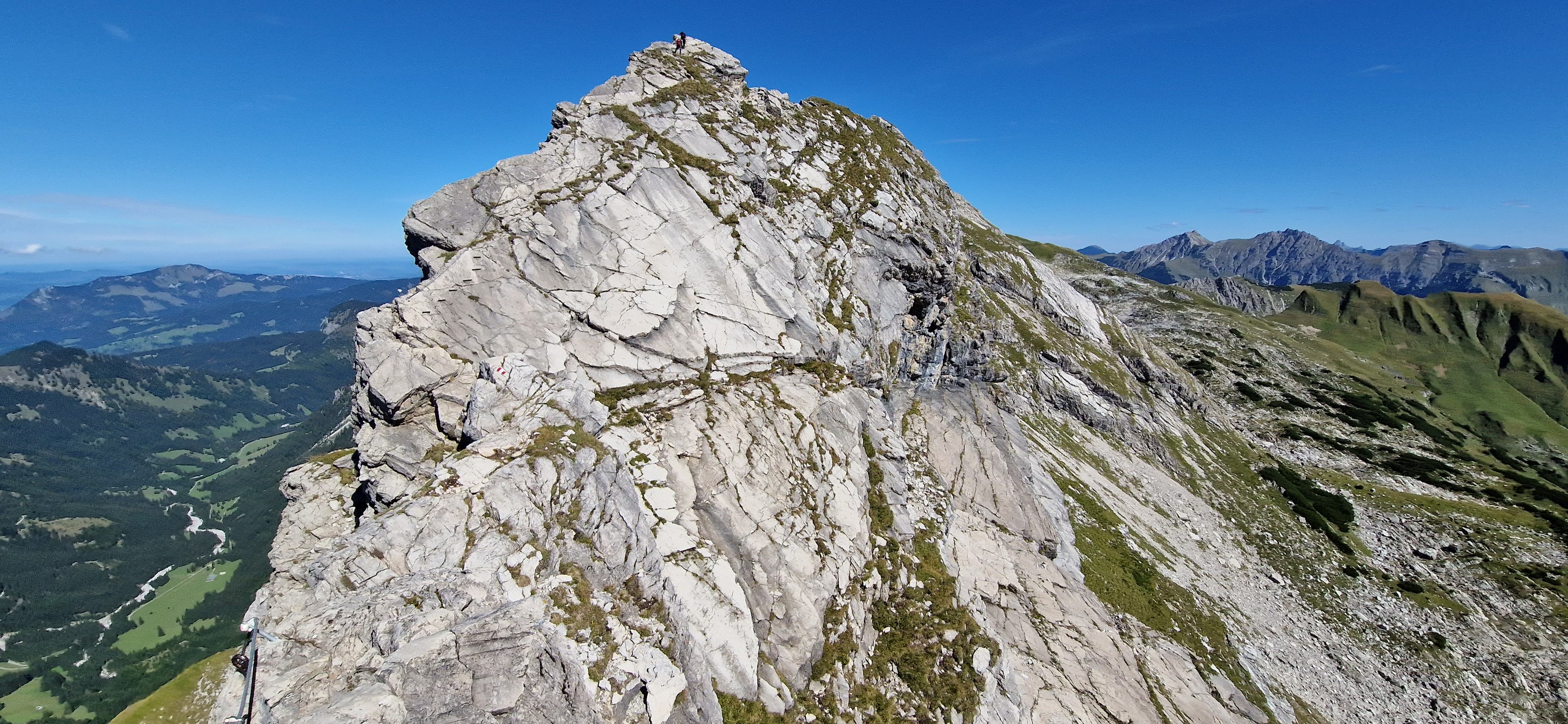Nach dem Einstieg mit den ersten einfachen Kletterstellen geht es über eine etwa 10 Meter hohen Leiter hinauf zum Grat des westlichen Wengenkopfes. Ein luftiger Grat führt über die ersten, ausgesetzten Kletterpassagen zum westlichen Wengenkopf. Vom Gipfel genieße ich bei guter Sicht das Panorama. Weiter geht es über den felsigen Kamm entlang der Stahlseilsicherungen, über Leitern, Felsscharten und exponierte Gratpassagen in Richtung des östlichen Wengenkopfes. Hier führt der erste Zwischenabstieg über das Koblat zurück zur Seilbahn Station Höfatsblick. Für mich geht es weiter über eine Menge Steighilfen, Drahtseilsicherungen und Eisenleitern. Vom östlichen Wengenkopf geht es erst einmal abwärts bis zum niedrigsten Punkt des Bergkammes. Der Weg zieht sich und ich spüre das auf und ab in den Beinen. Zum Abschluss der Tour gilt es nochmal eine luftige Felsformation zu erklettern und dann ein Felsband zu queren. Hier ist nochmal Kondition und Konzentration gefordert, bevor ich das Ende des Klettersteigs unterhalb des großen Daumens erreiche.