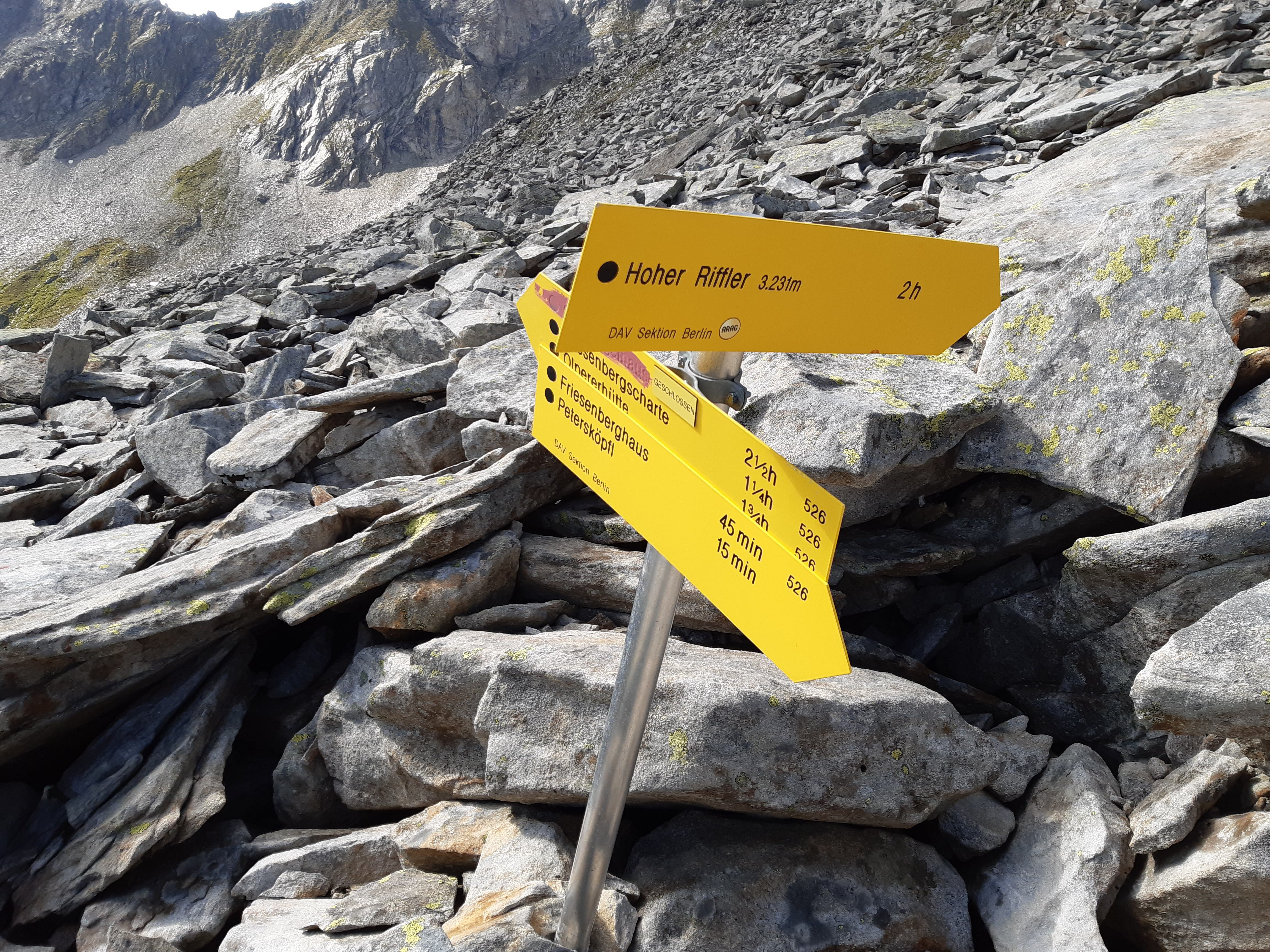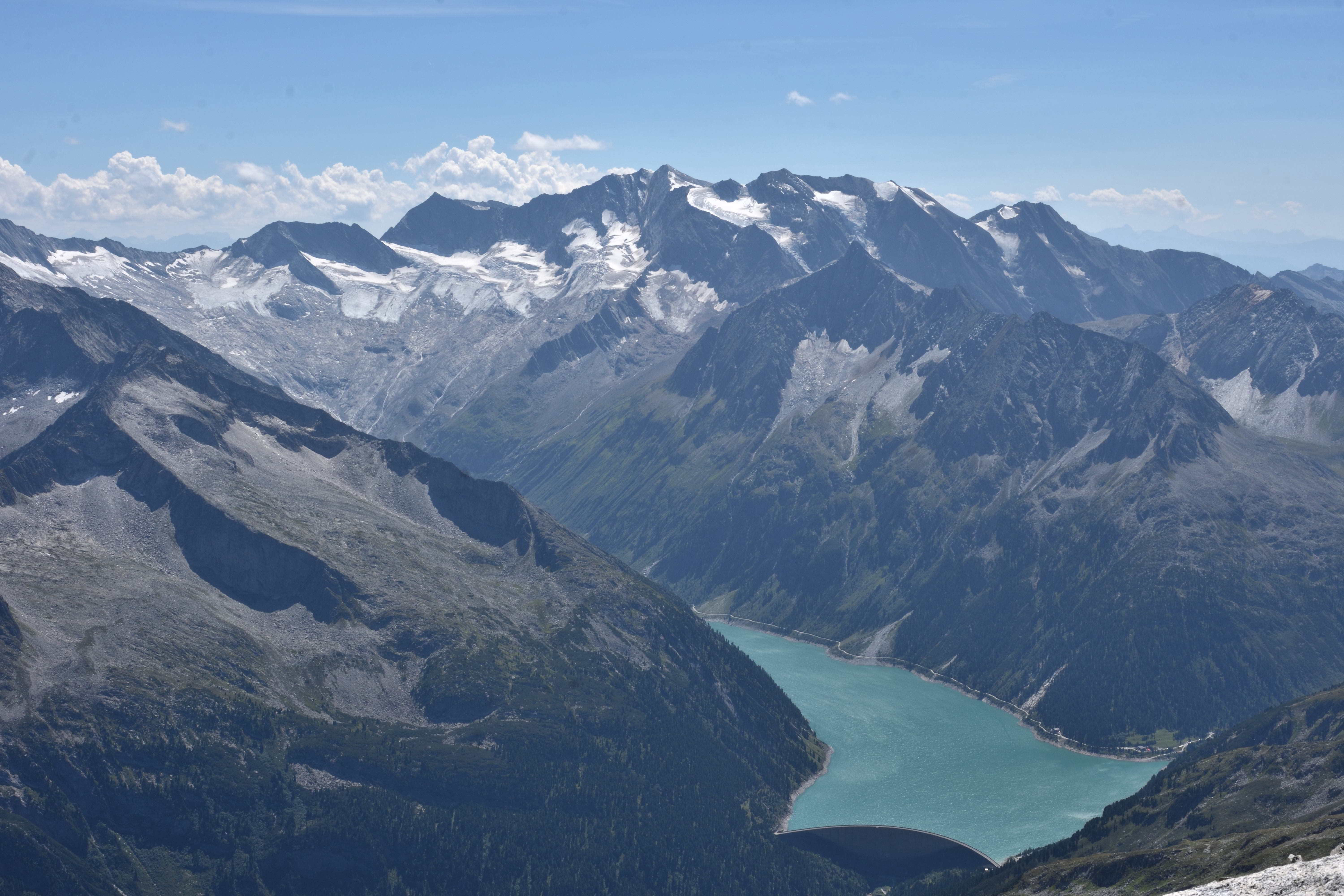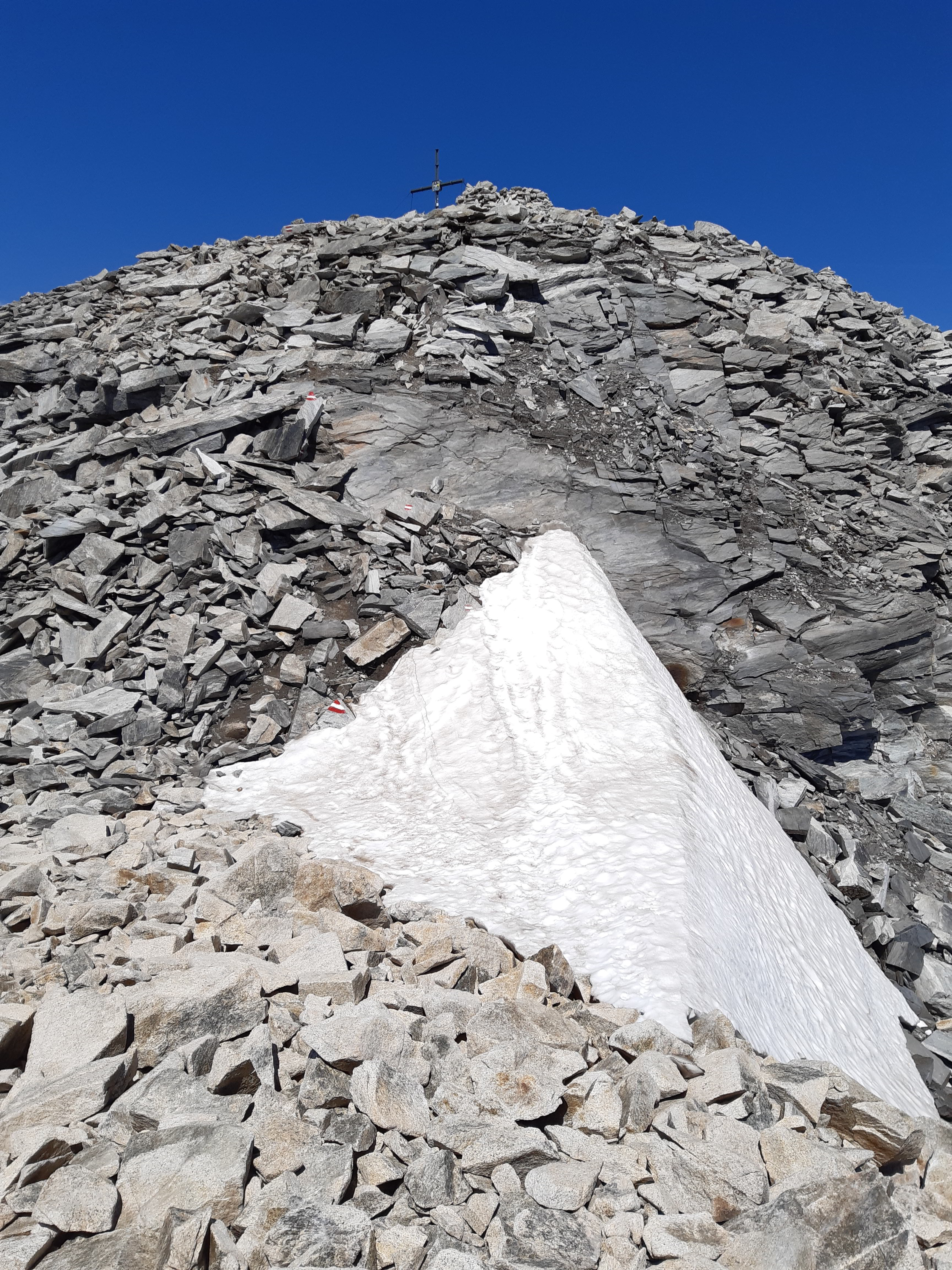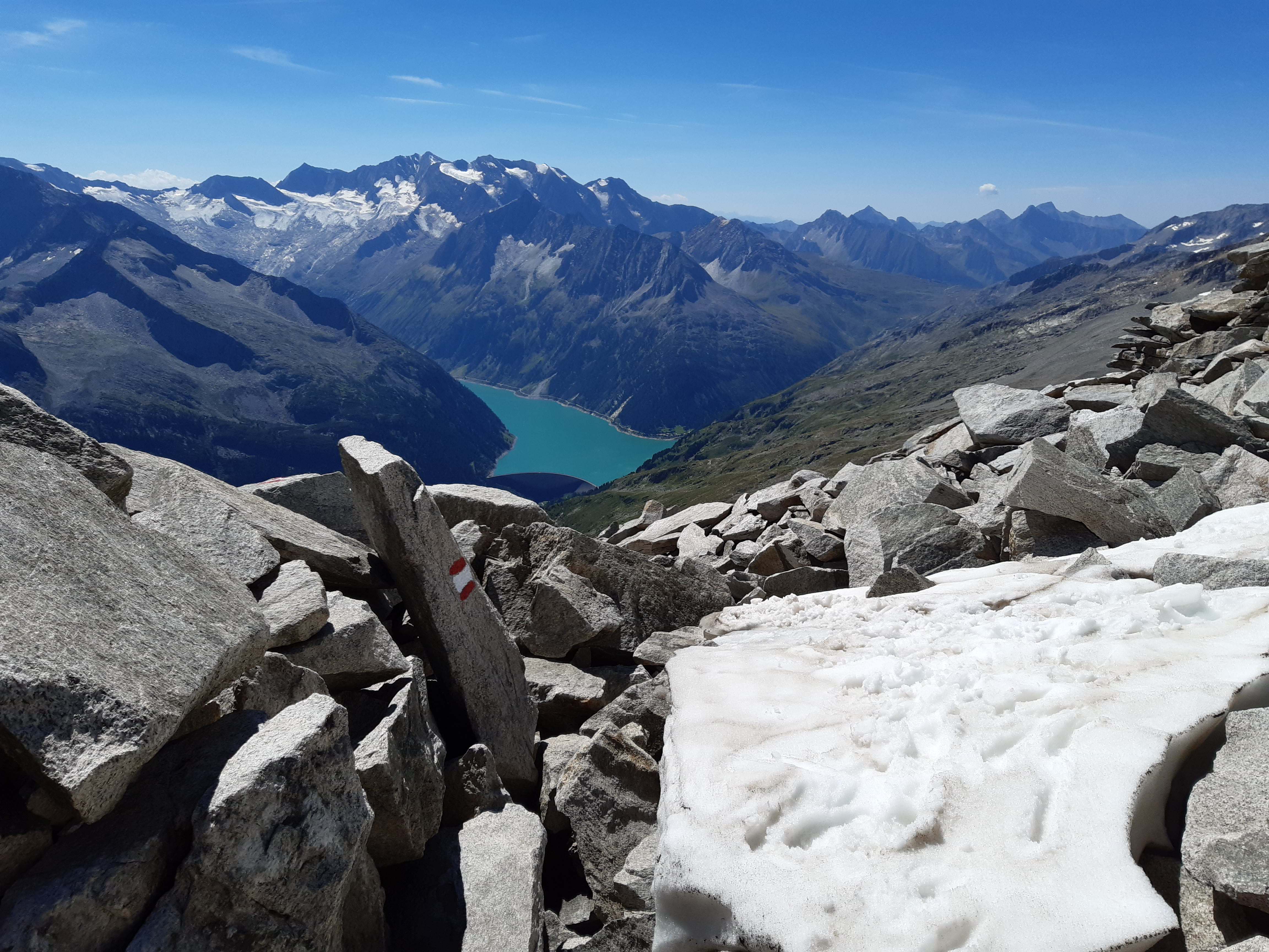 Von hier aus gehe ich der Beschilderung folgend eine mäßig steile Passage über großes Blockwerk hinauf zu einem Sattel, von dem aus ich links den Abzweig nehme. Rechts führt der Weg zum Petersköpfl. Es wird nochmals steiler und das Klettern über den Plattenschutt und das Blockwerk ist sehr anstrengend. Teilweise fällt es mir schwer die Markierungen zu sehen, aber es geht immer entlang des Gratrückens. Da ich mein Klettersteigset nicht dabei habe fehlen mir auch die Handschuhe. Der Fels ist sehr rau und meine Hände schmerzen bereits. Endlich erreiche ich den Südwestgrad und erkenne den Gipfel über mir. Durch eine leichte Senke geht es noch über ein Schneefeld zum letzten Anstieg. Am Gipfel mache ich eine ausgiebige Rast mit Brotzeit und genieße den fantastischen Ausblick. Für den Abstieg wähle ich die gleiche Route. Von oben finde ich die Wegmarkierungen leichter. Trotzdem ist der Abstieg bis zum Friesenberghaus fast ausschließlich über Plattenschutt und Blockwerk sehr anstrengend. Am Friesenberghaus gönne ich mir eine ausgiebige Rast mit einer kühlen Apfelschorle und einem großen Cappuccino. Gegen Abend erreiche ich dann den Parkplatz am Schlegeisspeicher.