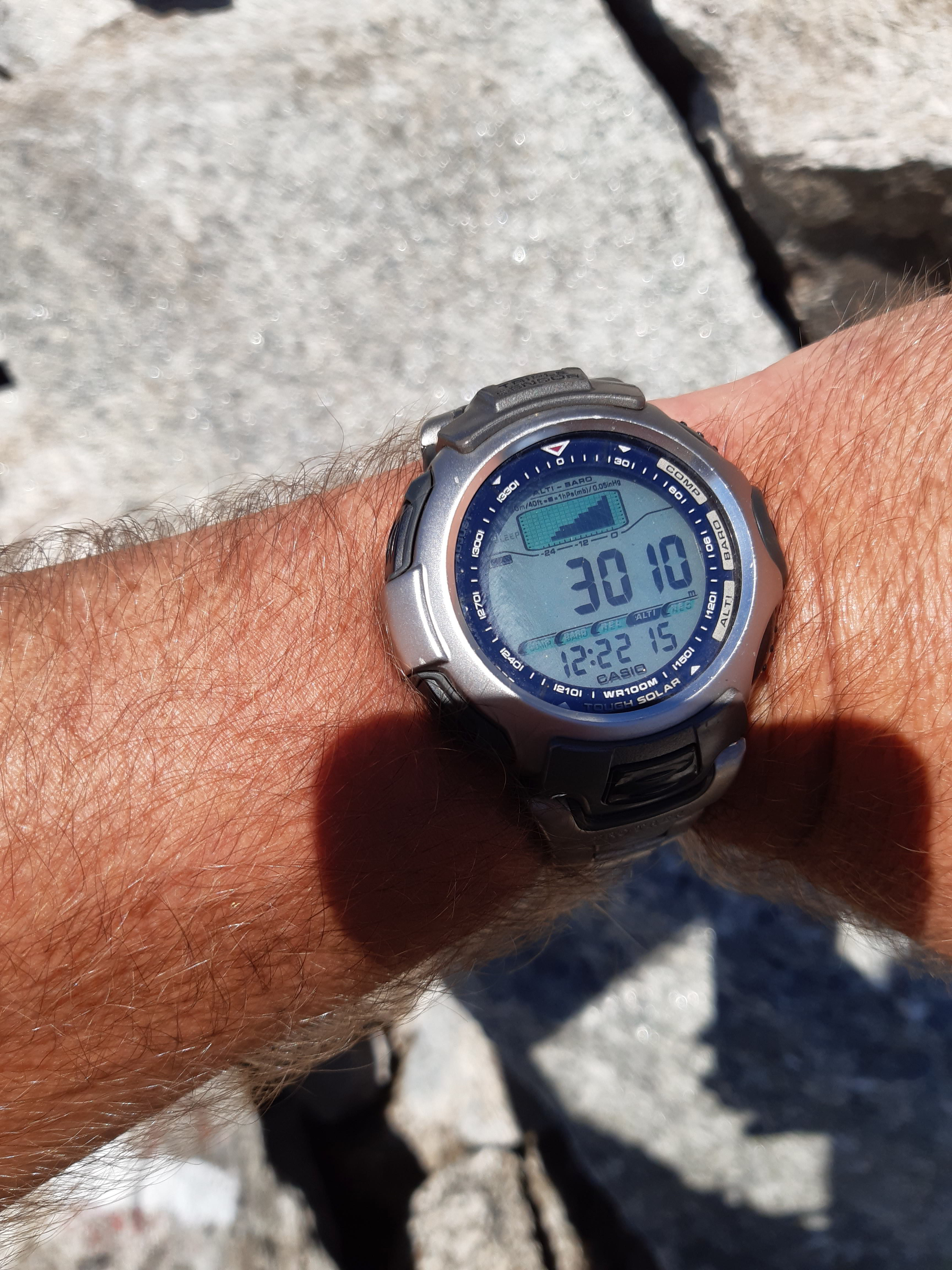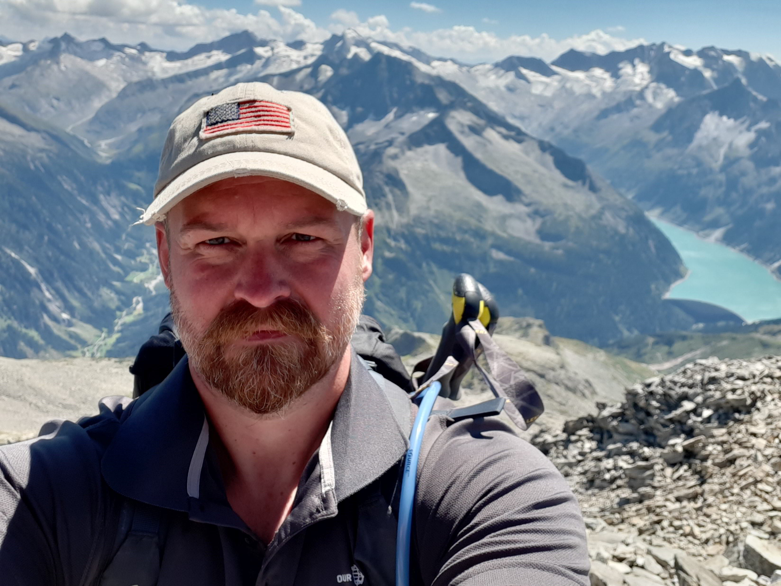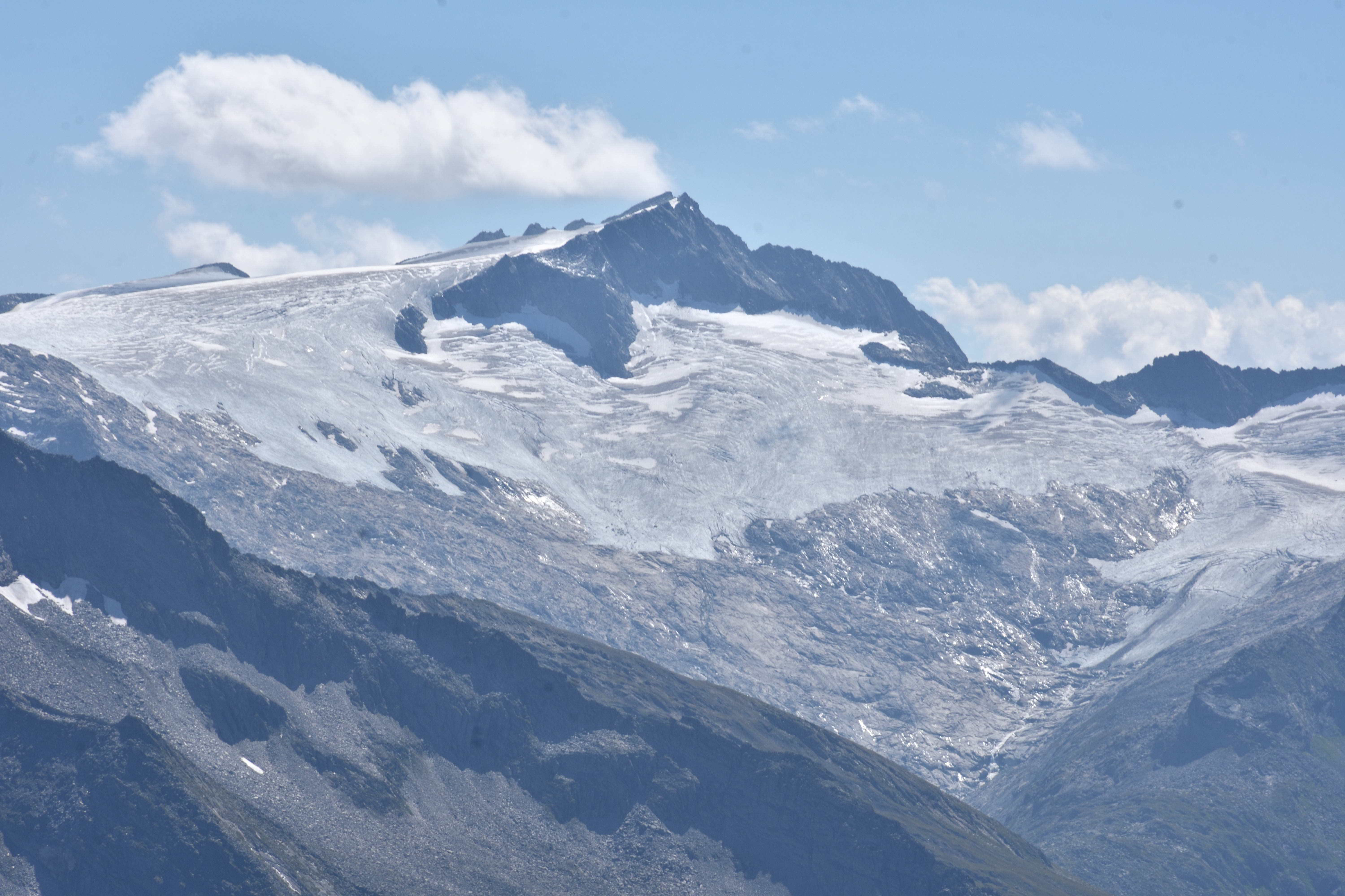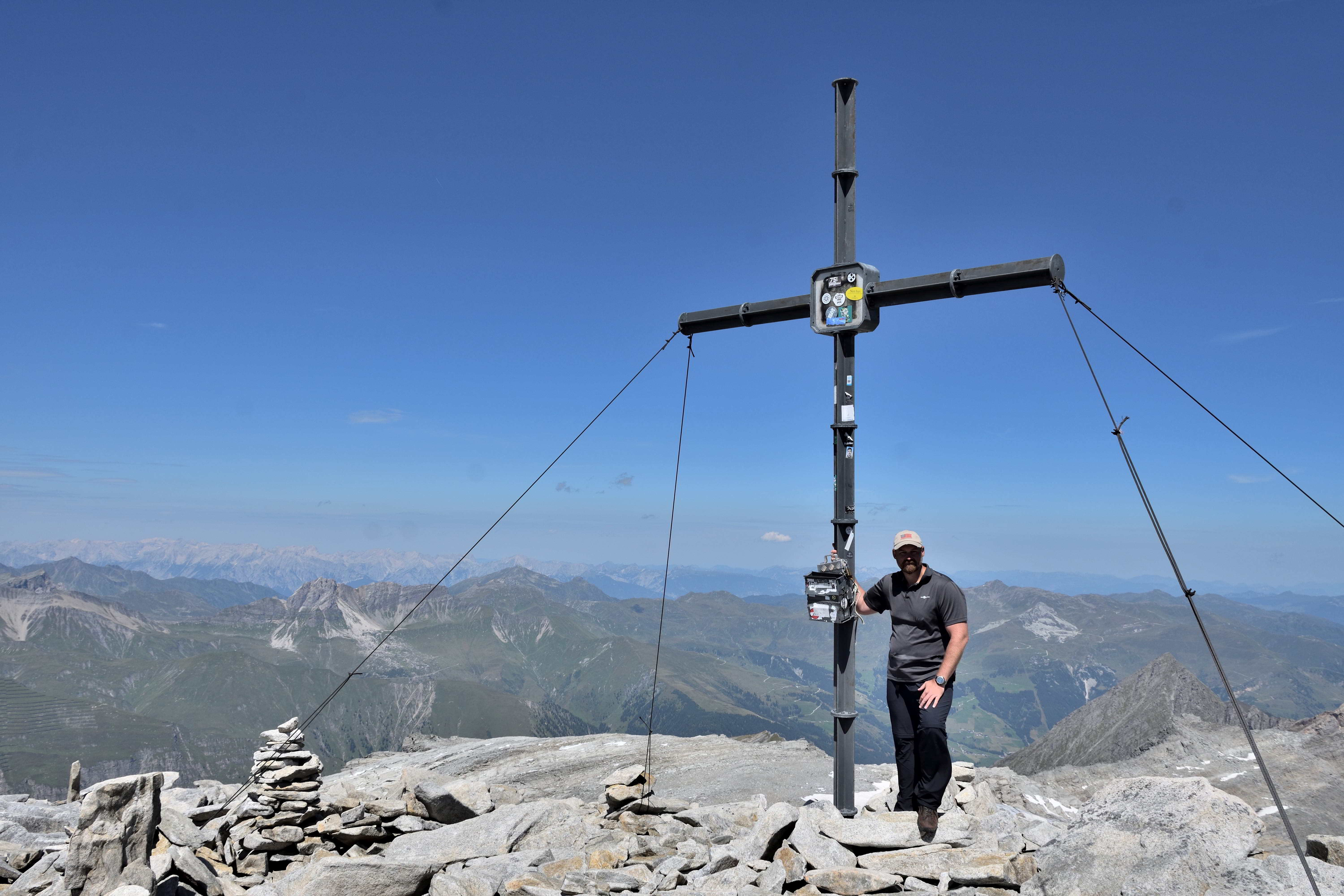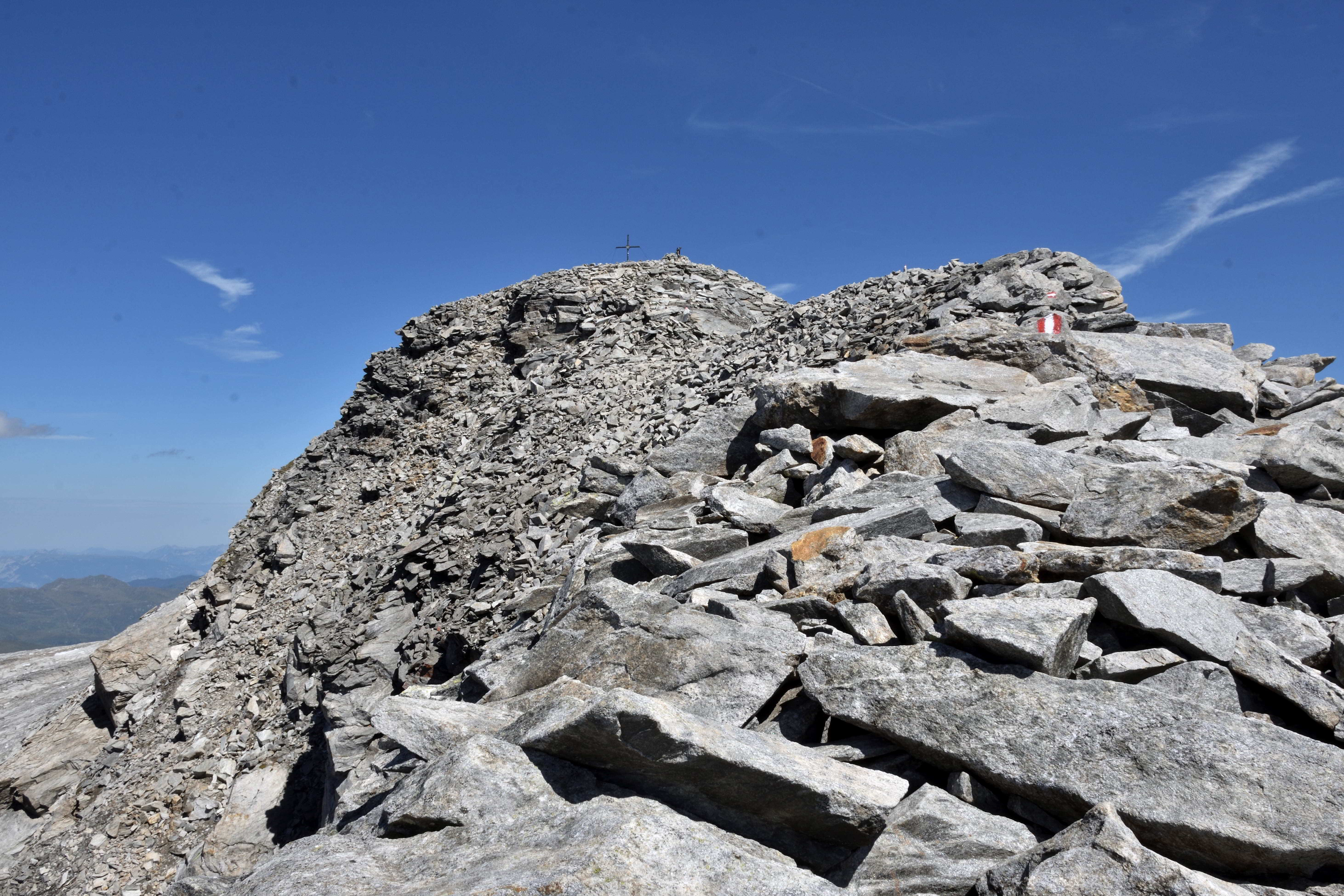 Von hier aus gehe ich der Beschilderung folgend eine mäßig steile Passage über großes Blockwerk hinauf zu einem Sattel, von dem aus ich links den Abzweig nehme. Rechts führt der Weg zum Petersköpfl. Es wird nochmals steiler und das Klettern über den Plattenschutt und das Blockwerk ist sehr anstrengend. Teilweise fällt es mir schwer die Markierungen zu sehen, aber es geht immer entlang des Gratrückens. Da ich mein Klettersteigset nicht dabei habe fehlen mir auch die Handschuhe. Der Fels ist sehr rau und meine Hände schmerzen bereits. Endlich erreiche ich den Südwestgrad und erkenne den Gipfel über mir. Durch eine leichte Senke geht es noch über ein Schneefeld zum letzten Anstieg. Am Gipfel mache ich eine ausgiebige Rast mit Brotzeit und genieße den fantastischen Ausblick. Für den Abstieg wähle ich die gleiche Route. Von oben finde ich die Wegmarkierungen leichter. Trotzdem ist der Abstieg bis zum Friesenberghaus fast ausschließlich über Plattenschutt und Blockwerk sehr anstrengend. Am Friesenberghaus gönne ich mir eine ausgiebige Rast mit einer kühlen Apfelschorle und einem großen Cappuccino. Gegen Abend erreiche ich dann den Parkplatz am Schlegeisspeicher.