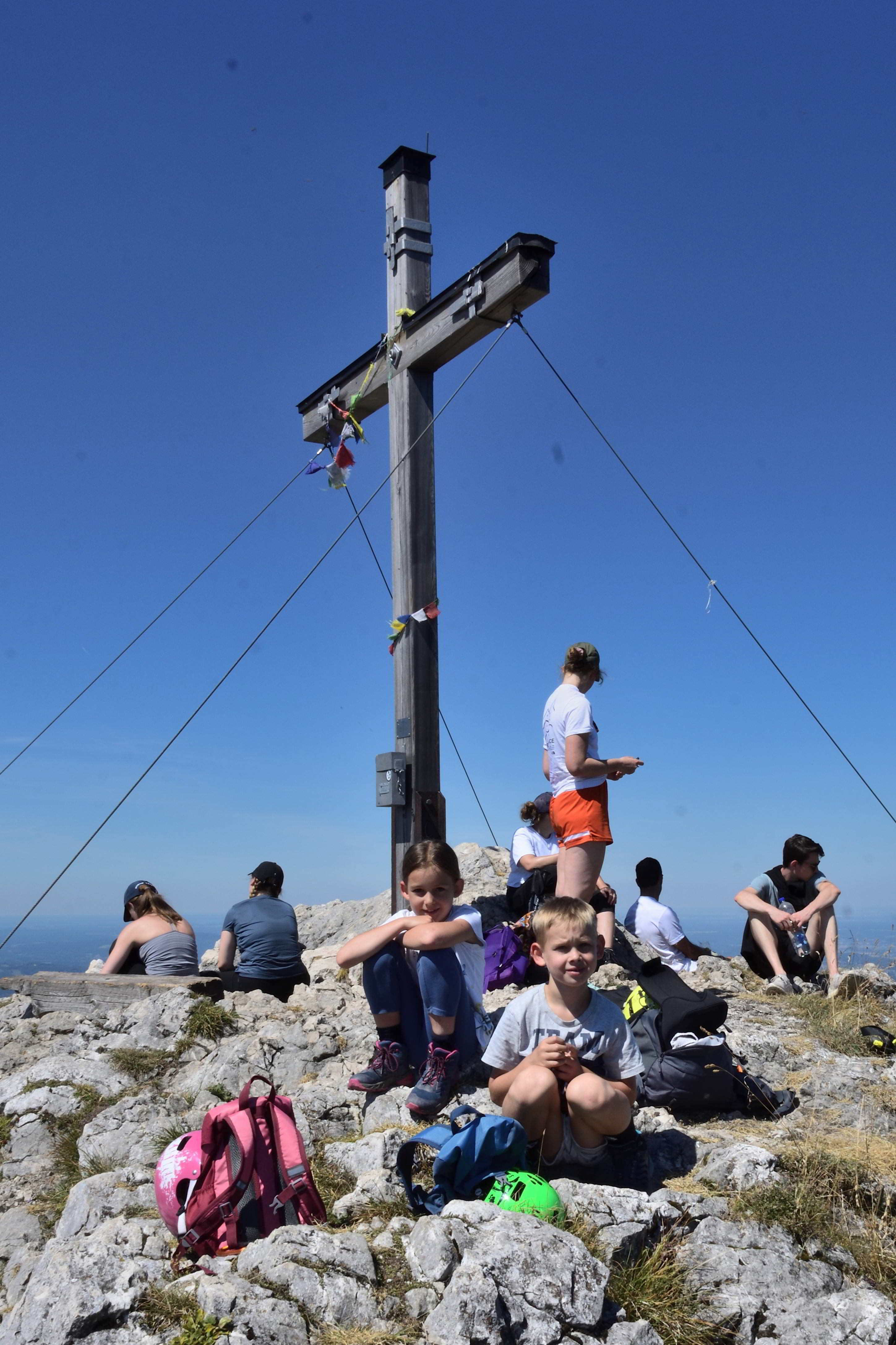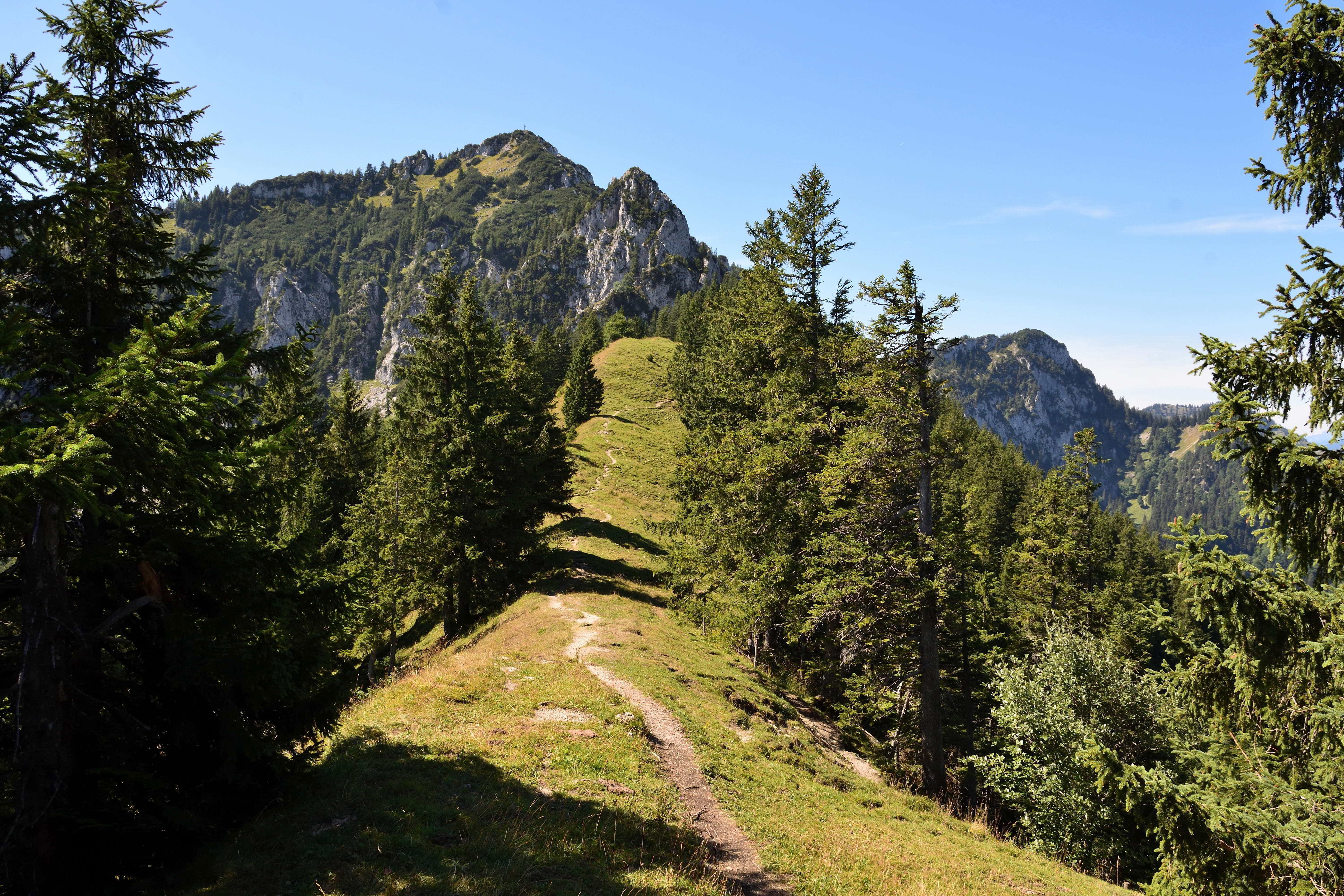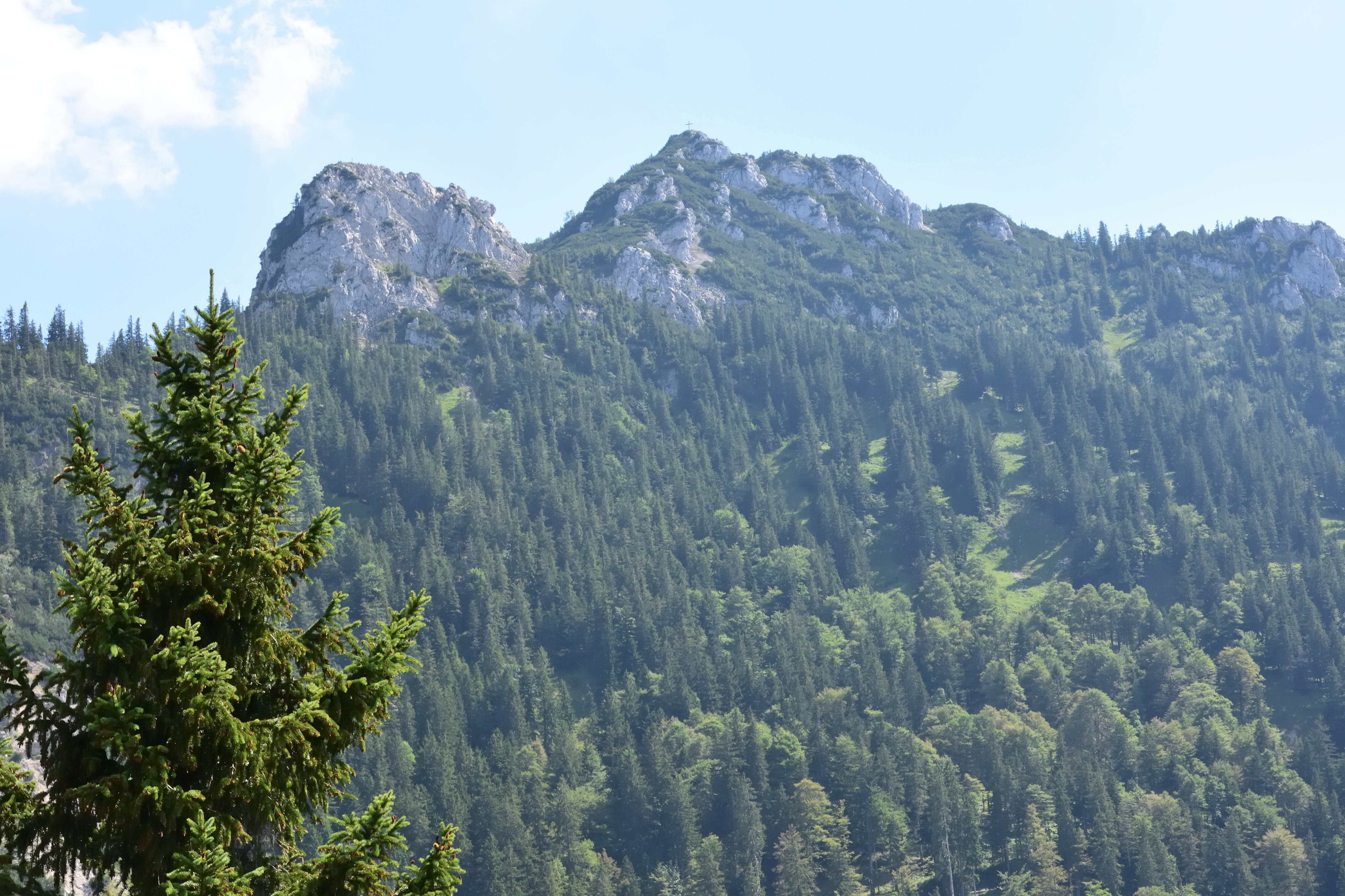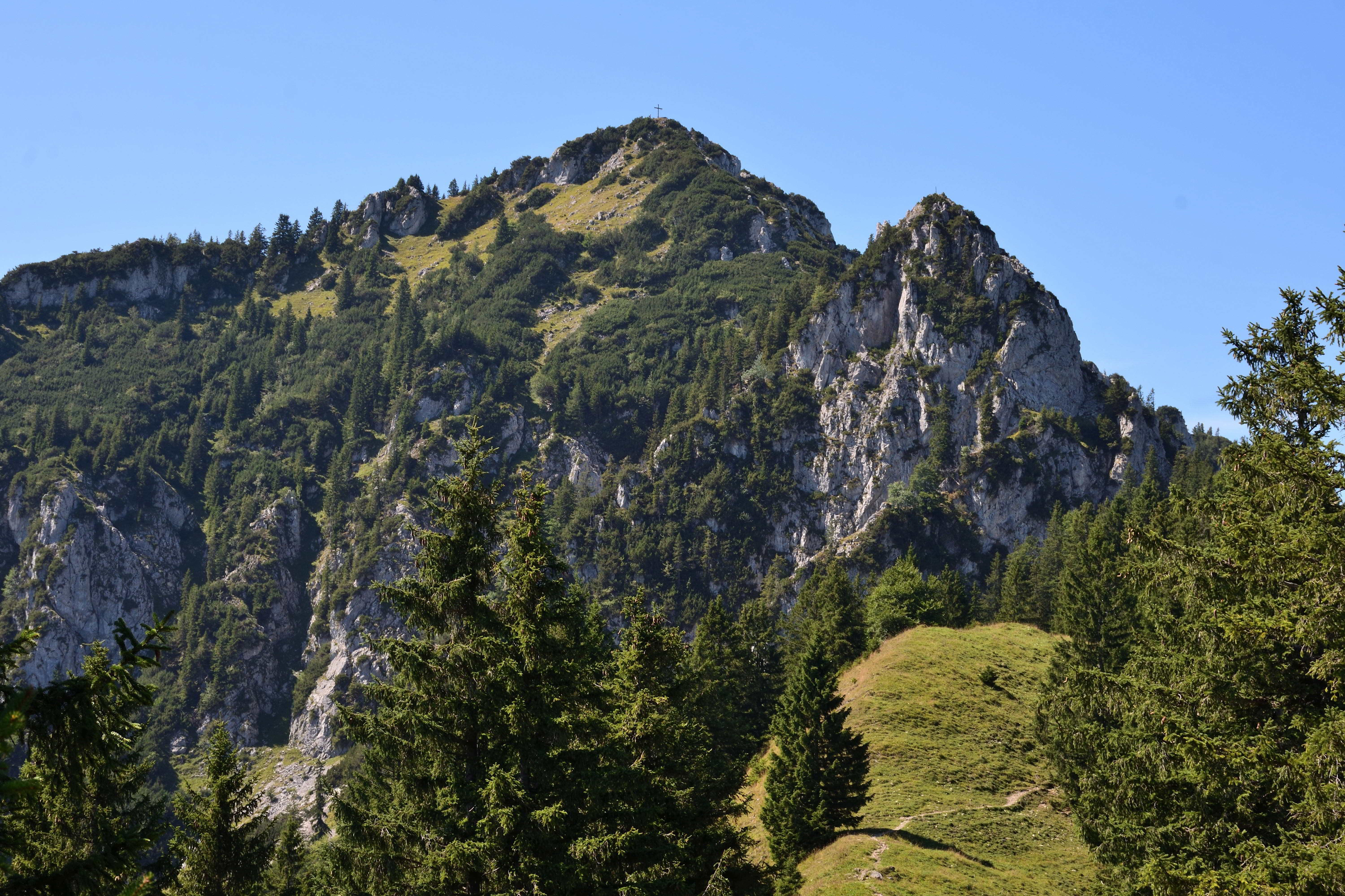 Nach der Stärkung geht es für uns auf dem beschilderten Weg Richtung Hochsaalwand, einen kleinen Steig steil bergab, bevor es über einen leichten (Alm-) Grat in den Wald hinein geht. Der Weg ist steinig und es geht über Wurzeln immer steiler bergauf. Vorbei am Lechnerköpfl führt uns der Weg eine kleine Lichtung hinauf, wo der Einstieg in den drahtseilgesicherten Steig beginnt. Der Steig ist teils recht steil, aber problemlos zu meistern und führt nun durch einen Latschenhain. Am Ende des Steigs angekommen folgen wir dem Weg nach links zum Gipfelkreuz. Hier genießen wir bei einer Rast nochmal die herrliche Aussicht, diesmal hinüber zur Soinwand, dem Wildalpjoch, dem Wendelstein und dem Breitenstein.