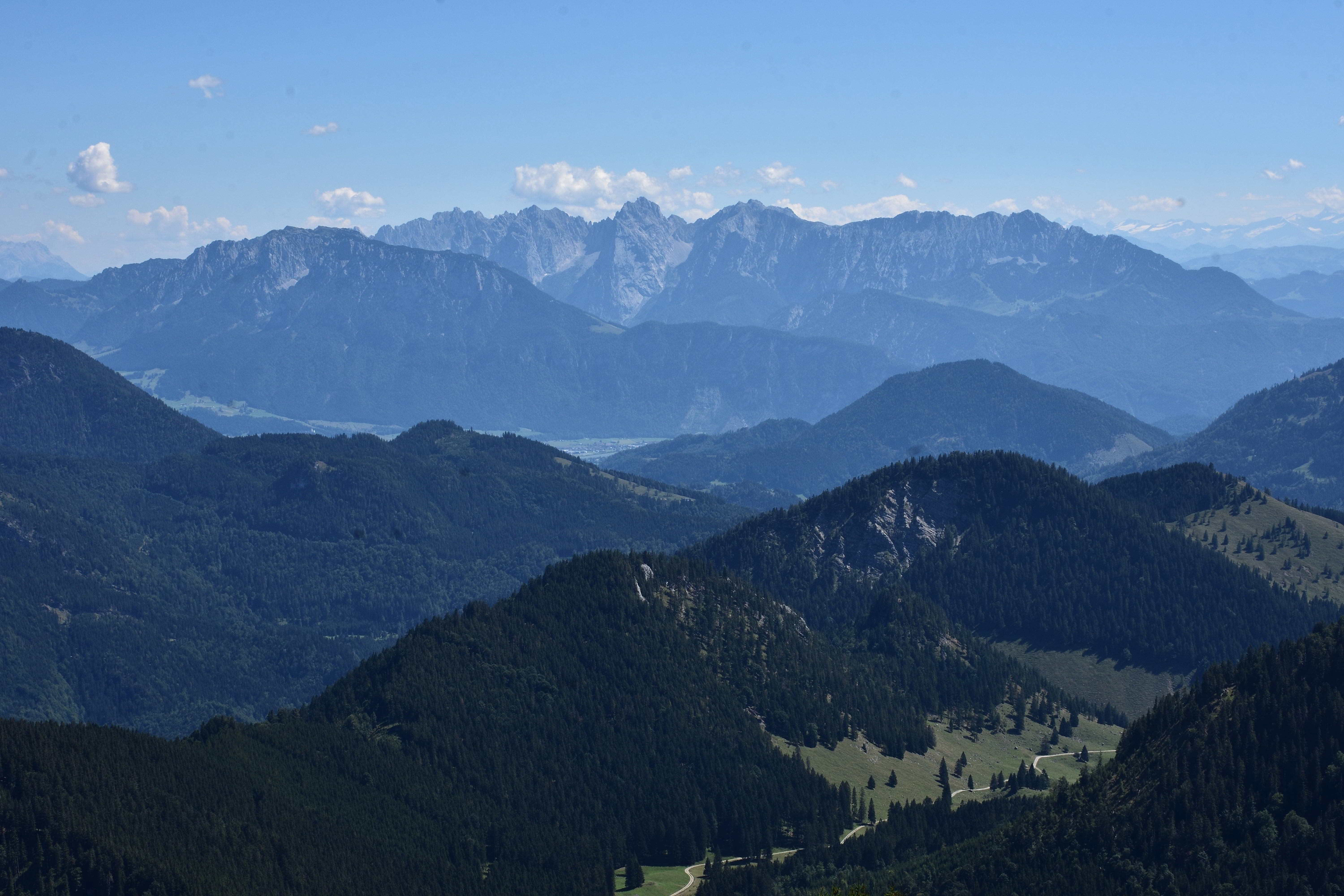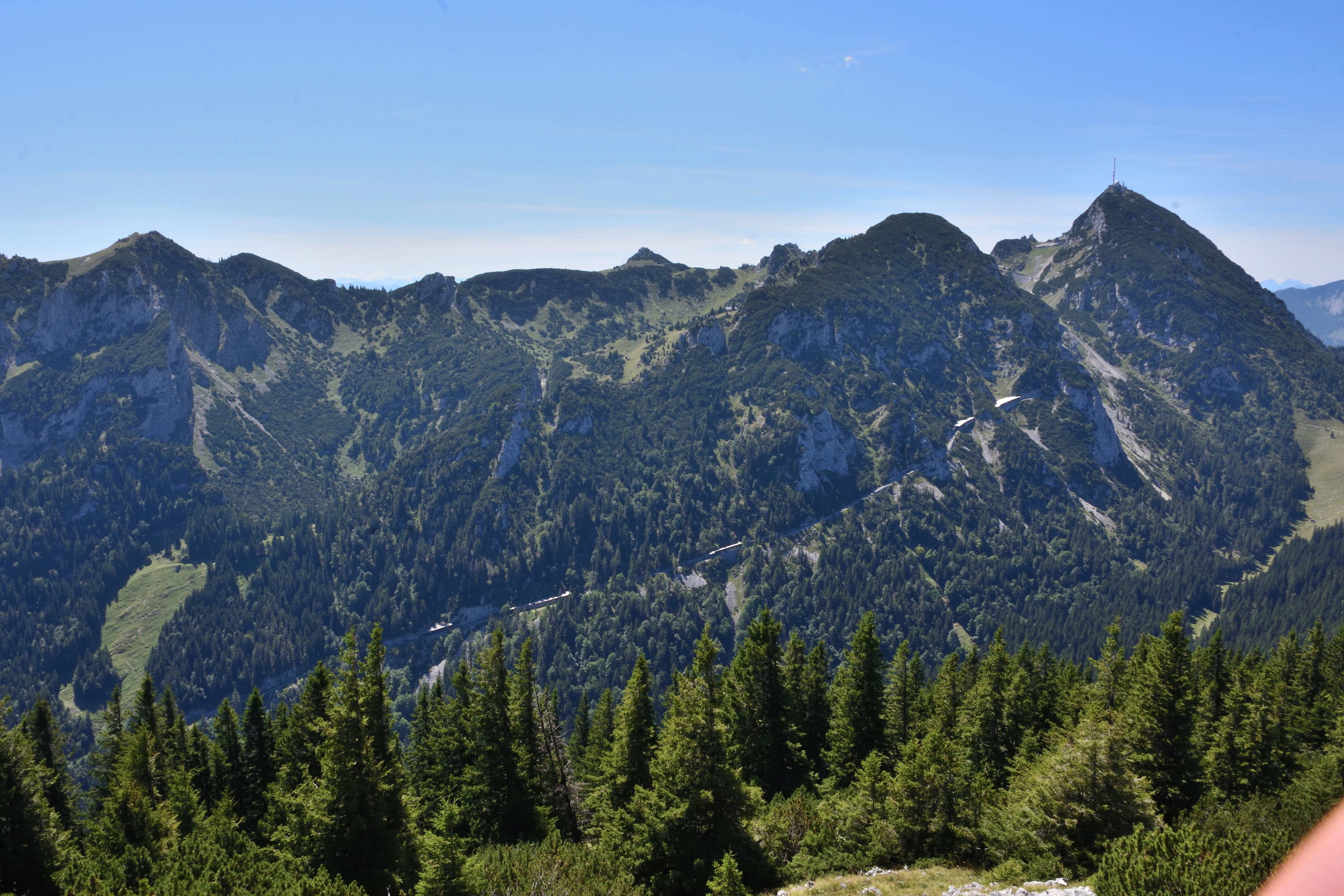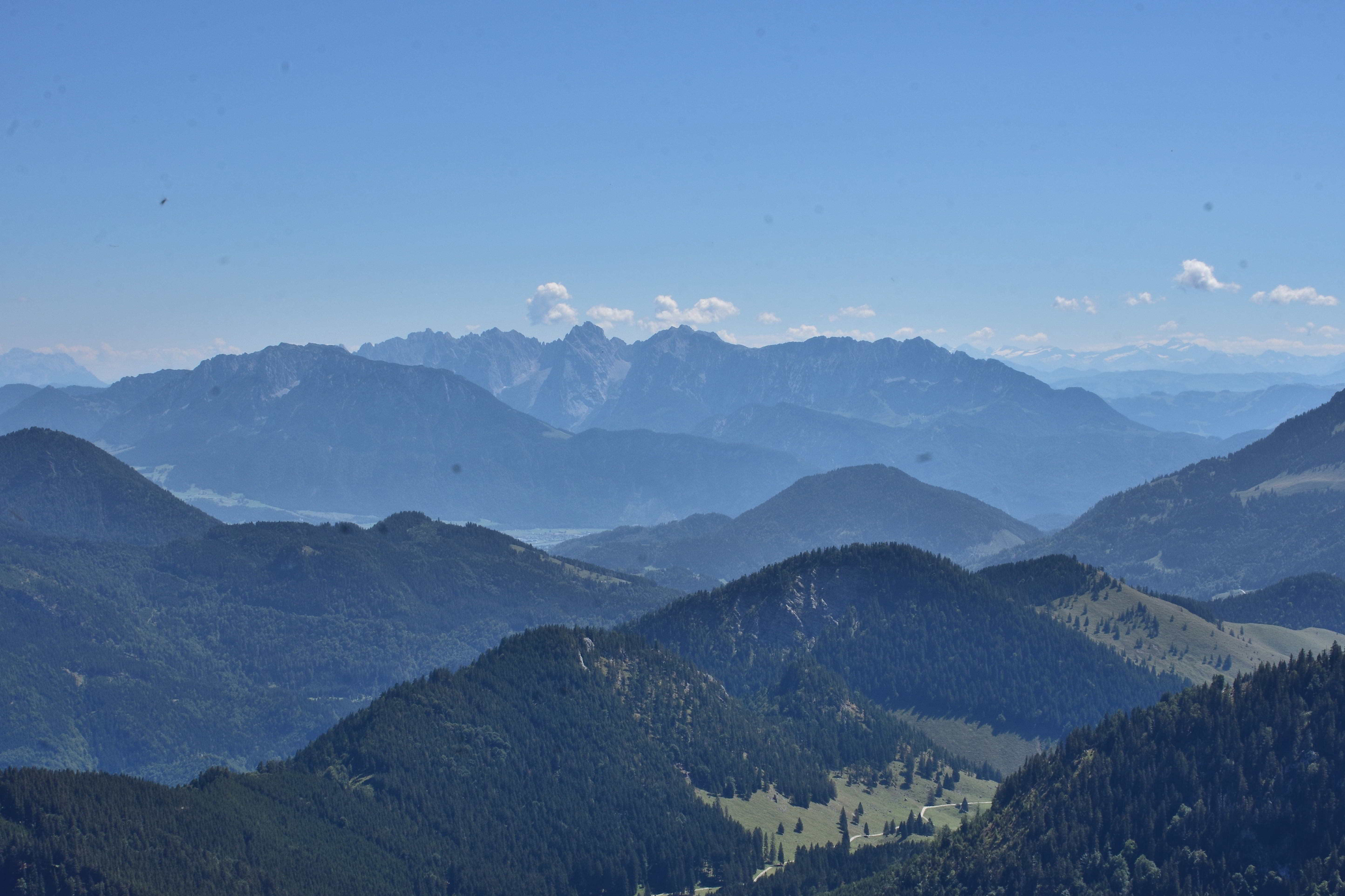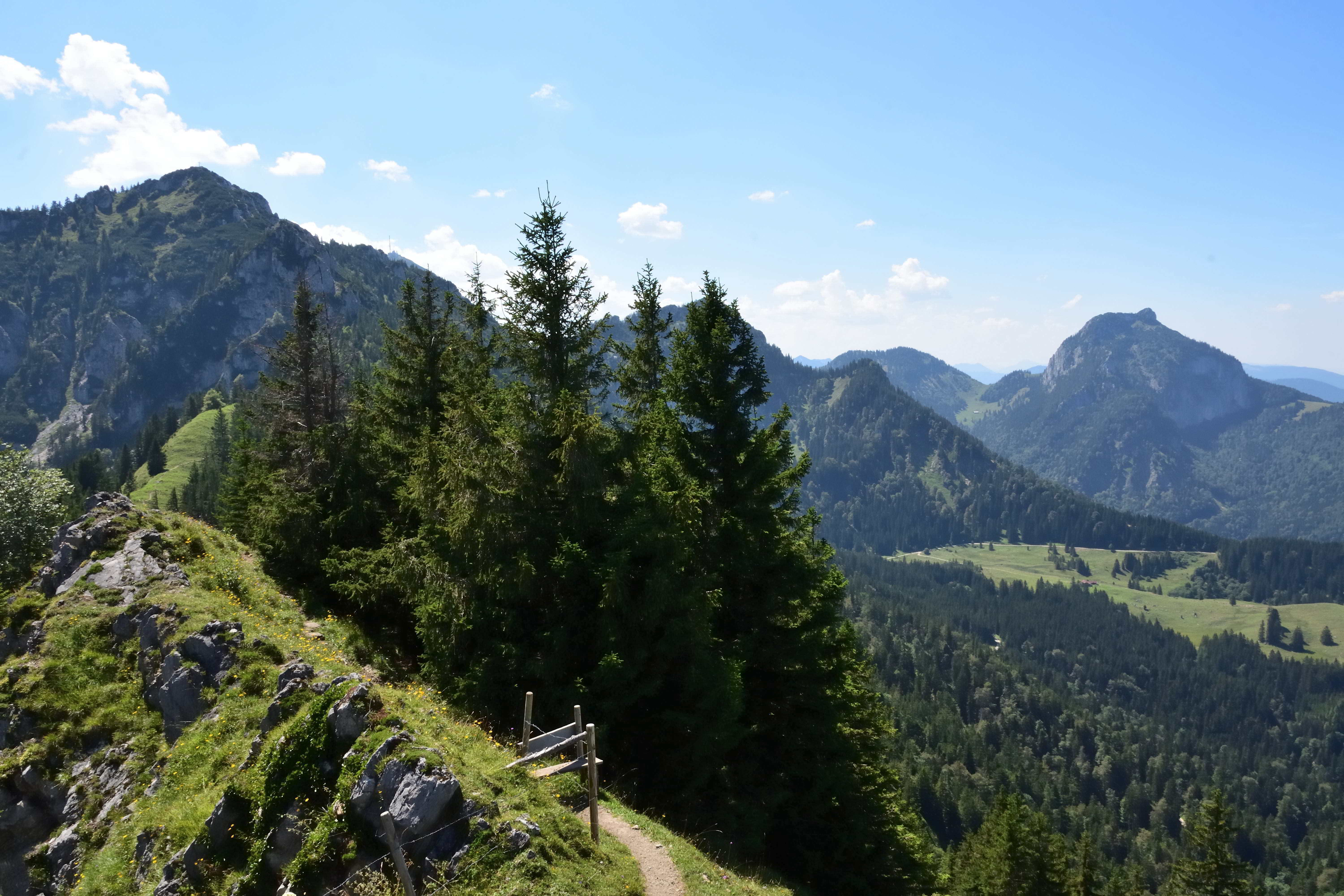 Nach der Stärkung geht es für uns auf dem beschilderten Weg Richtung Hochsaalwand, einen kleinen Steig steil bergab, bevor es über einen leichten (Alm-) Grat in den Wald hinein geht. Der Weg ist steinig und es geht über Wurzeln immer steiler bergauf. Vorbei am Lechnerköpfl führt uns der Weg eine kleine Lichtung hinauf, wo der Einstieg in den drahtseilgesicherten Steig beginnt. Der Steig ist teils recht steil, aber problemlos zu meistern und führt nun durch einen Latschenhain. Am Ende des Steigs angekommen folgen wir dem Weg nach links zum Gipfelkreuz. Hier genießen wir bei einer Rast nochmal die herrliche Aussicht, diesmal hinüber zur Soinwand, dem Wildalpjoch, dem Wendelstein und dem Breitenstein.