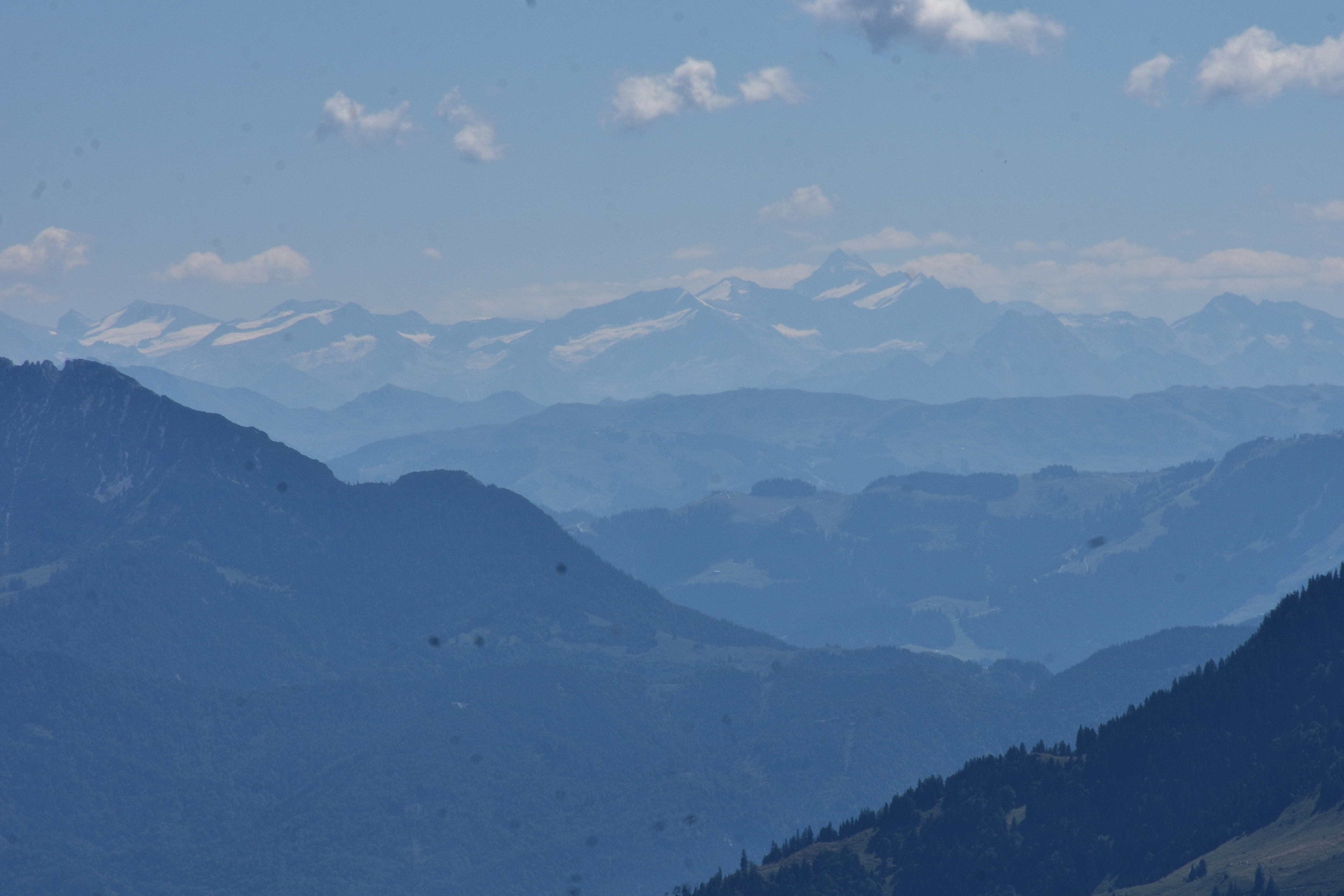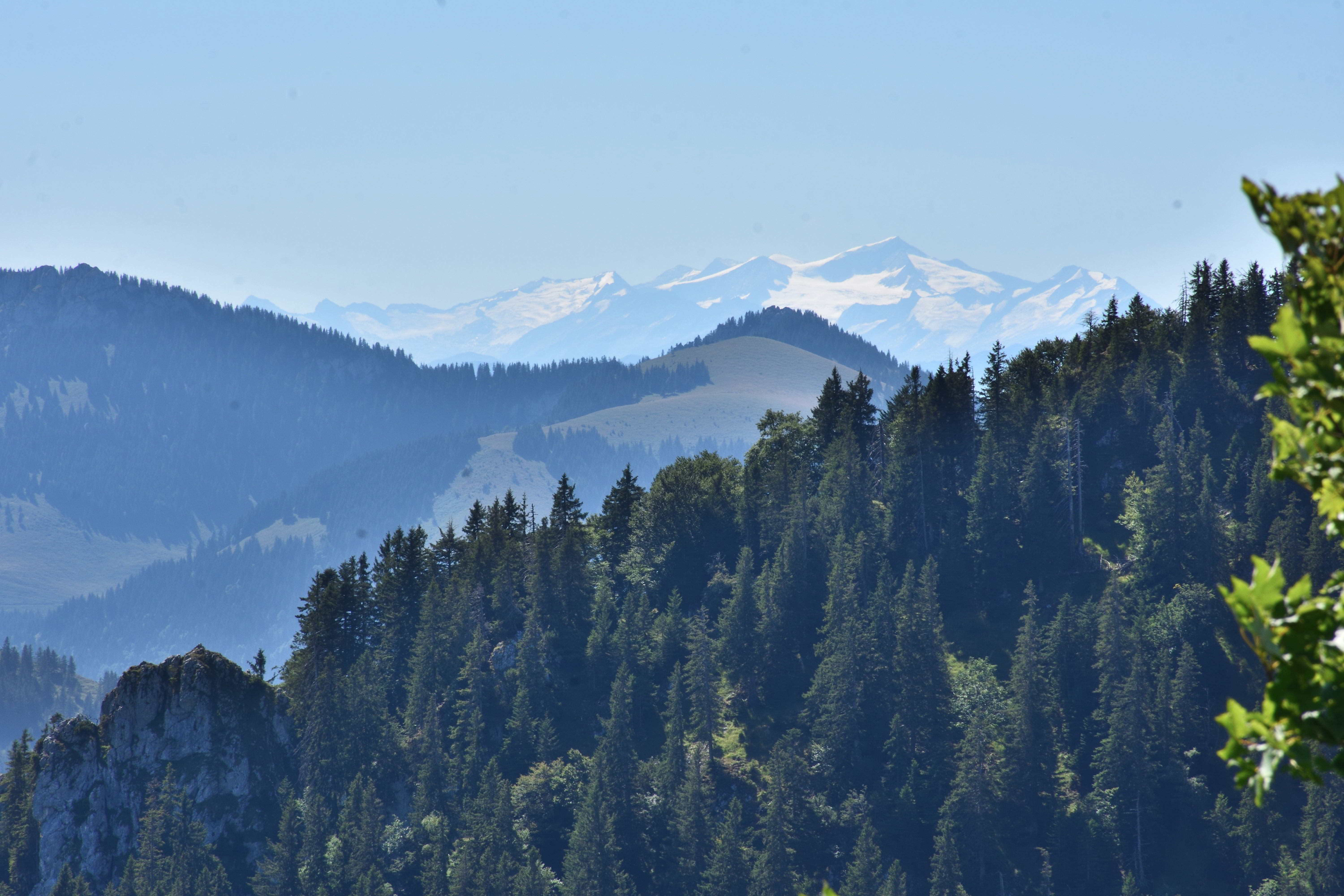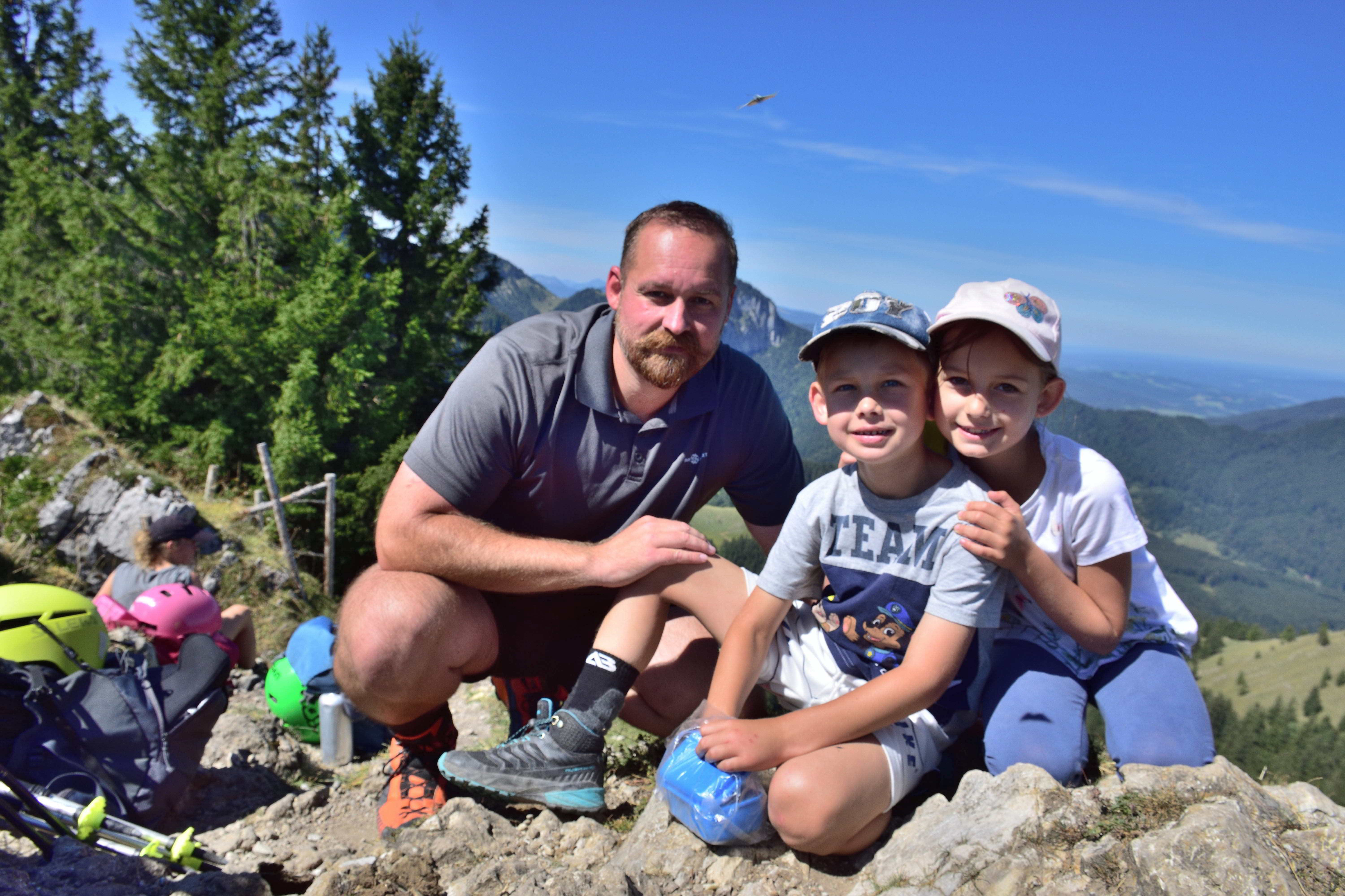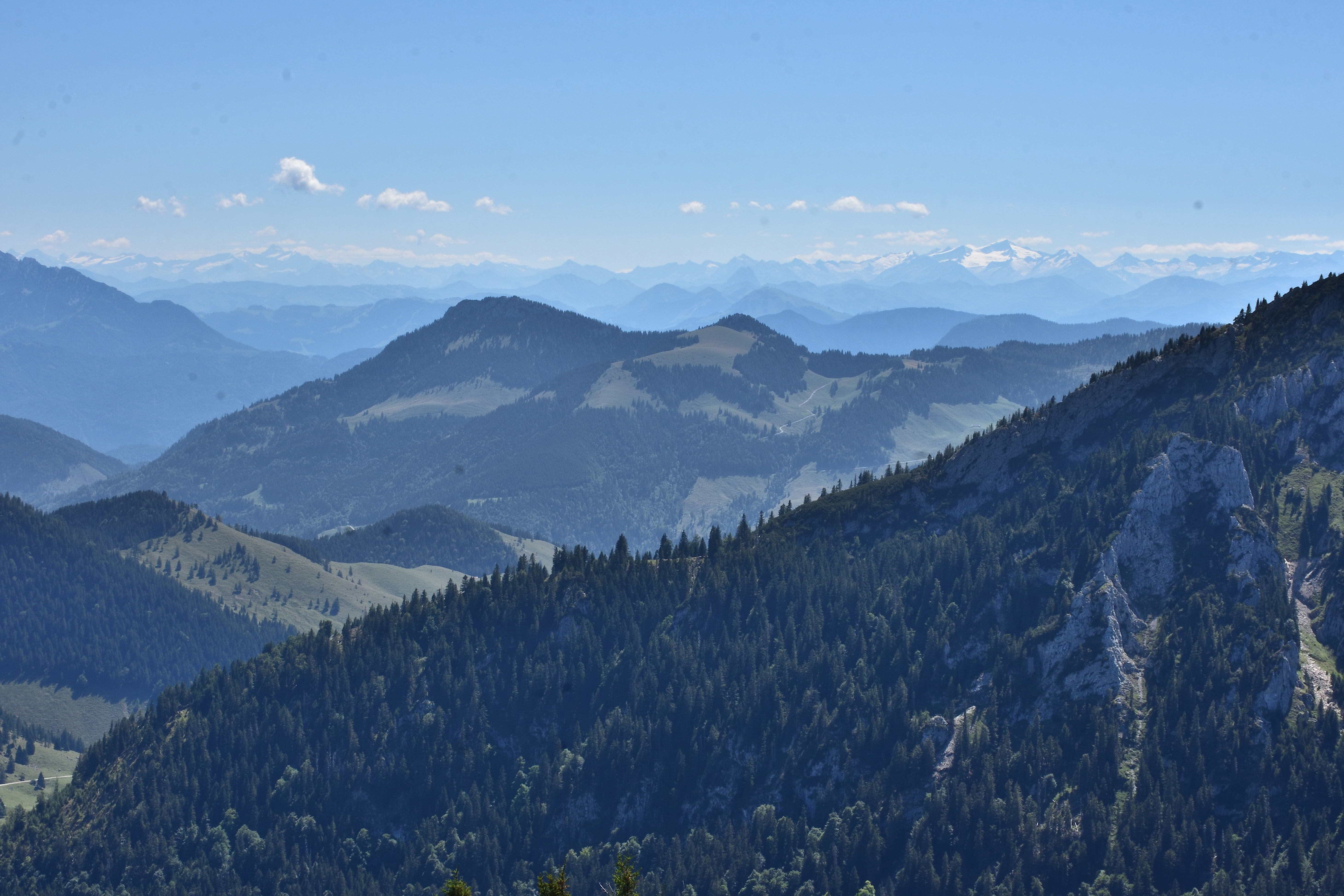 Nach der Stärkung geht es für uns auf dem beschilderten Weg Richtung Hochsaalwand, einen kleinen Steig steil bergab, bevor es über einen leichten (Alm-) Grat in den Wald hinein geht. Der Weg ist steinig und es geht über Wurzeln immer steiler bergauf. Vorbei am Lechnerköpfl führt uns der Weg eine kleine Lichtung hinauf, wo der Einstieg in den drahtseilgesicherten Steig beginnt. Der Steig ist teils recht steil, aber problemlos zu meistern und führt nun durch einen Latschenhain. Am Ende des Steigs angekommen folgen wir dem Weg nach links zum Gipfelkreuz. Hier genießen wir bei einer Rast nochmal die herrliche Aussicht, diesmal hinüber zur Soinwand, dem Wildalpjoch, dem Wendelstein und dem Breitenstein.