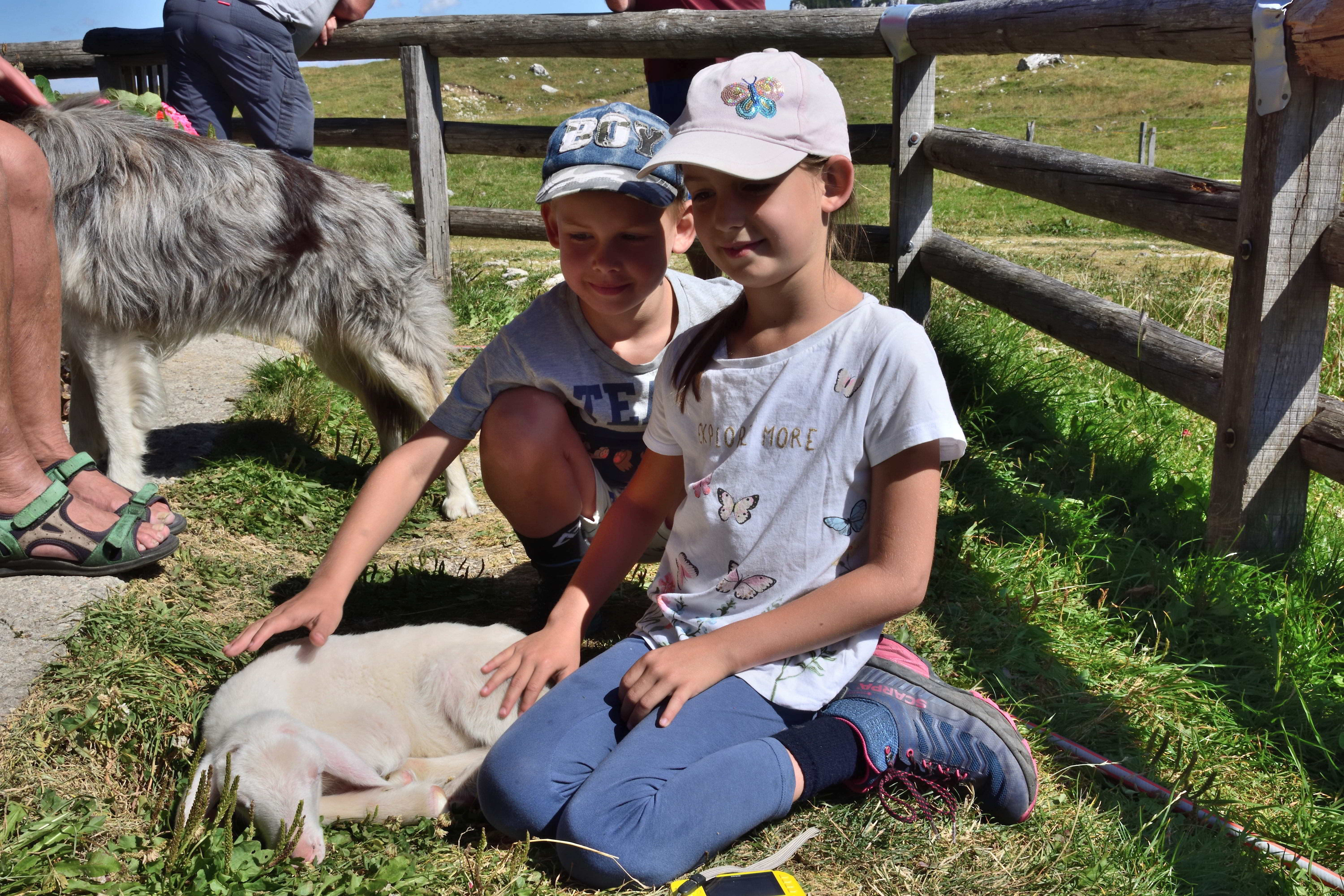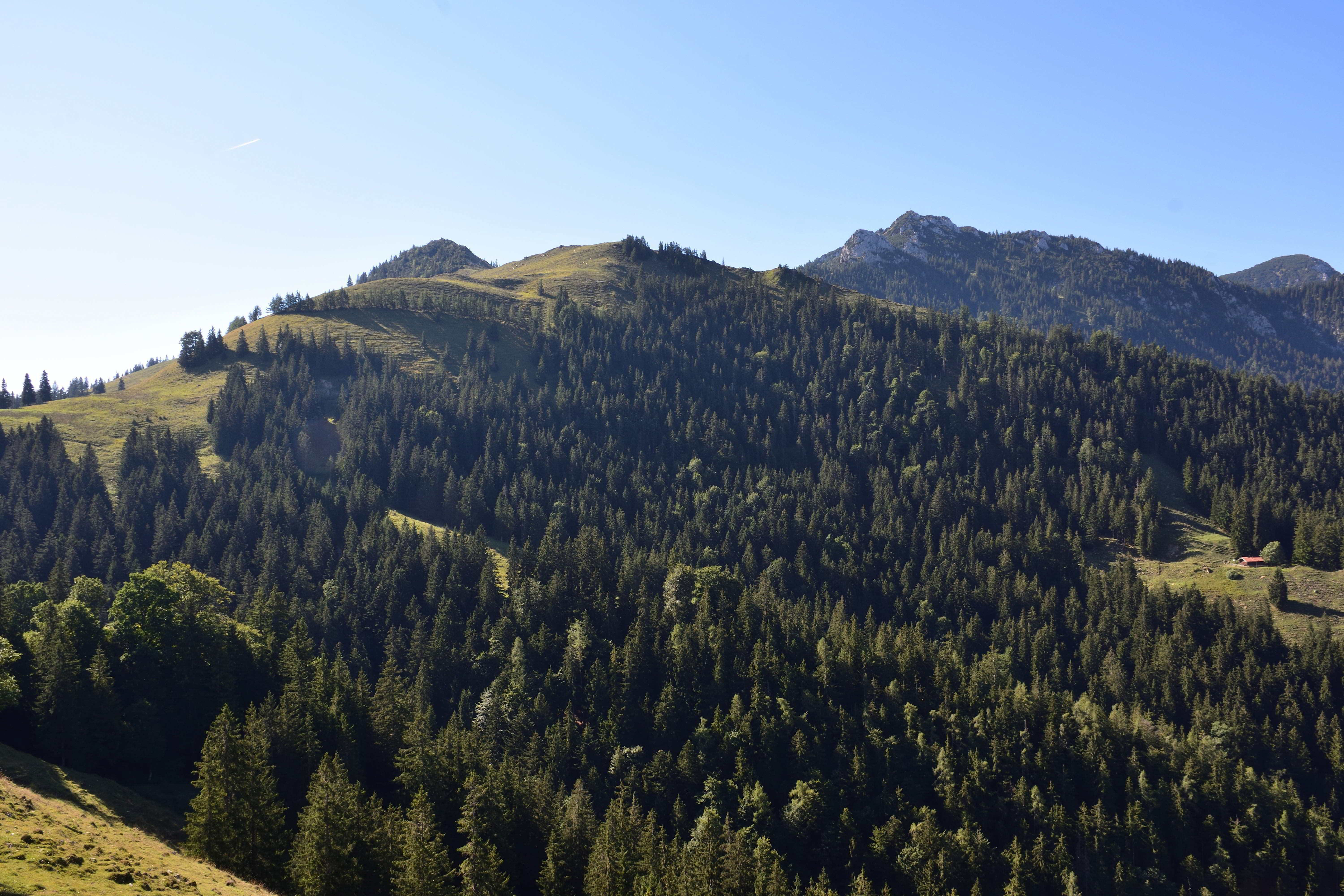 Zum Abstieg wählen wir die Route über die Reindler Alm. Ein kurzes Stück geht es auf gleichem Weg zurück. Wir lassen den Steig rechts liegen und folgen dem Weg leicht absteigend. Es geht durch ein Waldstück, an einem Hang entlang und noch ein Stück über Almwiesen bis zur Hütte der Reindler Alm. Im Sommer kann man hier kühle Getränke und eine kleine Brotzeit bekommen und dabei den herrlichen Ausblick auf den Wendelstein genießen. Sehr angenehm – und als wir dort sind können die Kinder noch ein kleines Lämmchen bestaunen. Wer noch die Kondition hat, kann von hieraus noch den Wendelstein besteigen, was ich auch schon einige Male getan habe. Aber für die Kinder ist die Tour ausreichend und wir machen uns an den Abstieg.