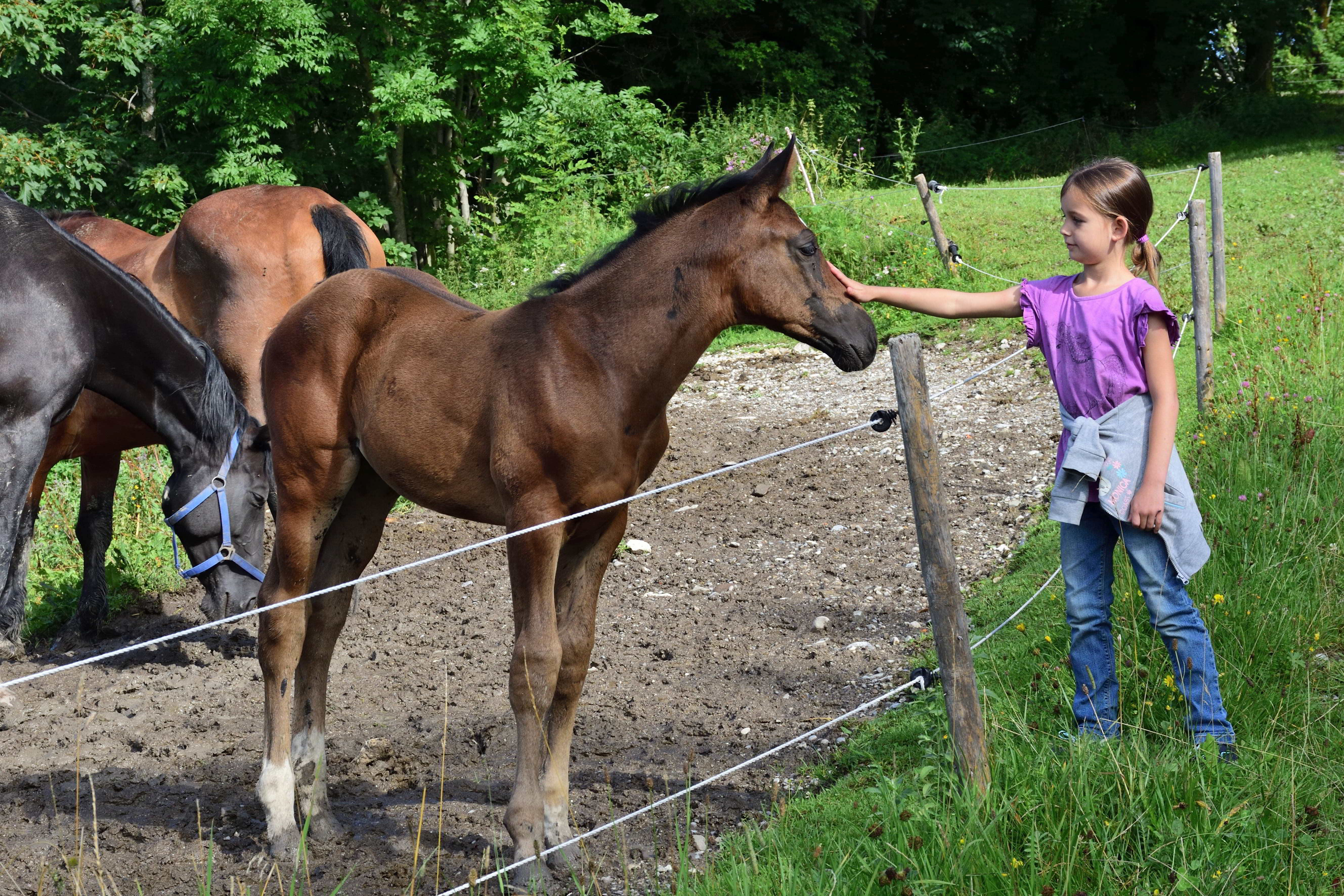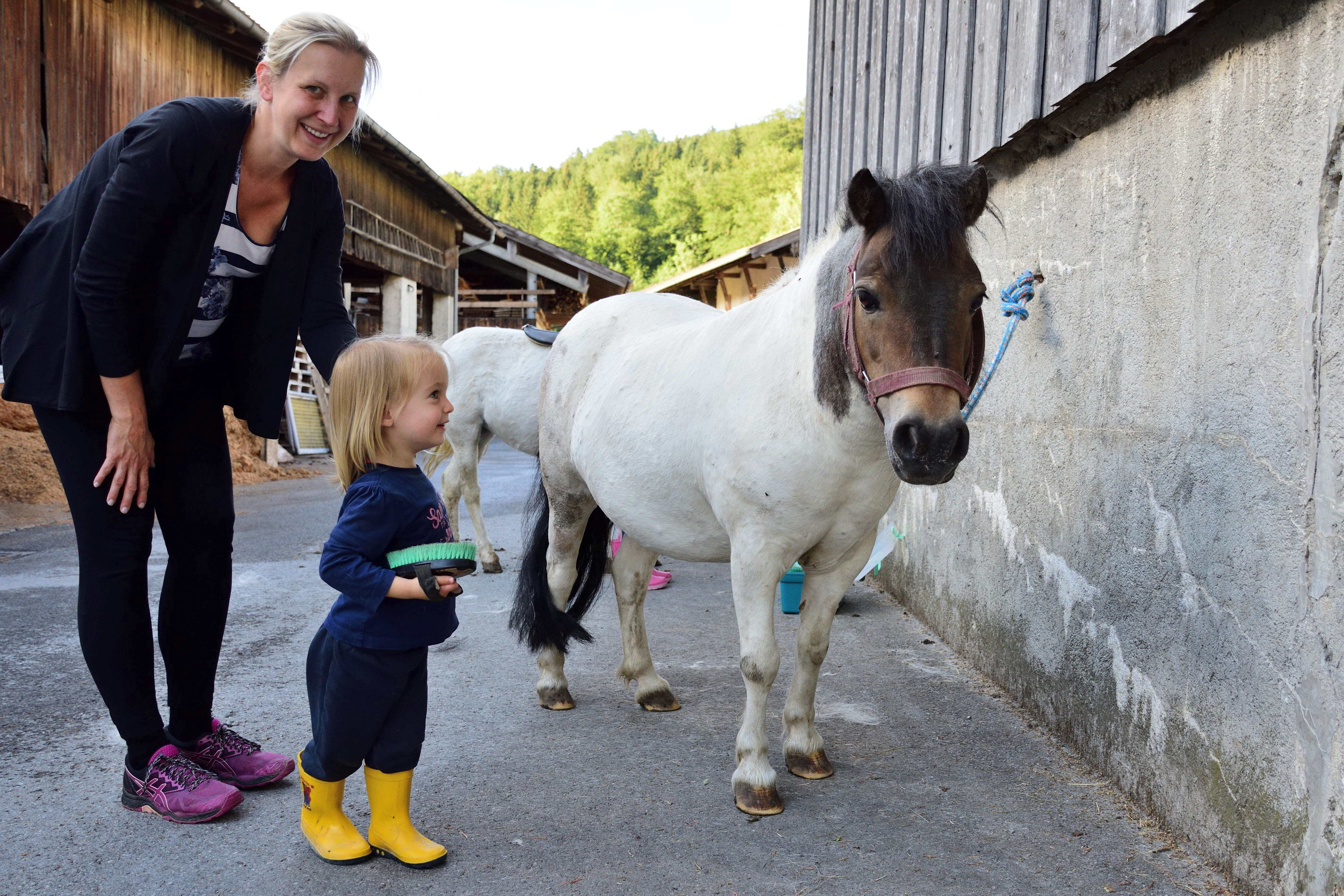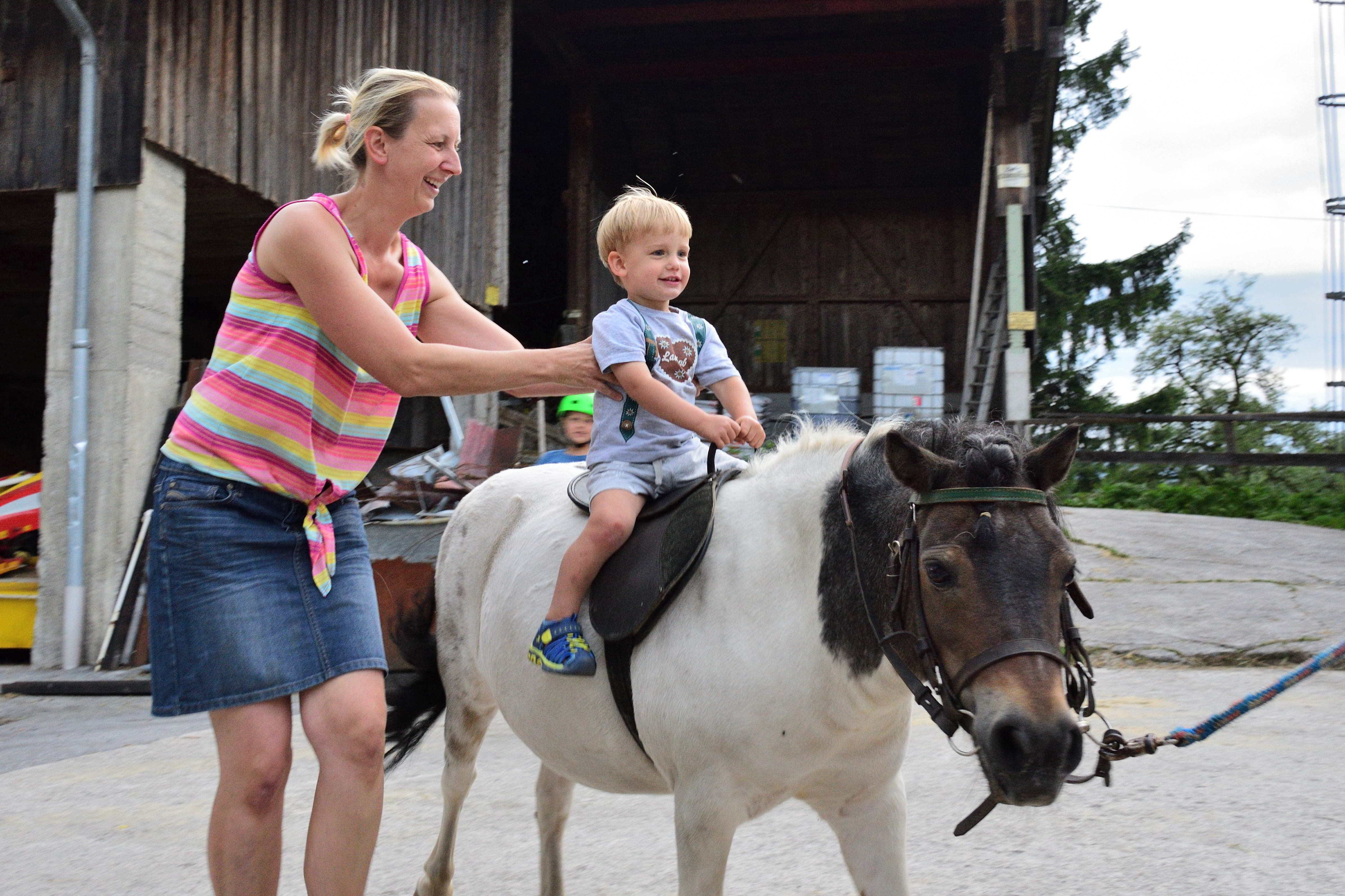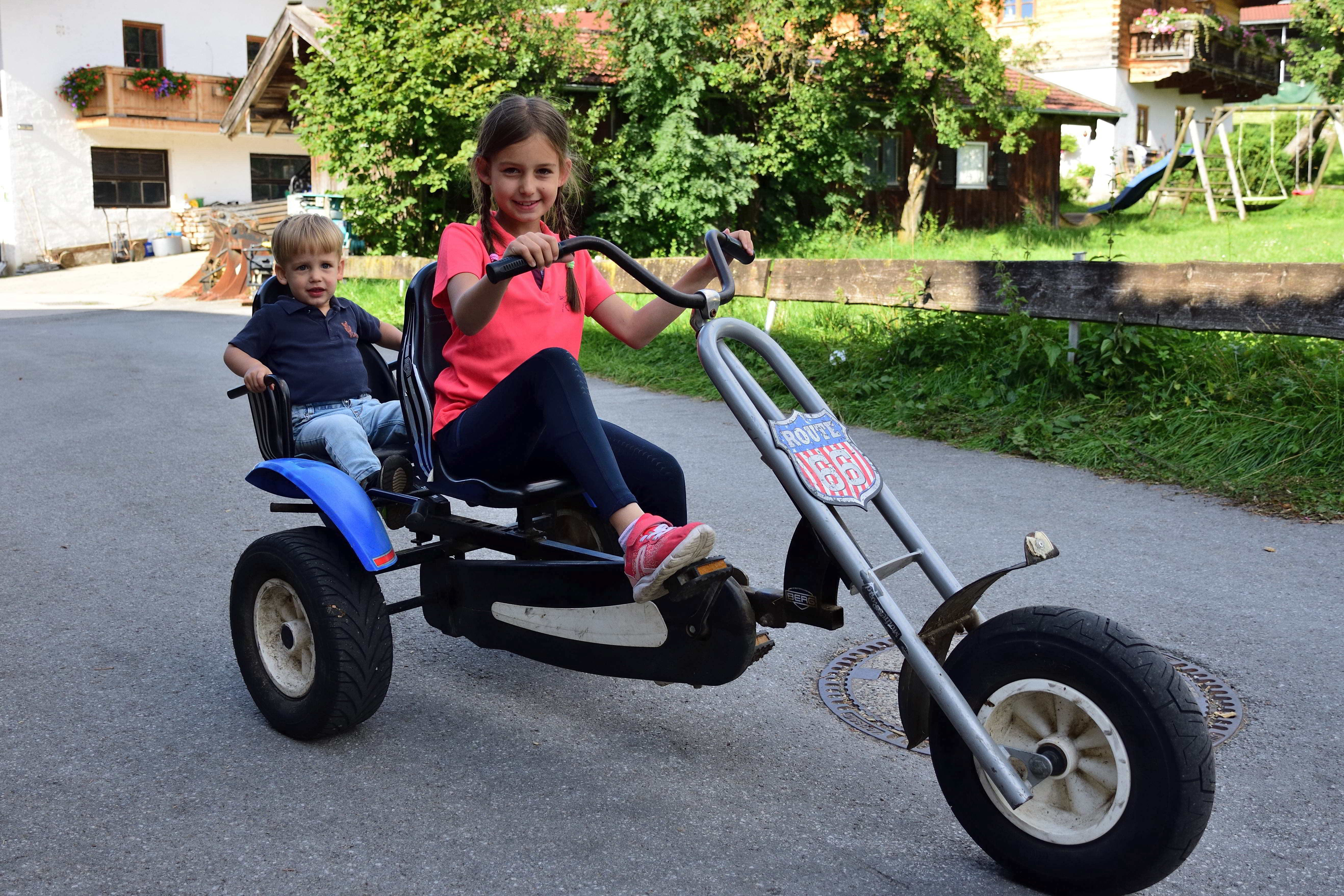 Der Bauernhof, den wir nun schon seit einigen Jahren besuchen, liegt auf einer kleinen Anhöhe und ist ideal für Familien. Die Eigentümer haben selbst Kinder und somit gibt es hier unglaublich viele Spielmöglichkeiten für Kinder jeden Alters. Im alten Kuhstall stehen unzählige Fahrgeräte für die Kinder- Bobby Cars, Traktoren, Milchlaster, Dreiräder, Rädchen, Skateboards aber auch große Gokarts, auf denen selbst die Erwachsenen noch Spaß haben. Im oberen Bereich des Hofs gibt es einen schönen Spielplatz mit einem großen Trampolin, einer Schaukel, einer großen Rutsche und einem großen Spielhaus auf Stelzen unter dem sich ein Sandkasten befindet. Gegenüber gibt es auch noch einen kleinen Sandkasten und eine Schaukelmöglichkeit mit kleinerer Rutsche. Hier können sich die Kinder immer frei bewegen und spielen. Zum Ausruhen und für die Eltern gibt es viele Sitzgelegenheiten oder Liegen zum Entspannen und genießen. Kurz hinter dem Hof kommt man über einen kleinen Weg zum Elbach. Dieser wunderschöne, klare Gebirgsbach eignet sich herrlich zum Spielen und bietet eine Abkühlung an heißen Sommertagen.