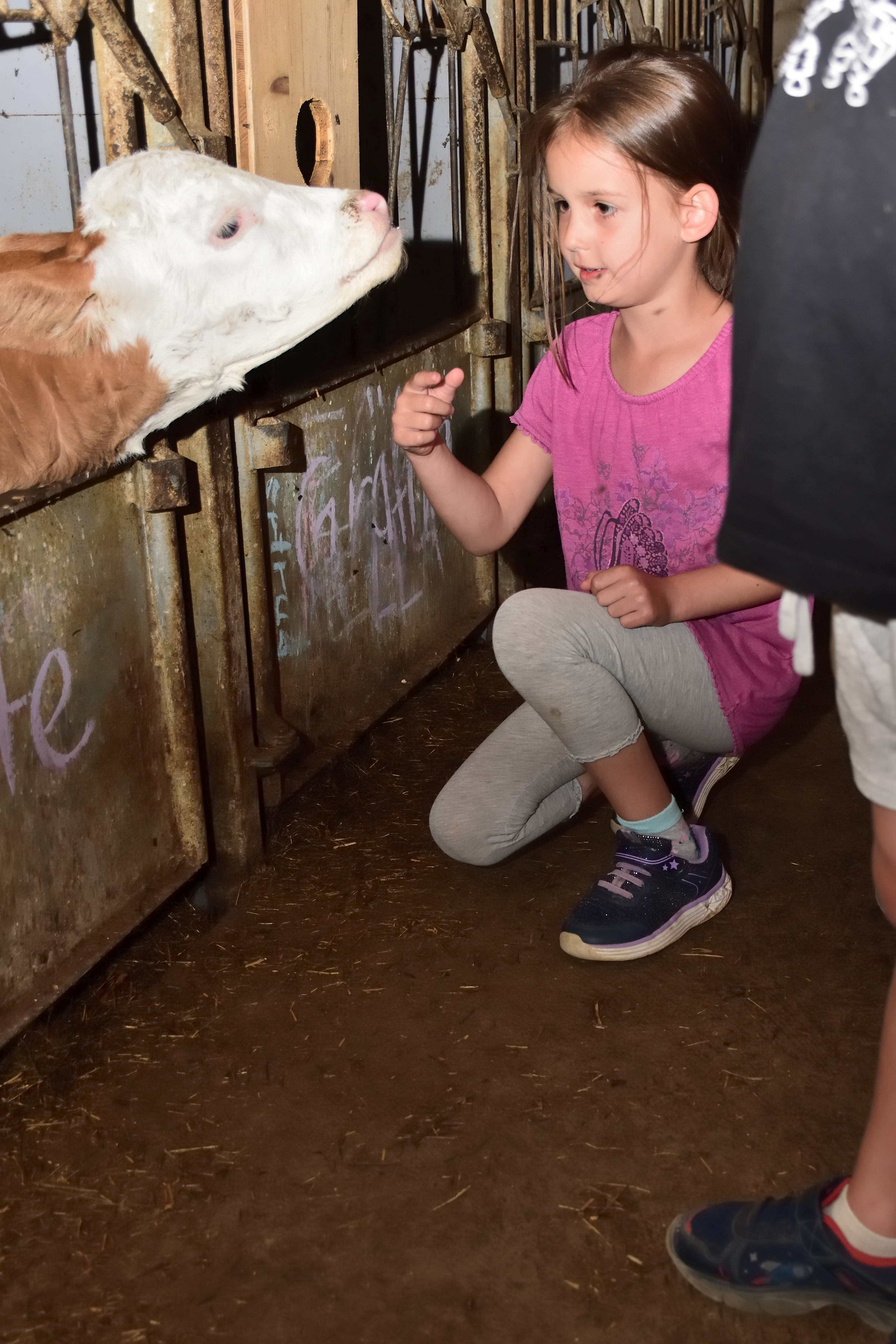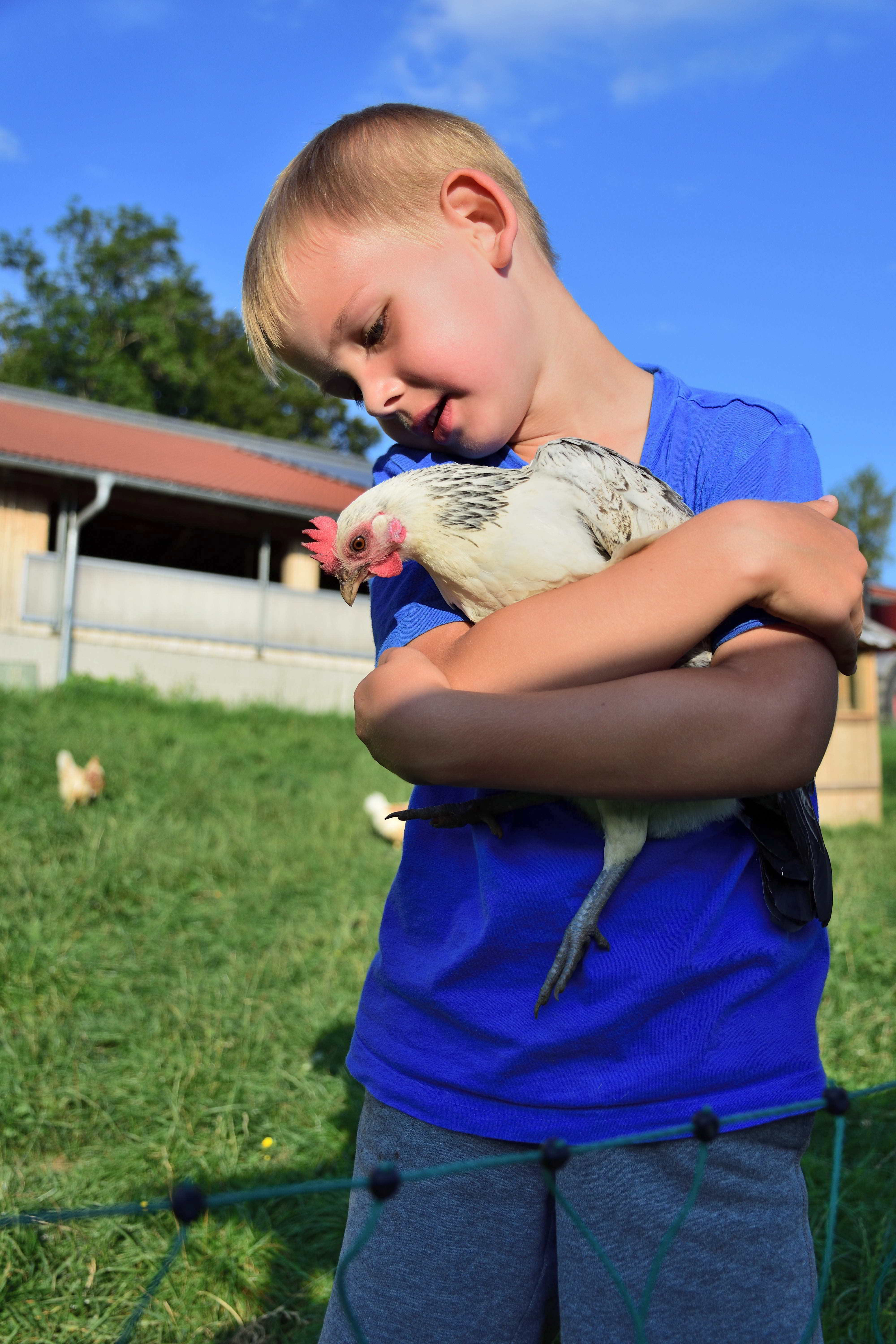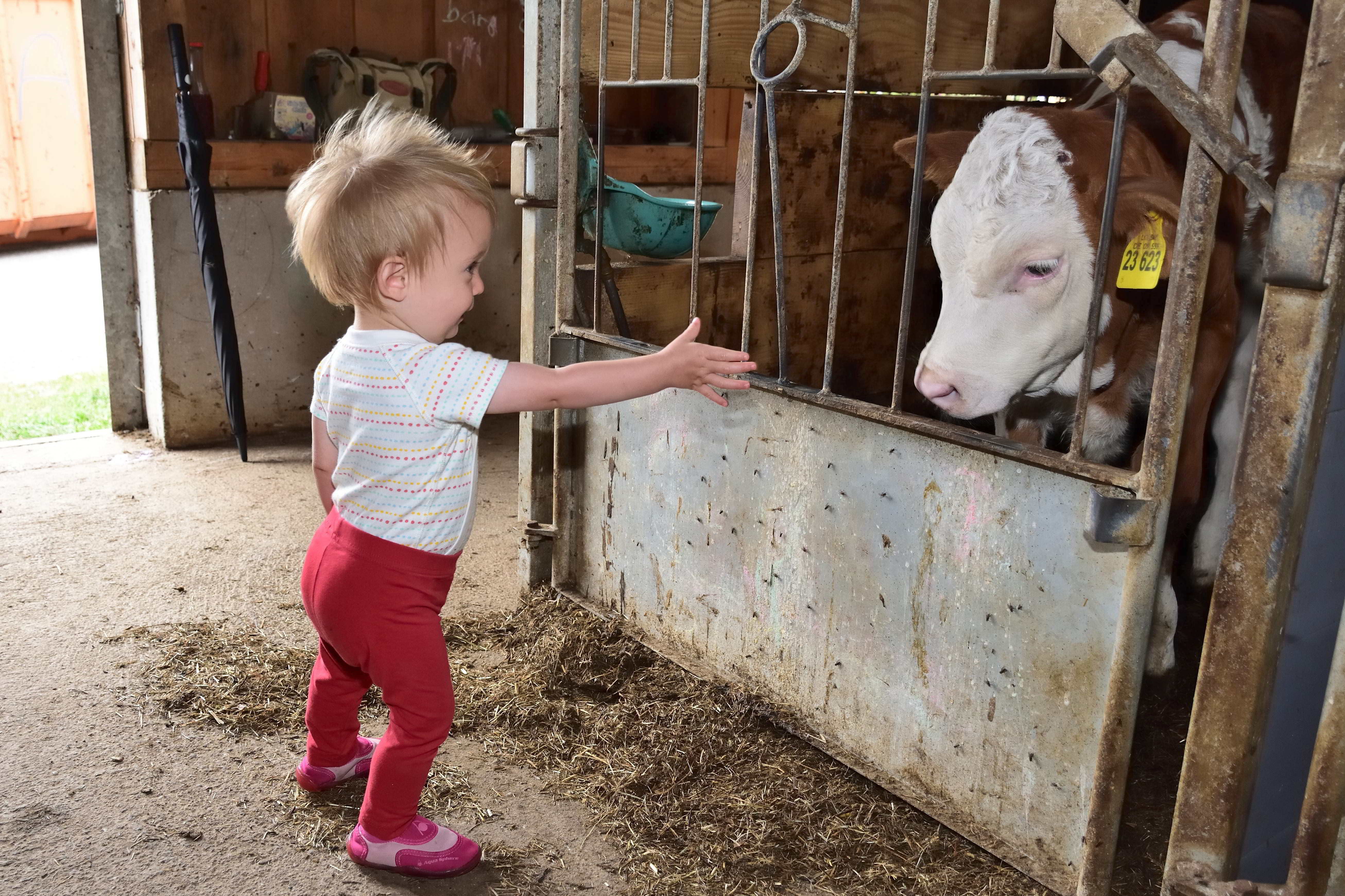 Aber auch Tiere gibt es auf dem Hof. Angefangen beim Pony, das ebenfalls im alten Kuhstall untergebracht ist, gibt es Hasen, Katzen, ein großes Hühnergehege und natürlich Milchkühe. Etwas außerhalb vom Hof werden noch Ziegen gehalten. Hier kann man ab und an abends mit hingenommen werden, wenn den Ziegen frisches Wasser und Futter gebracht wird. Für die Fahrt sitzt man auf der Ladefläche des Autos und kann den Fahrtwind genießen. Jedes Jahr, wenn wir kommen, gibt es Kälbchen und am späten Nachmittag gegen 16 Uhr können die Kinder helfen und Kälbchen füttern oder beim Melken und Füttern helfen. Aber auch bei fast jeder anderen Tätigkeit auf dem Hof dürfen die Kinder gerne mithelfen. Ein weiteres Highlight besonders natürlich für die Jungs sind die vielen großen Traktoren auf dem Hof, auf denen die Kinder gerne mitfahren können.
