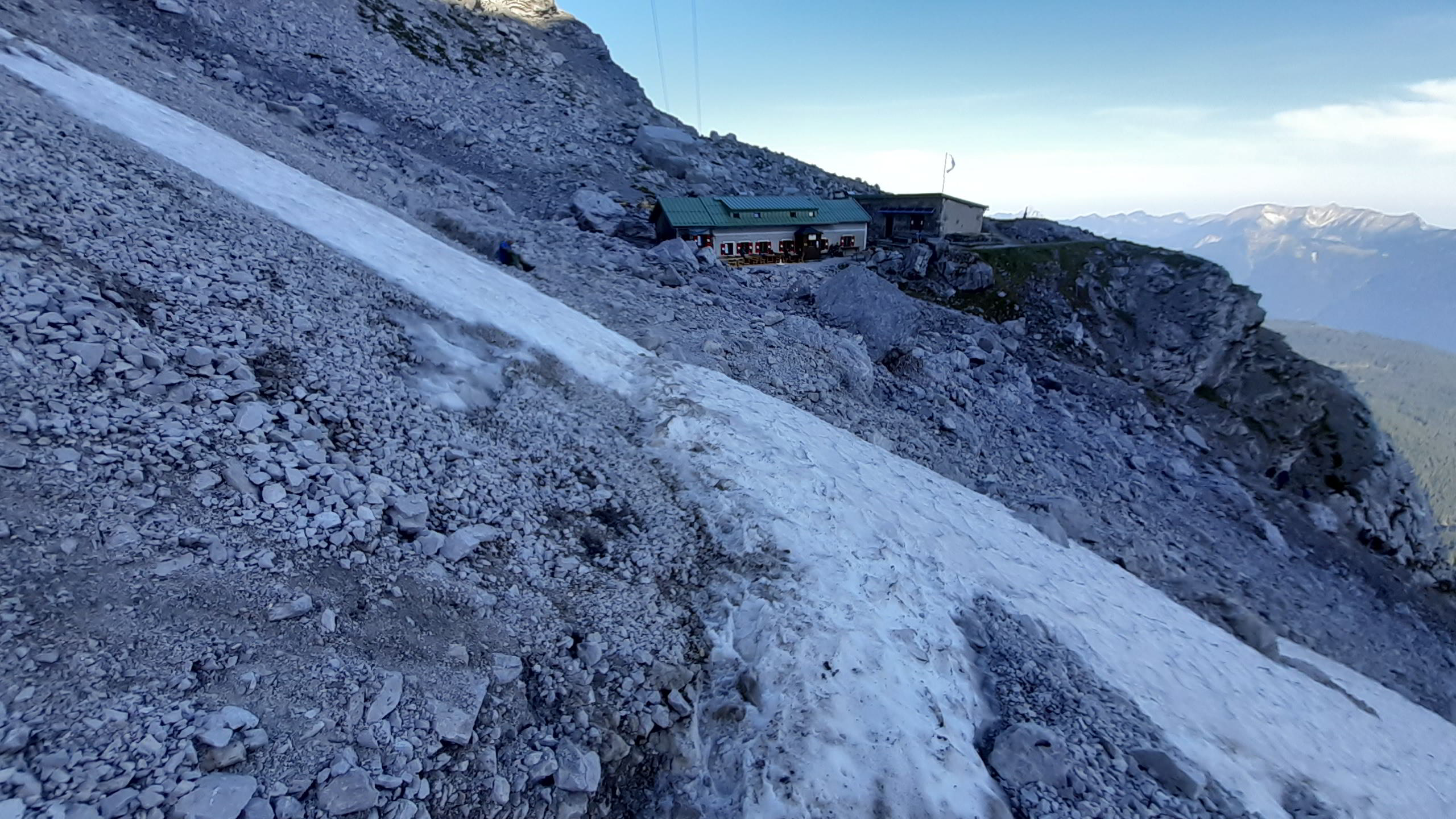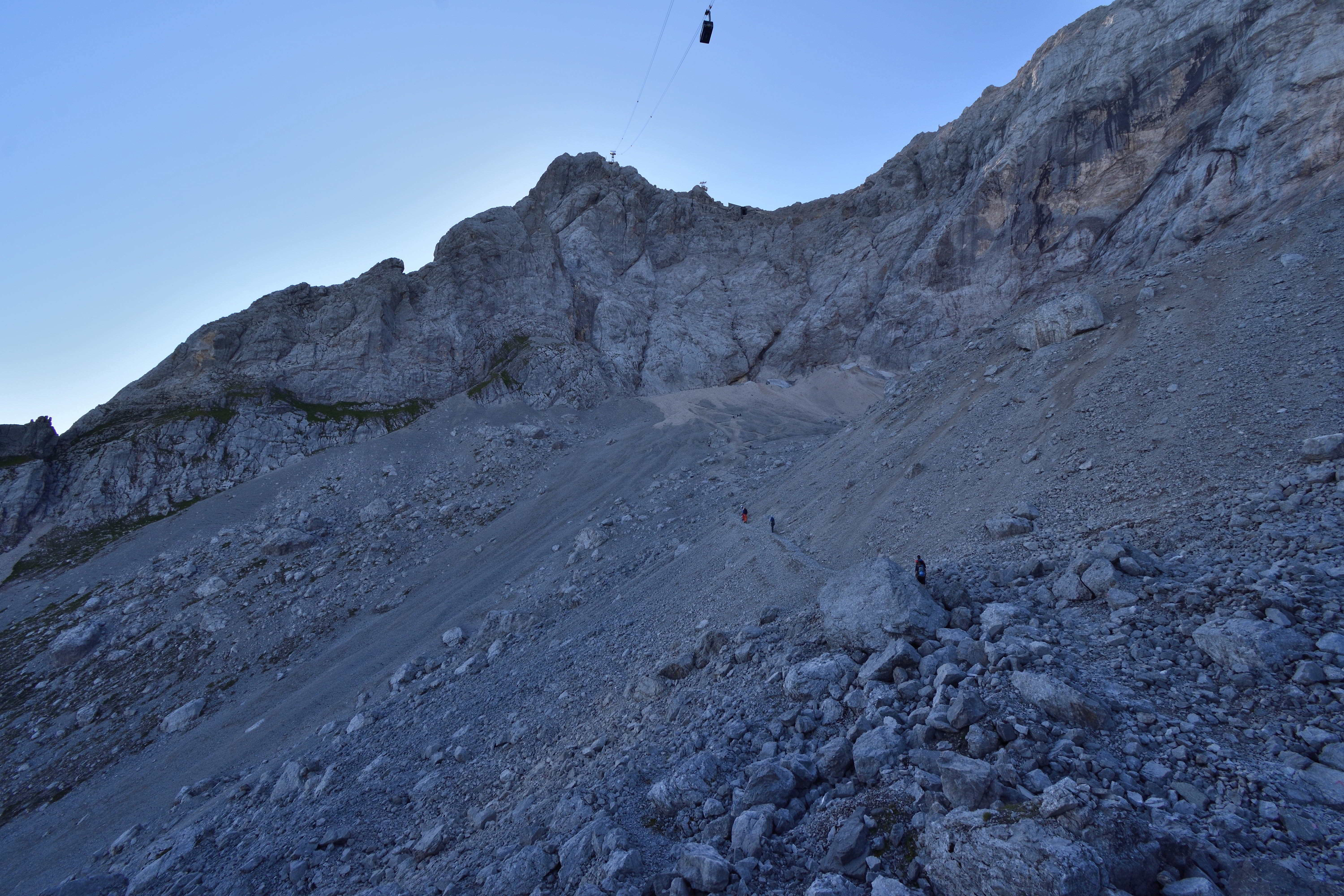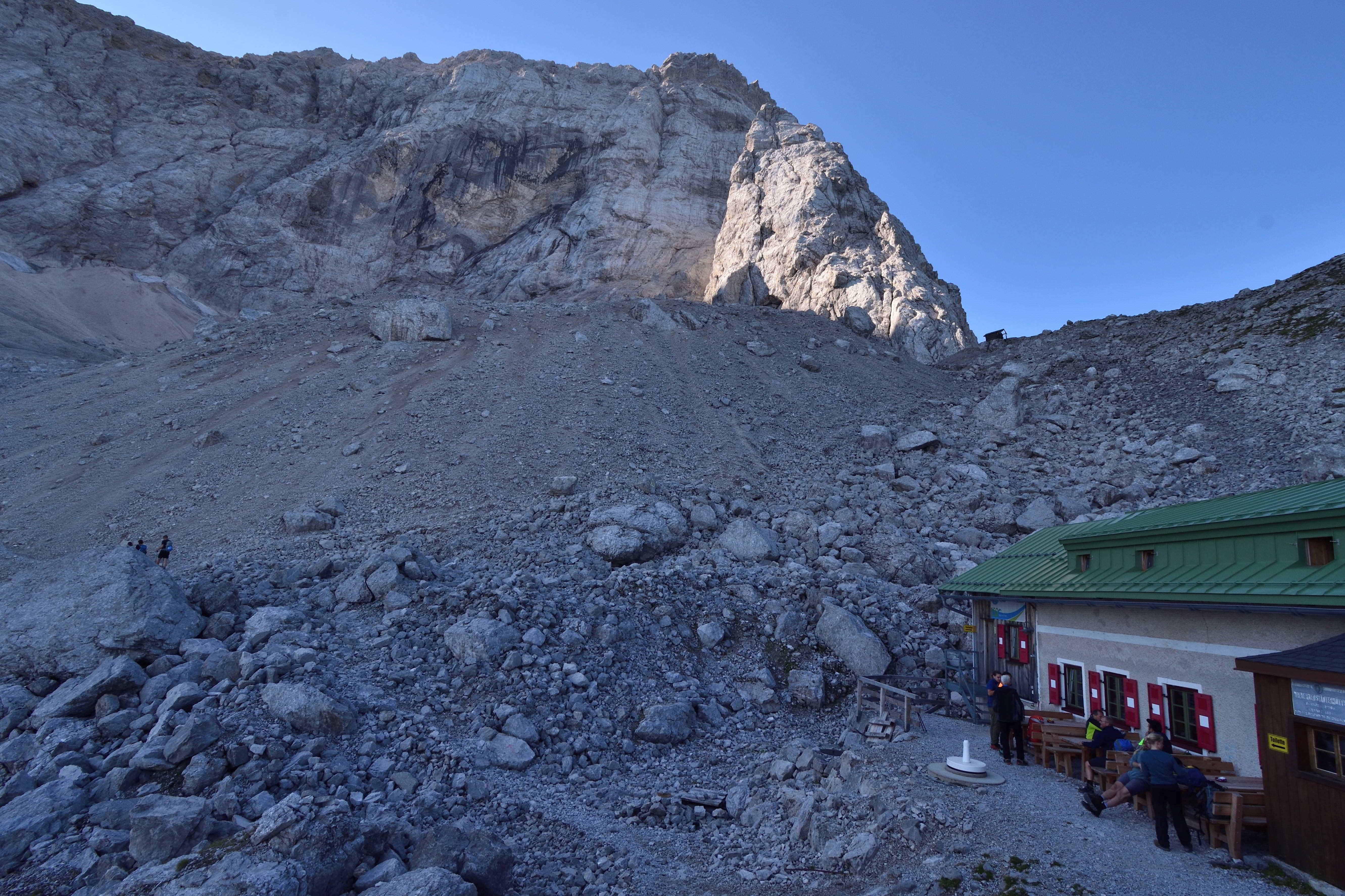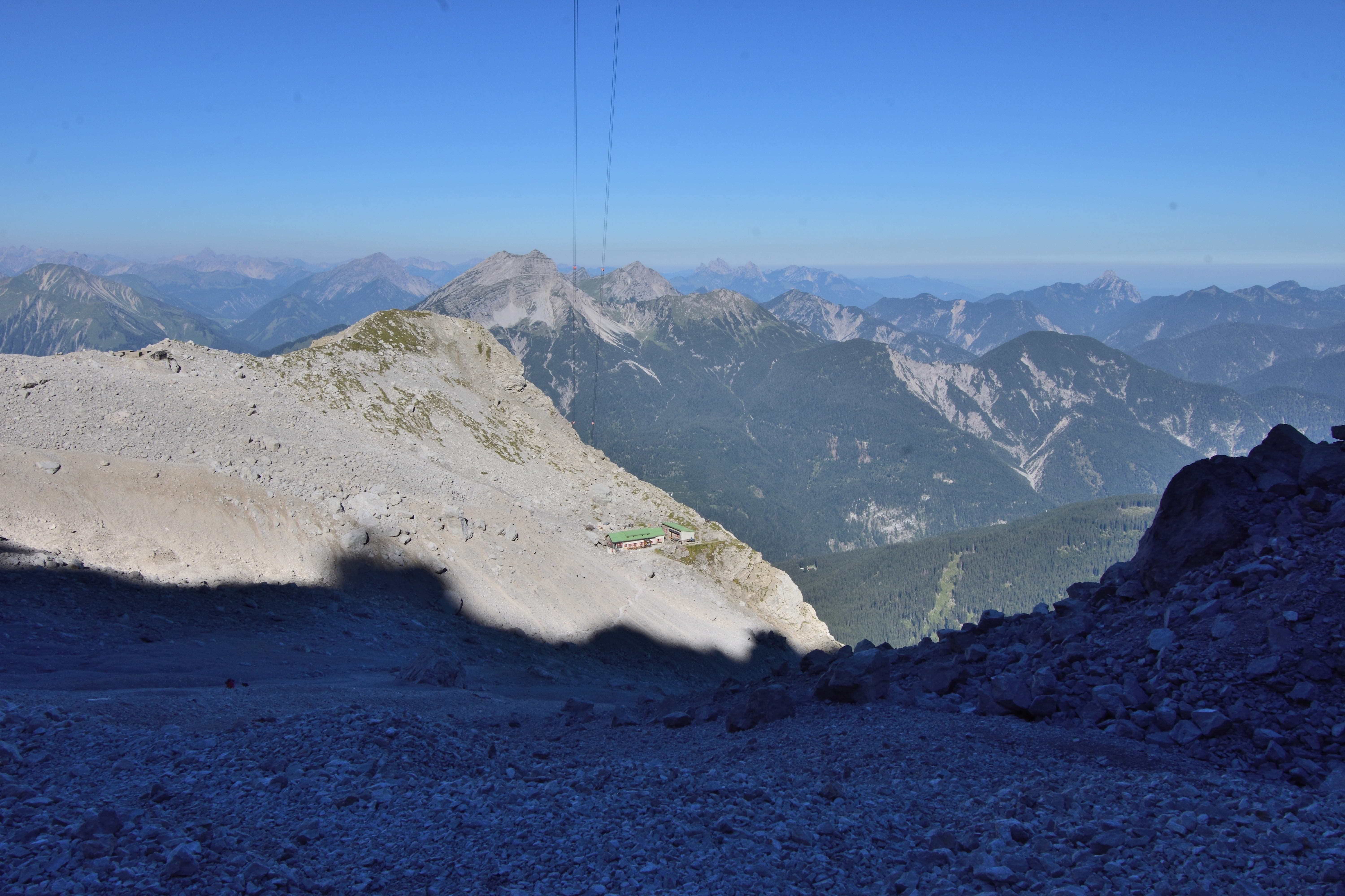 Ausgangspunkt für meine Tour ist der Parkplatz der Tiroler Zugspitzbahn in Ehrwald (Österreich). Vom Parkplatz folge ich immer dem ausgeschilderten Weg Richtung Wiener Neustädter Hütte. Es geht sofort steil los und das wird auch bis auf wenige Passagen so bleiben. Vom Forstweg nimmt man am besten den Abzweig nach links durch einen Latschenhain. Der Weg windet sich steil über steiniges, teils noch bewaldetes Gelände. Ein Stück weiter wird der Blick über das Tal und Ehrwald frei. Bei Sonnenaufgang ein herrlicher Anblick. Der Weg führt weiter hinauf, jetzt über Geröllfelder, teils recht steil, bis zur Landesgrenze zwischen Bayern und Tirol. Hier zweigt man nach rechts ab und folgt auf österreichischem Boden dem Pfad zur Wiener Neustädter Hütte. Nach mehreren steilen Aufschwüngen und kurz vor der alten Mittelstation der Tiroler Zugspitzbahn gelangt man an eine Geländekante, von der aus der Blick zum Eibsee und nach Garmisch-Partenkirchen frei wird. Der Weg wird nun etwas weniger steil und führt oft drahtseilgesichert durch eine schroffe Bergflanke. Das letzte Stück zur Hütte ist nochmal etwas steiler. Angekommen an der Wiener Neustädter Hütte mache ich eine erste Rast mit einer kleinen Brotzeit.