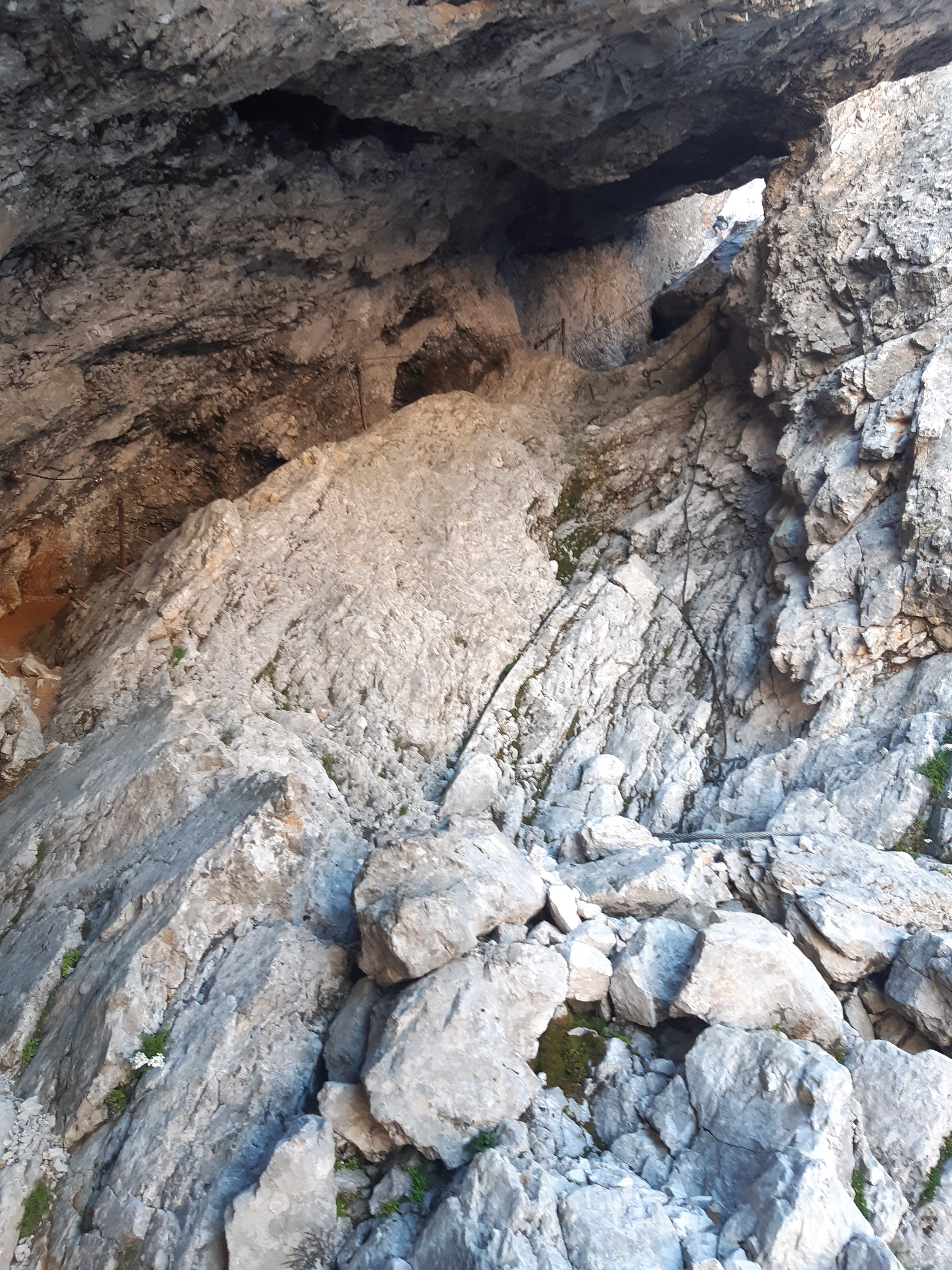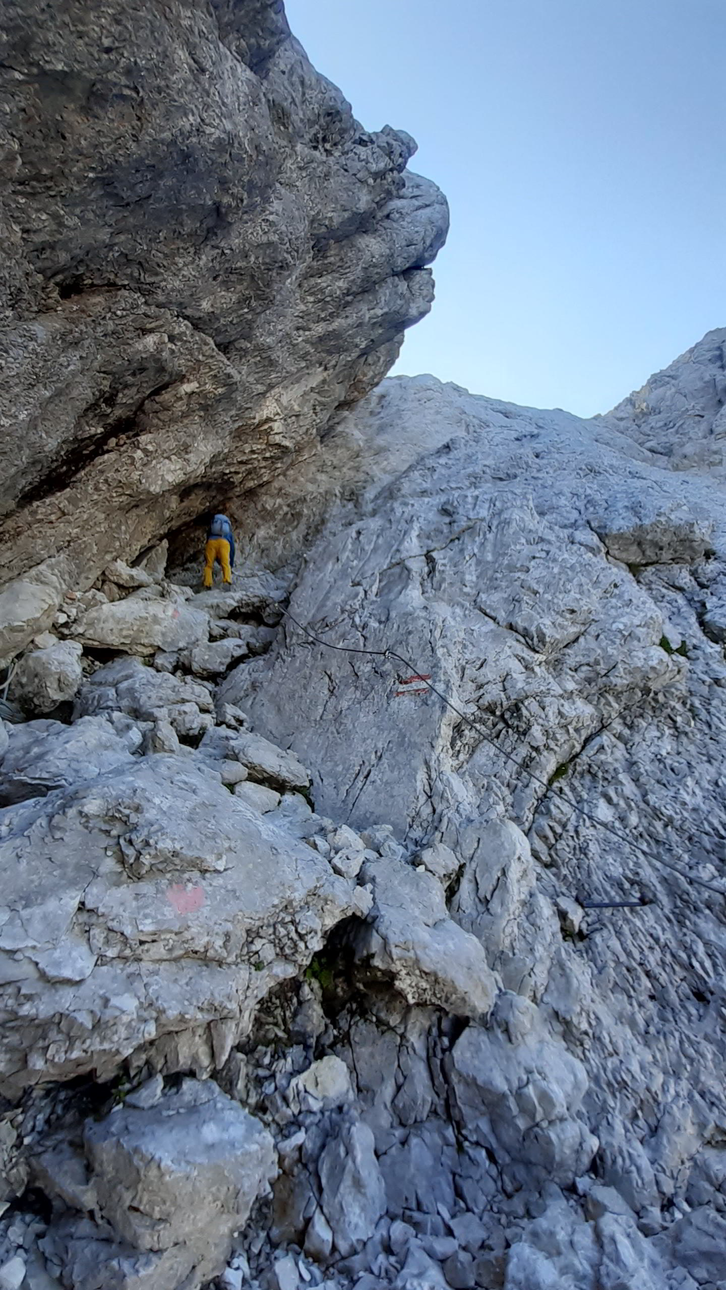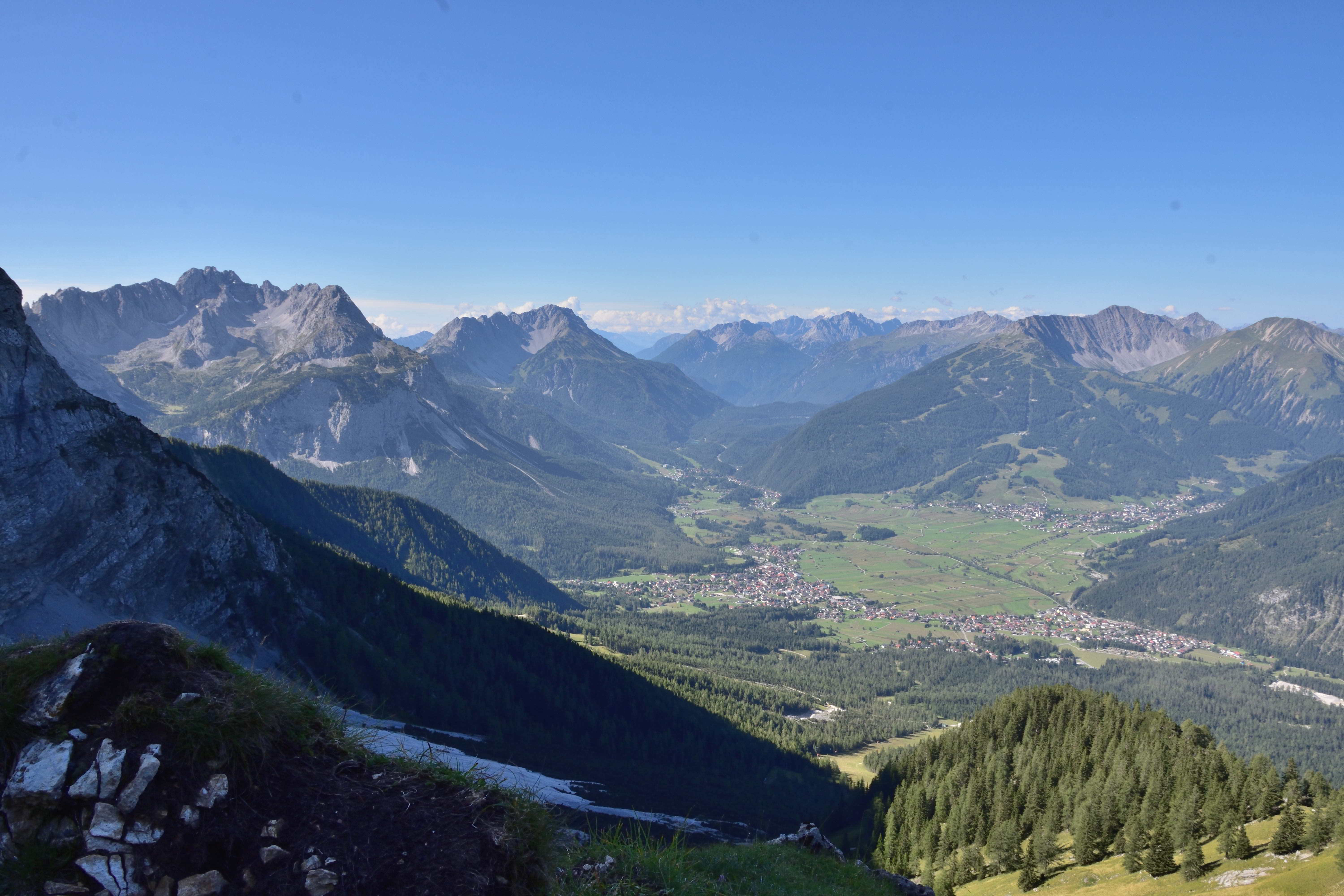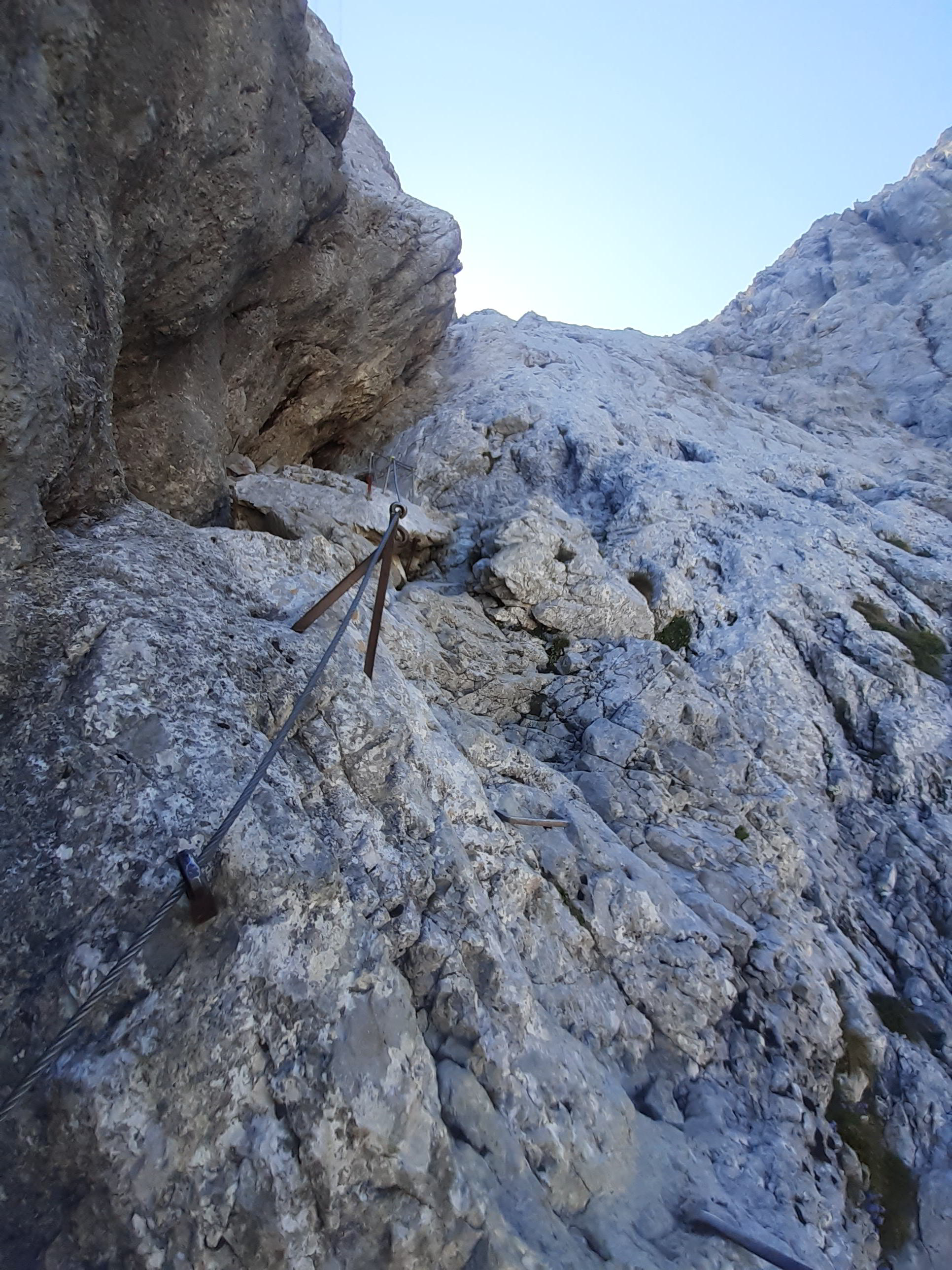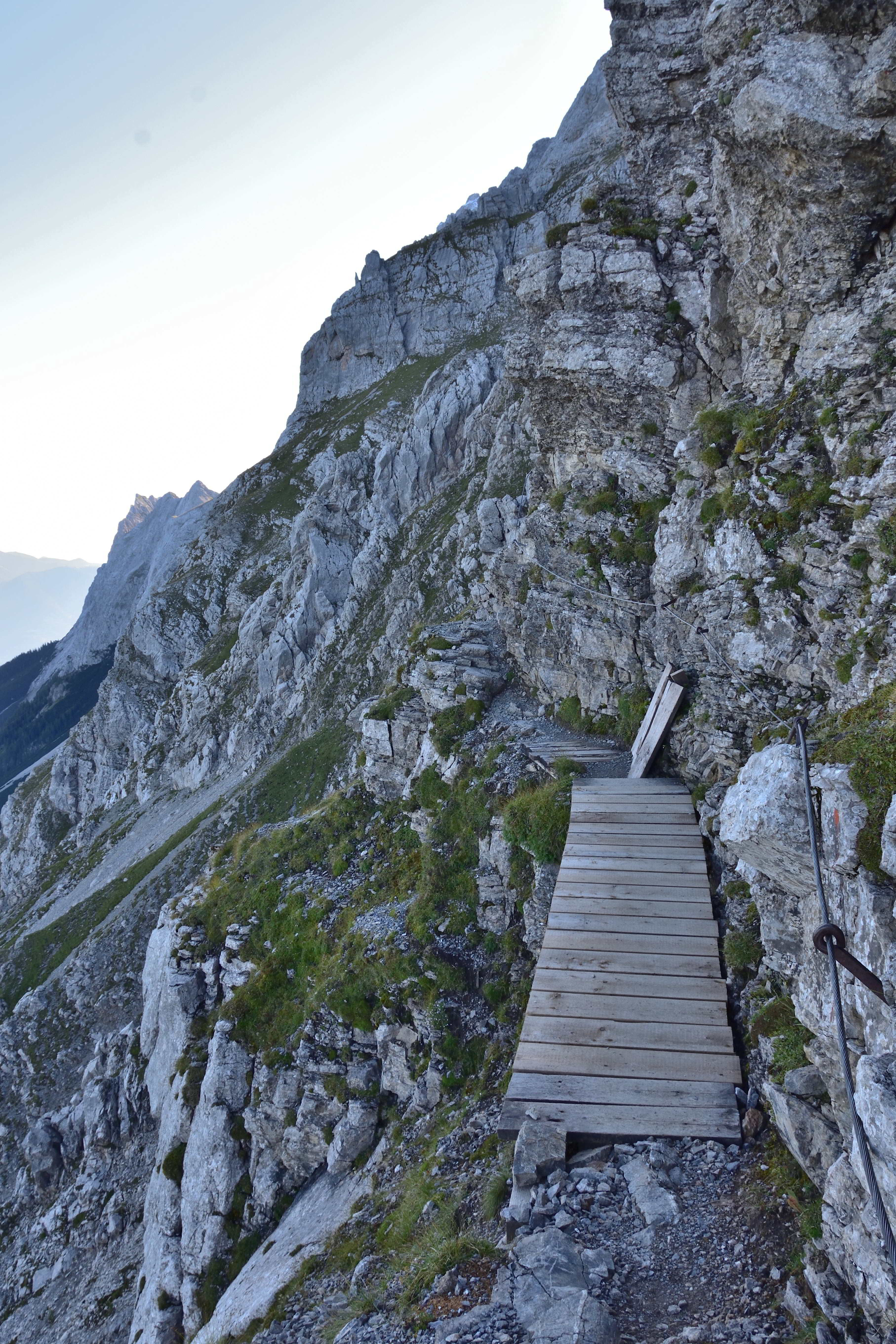 Ausgangspunkt für meine Tour ist der Parkplatz der Tiroler Zugspitzbahn in Ehrwald (Österreich). Vom Parkplatz folge ich immer dem ausgeschilderten Weg Richtung Wiener Neustädter Hütte. Es geht sofort steil los und das wird auch bis auf wenige Passagen so bleiben. Vom Forstweg nimmt man am besten den Abzweig nach links durch einen Latschenhain. Der Weg windet sich steil über steiniges, teils noch bewaldetes Gelände. Ein Stück weiter wird der Blick über das Tal und Ehrwald frei. Bei Sonnenaufgang ein herrlicher Anblick. Der Weg führt weiter hinauf, jetzt über Geröllfelder, teils recht steil, bis zur Landesgrenze zwischen Bayern und Tirol. Hier zweigt man nach rechts ab und folgt auf österreichischem Boden dem Pfad zur Wiener Neustädter Hütte. Nach mehreren steilen Aufschwüngen und kurz vor der alten Mittelstation der Tiroler Zugspitzbahn gelangt man an eine Geländekante, von der aus der Blick zum Eibsee und nach Garmisch-Partenkirchen frei wird. Der Weg wird nun etwas weniger steil und führt oft drahtseilgesichert durch eine schroffe Bergflanke. Das letzte Stück zur Hütte ist nochmal etwas steiler. Angekommen an der Wiener Neustädter Hütte mache ich eine erste Rast mit einer kleinen Brotzeit.