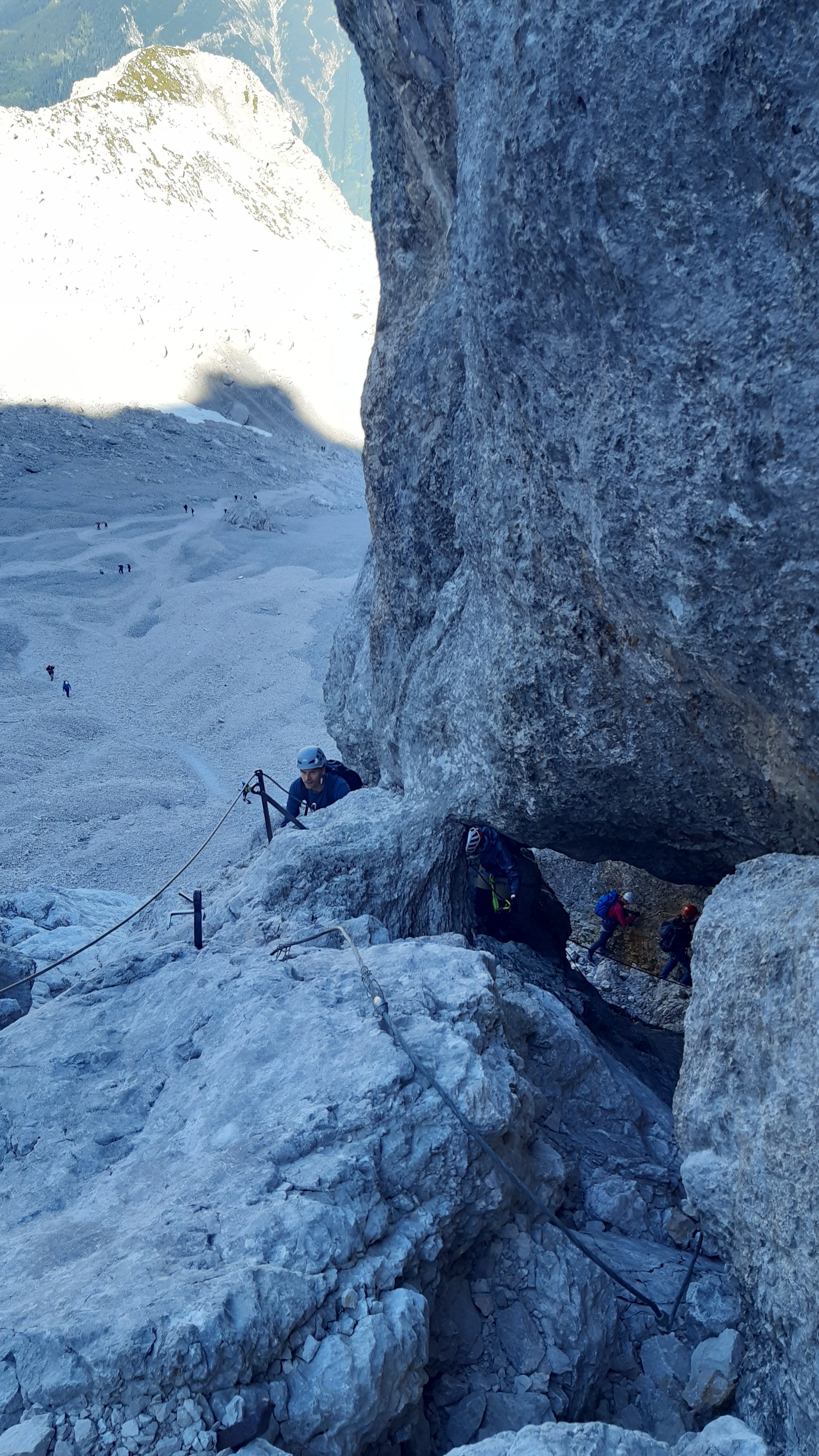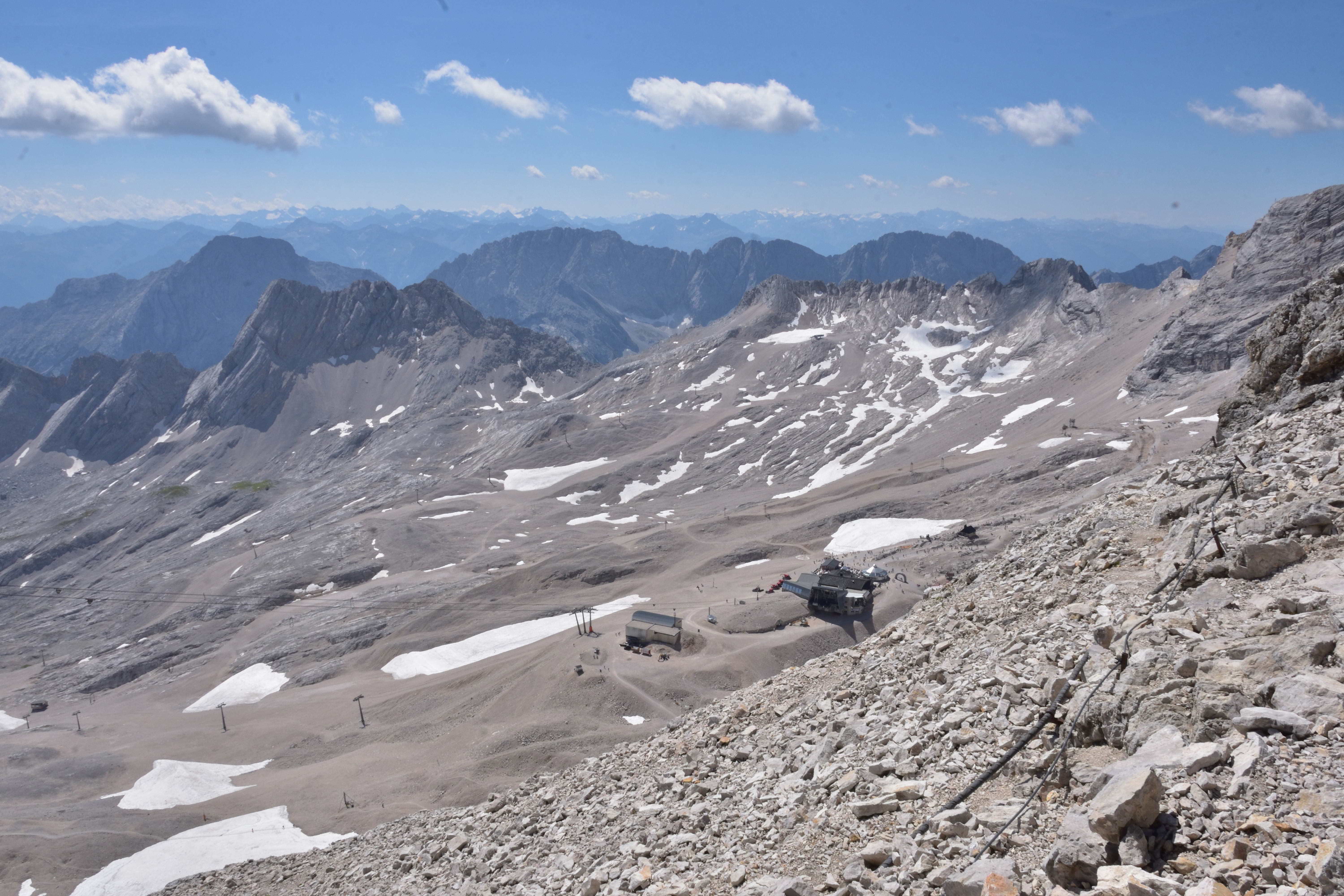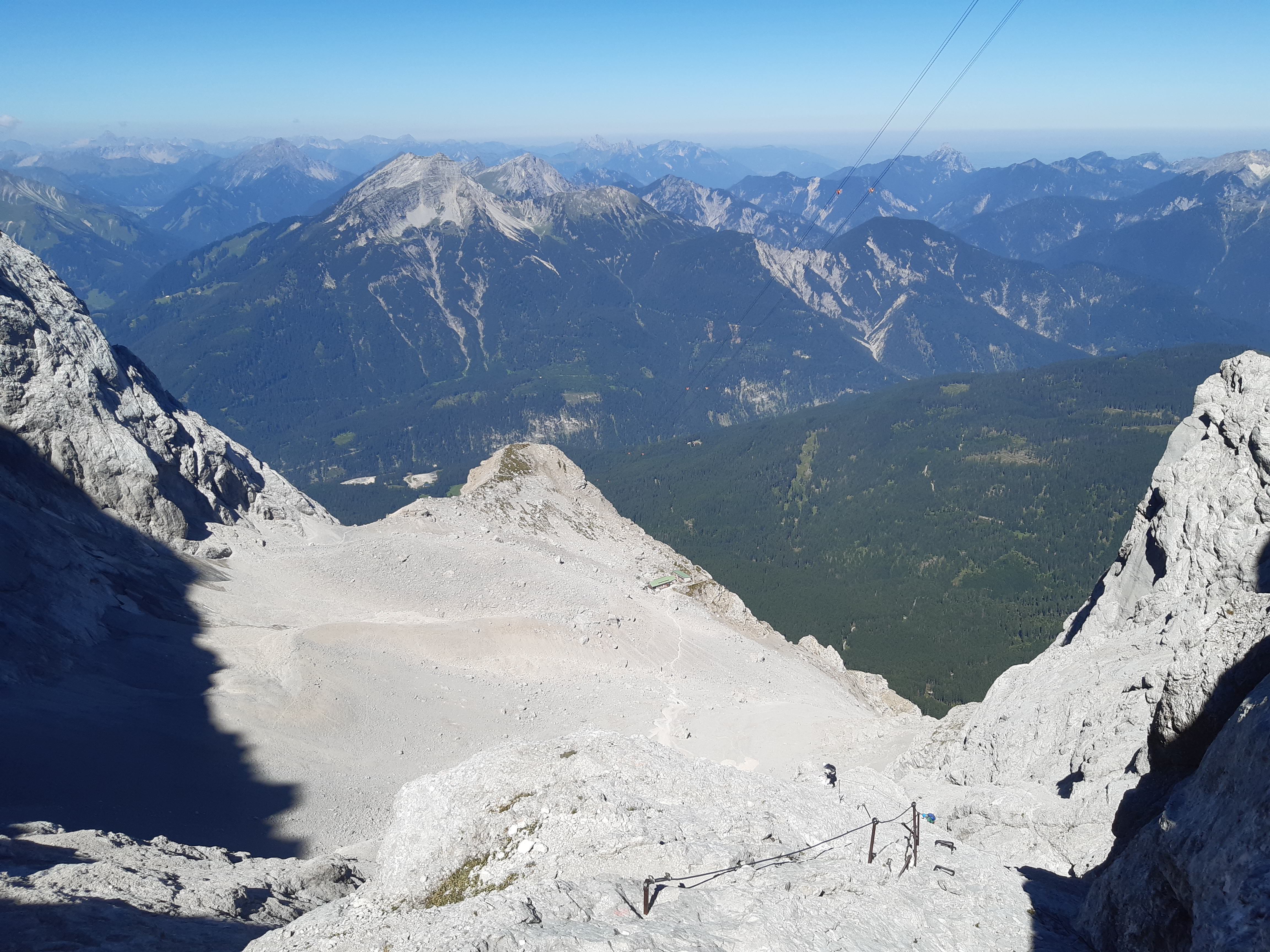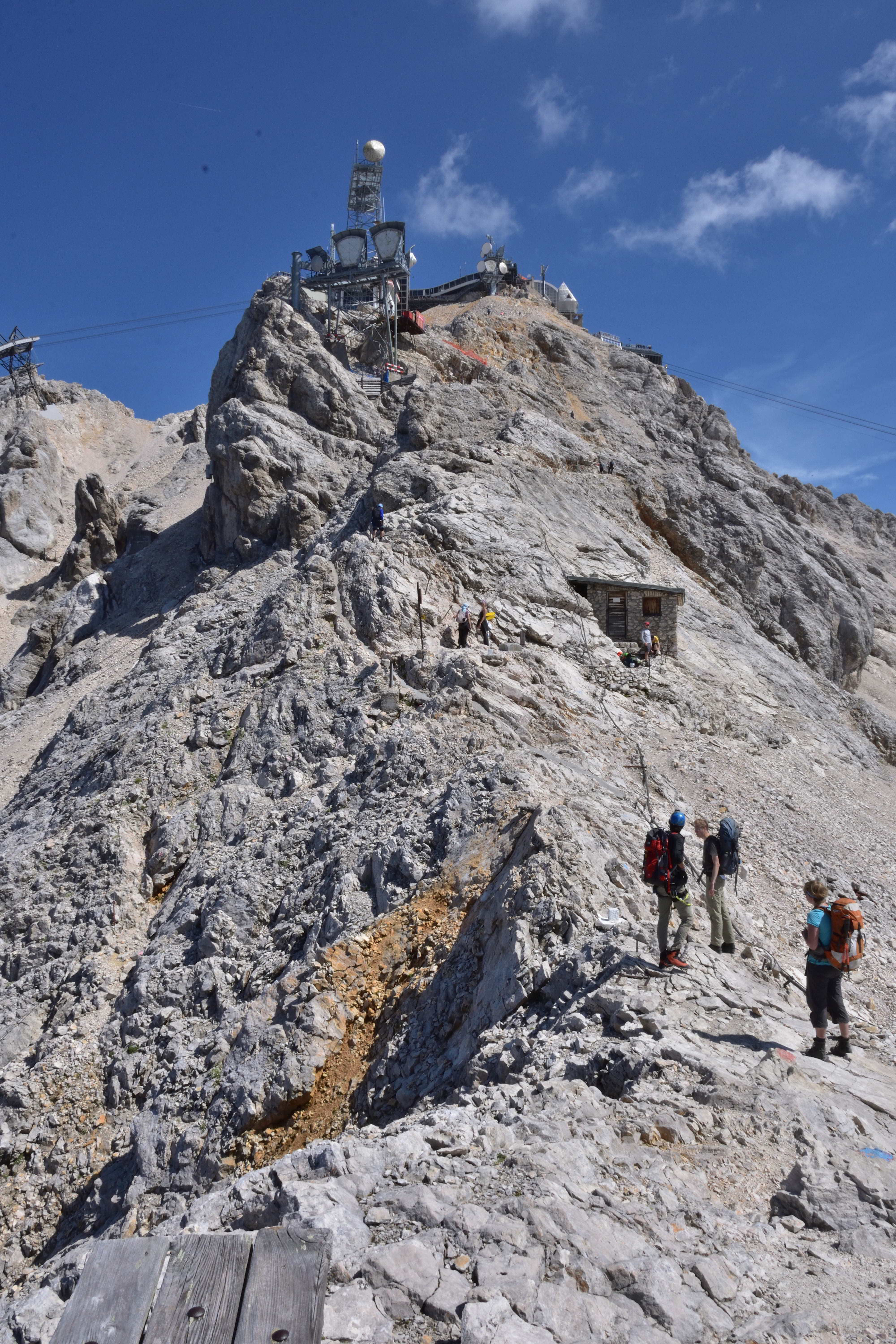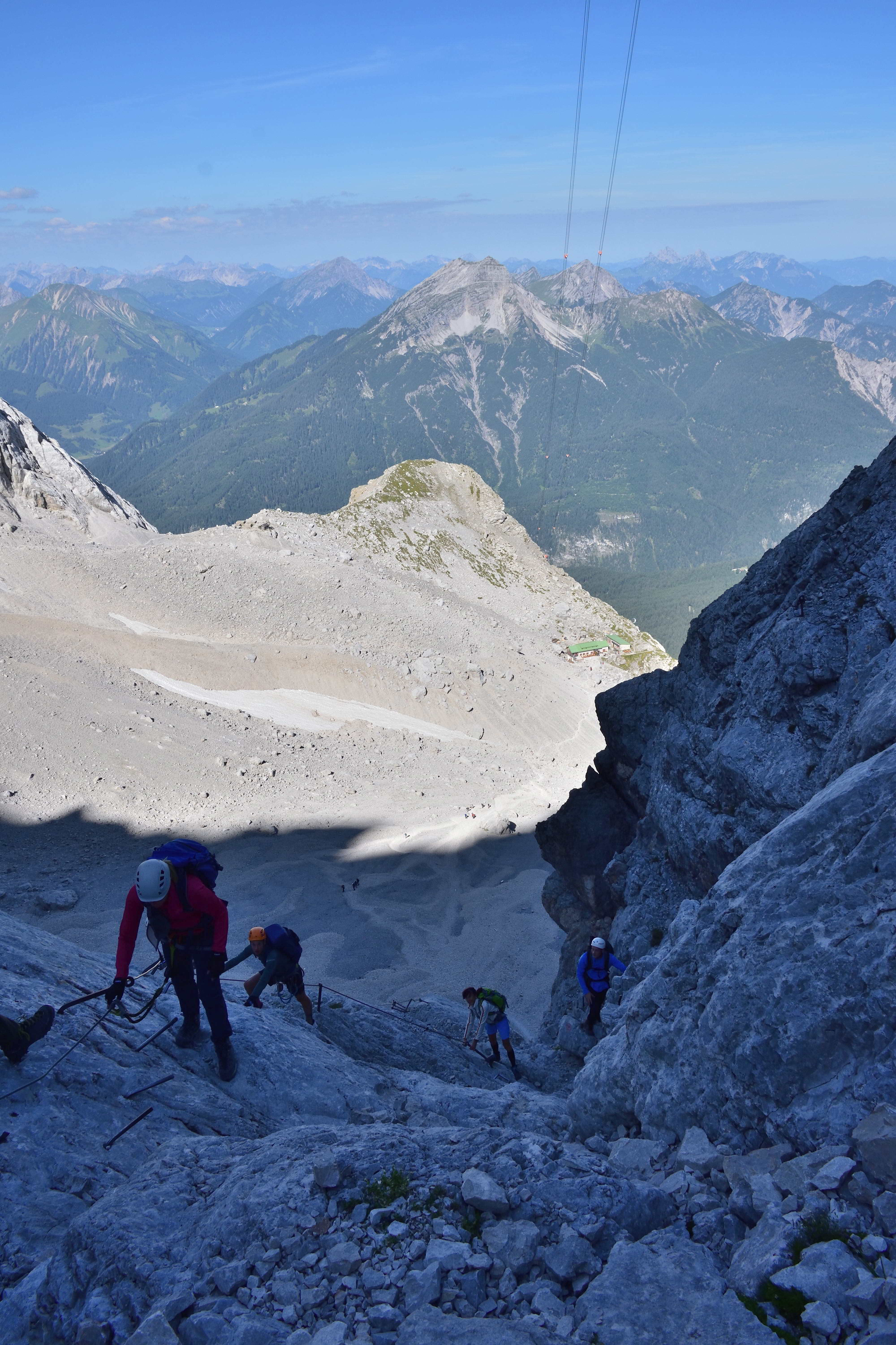 Nachdem ich meine Klettersteigausrüstung angelegt habe, geht es von der Hütte auf einem gut sichtbaren Weg über Geröll, hinüber zum Einstieg des Stopselziehers. Dabei quere ich noch ein Schneefeld. Hier beginnt der Klettersteig. Nach wenigen Metern geht es durch ein großes Felsloch und danach über etliche Tritte und Leitern sehr steil nach oben. Der Klettersteig ist an vielen Stellen drahtseilgesichert und ich seile mich an. Nach dem Stopselzieher wechseln steile Kletterpassagen mit etwas flacheren Abschnitten. Der Weg zieht sich und lässt die Beine spüren. Nach einer Weile kommt endlich die verlassene Bergstation Zugspitzkamm in Sicht. Hier mache ich eine kurze Pause und genieße die Aussicht über den zurückgelegten Weg. Dann geht es noch ein gutes Stück weiter bergauf zum Kamm. Dort mache ich erneut eine kurze Pause und genieße den Blick über das Zugspitzplatt. Der Weg führt nun nach links weiter zur Gipfelstation und zum Münchner Haus. Ich genieße die tolle Aussicht, verzichte aber auf den Gang zum deutschen Gipfelkreuz, aufgrund der langen Schlange und der voraussichtlichen 45-minütigen Wartezeit. Da der Klettersteig doch recht steil und lang ist, und ich ziemlich erschöpft bin entscheide ich mich, mit der Seilbahn ins Tal zu fahren, und habe somit auch noch etwas mehr Zeit den Rundumblick zu genießen.