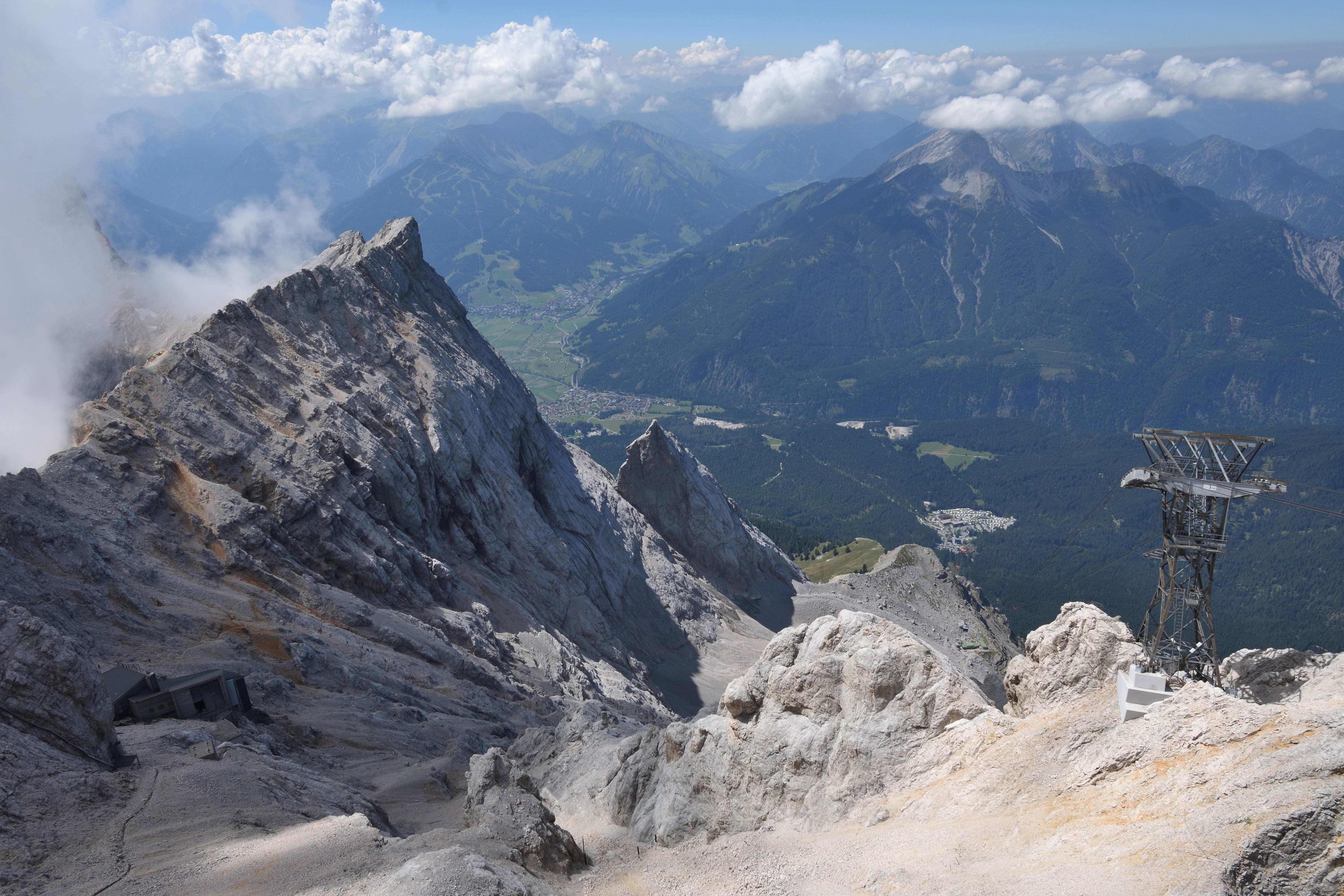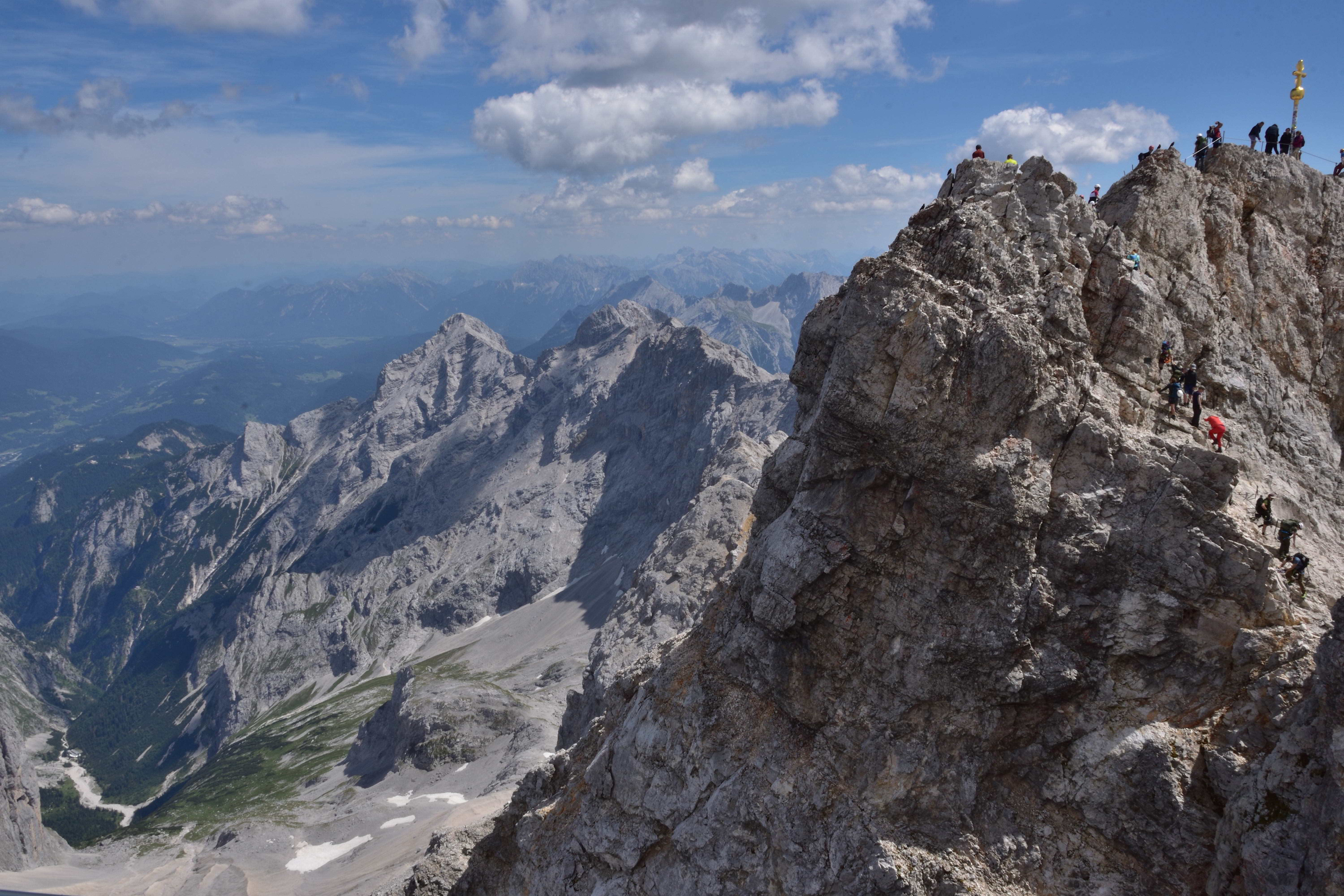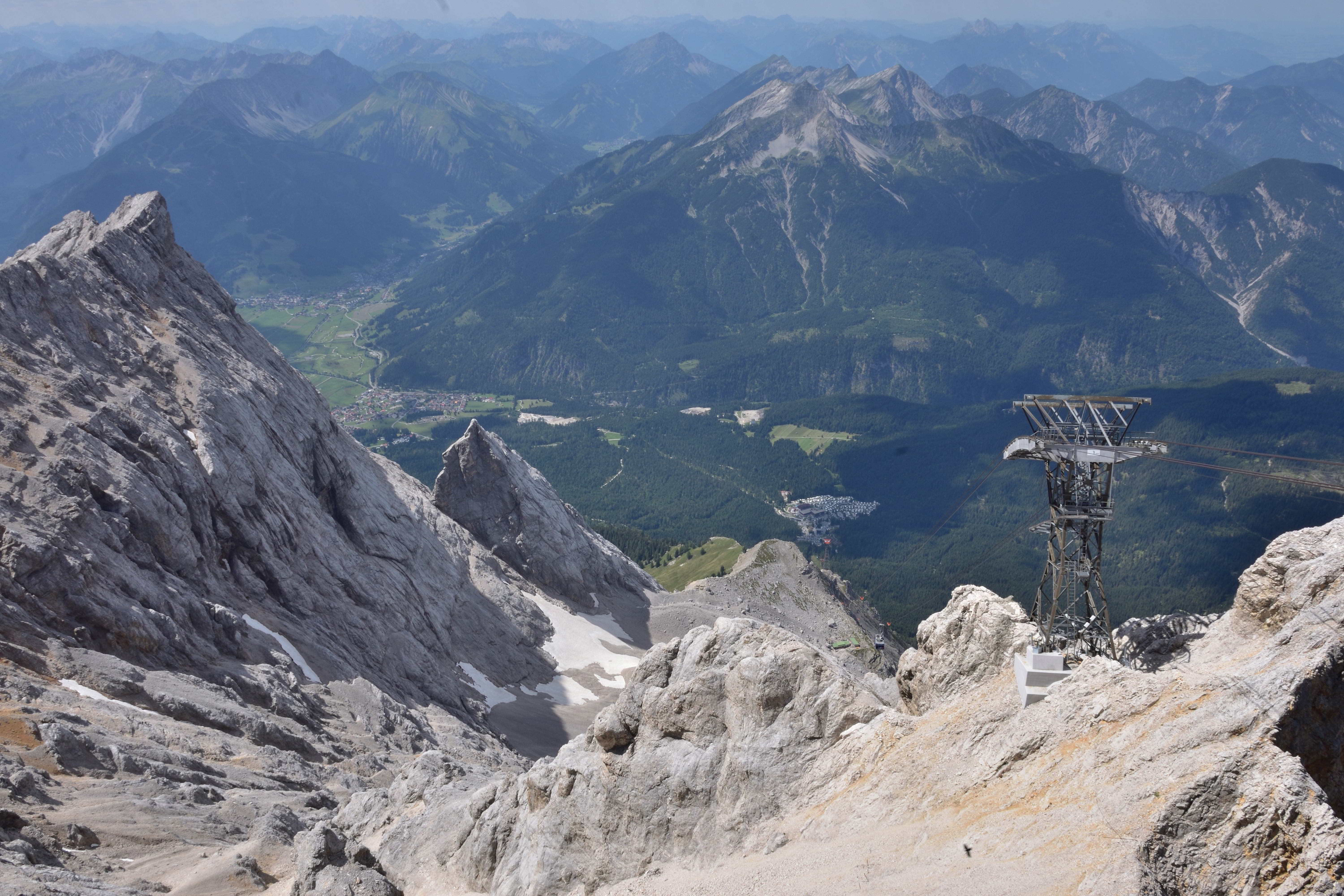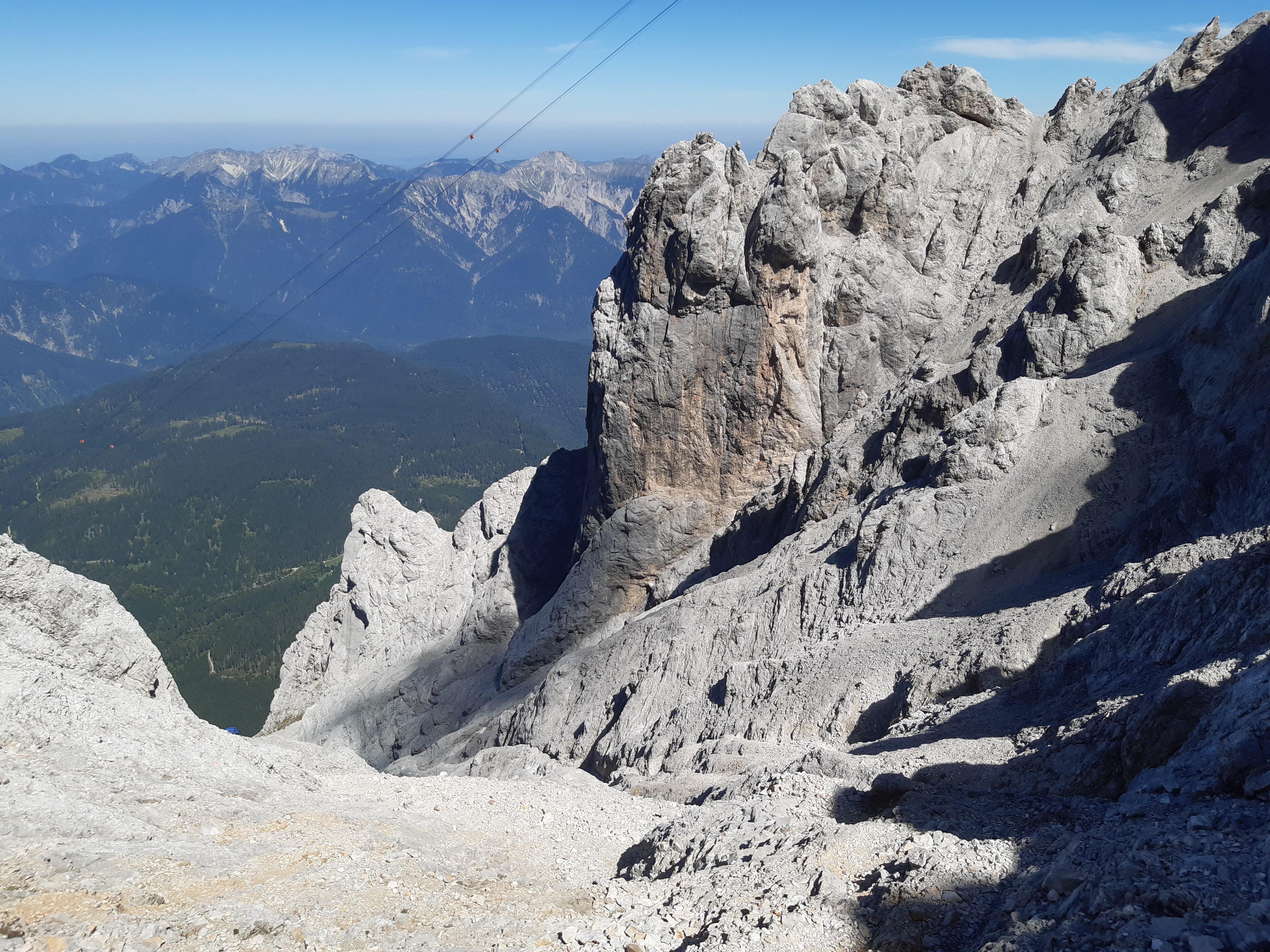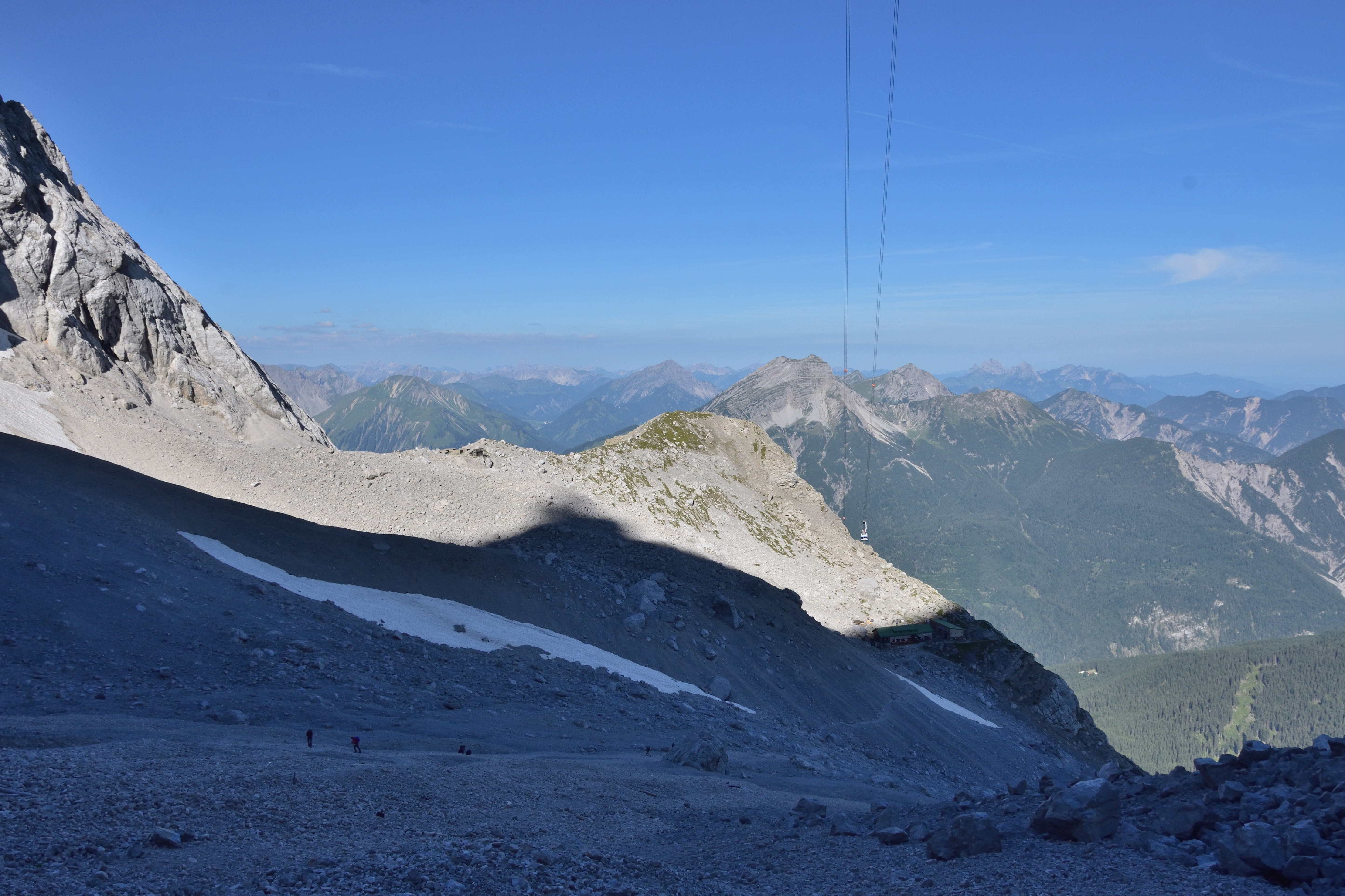 Nachdem ich meine Klettersteigausrüstung angelegt habe, geht es von der Hütte auf einem gut sichtbaren Weg über Geröll, hinüber zum Einstieg des Stopselziehers. Dabei quere ich noch ein Schneefeld. Hier beginnt der Klettersteig. Nach wenigen Metern geht es durch ein großes Felsloch und danach über etliche Tritte und Leitern sehr steil nach oben. Der Klettersteig ist an vielen Stellen drahtseilgesichert und ich seile mich an. Nach dem Stopselzieher wechseln steile Kletterpassagen mit etwas flacheren Abschnitten. Der Weg zieht sich und lässt die Beine spüren. Nach einer Weile kommt endlich die verlassene Bergstation Zugspitzkamm in Sicht. Hier mache ich eine kurze Pause und genieße die Aussicht über den zurückgelegten Weg. Dann geht es noch ein gutes Stück weiter bergauf zum Kamm. Dort mache ich erneut eine kurze Pause und genieße den Blick über das Zugspitzplatt. Der Weg führt nun nach links weiter zur Gipfelstation und zum Münchner Haus. Ich genieße die tolle Aussicht, verzichte aber auf den Gang zum deutschen Gipfelkreuz, aufgrund der langen Schlange und der voraussichtlichen 45-minütigen Wartezeit. Da der Klettersteig doch recht steil und lang ist, und ich ziemlich erschöpft bin entscheide ich mich, mit der Seilbahn ins Tal zu fahren, und habe somit auch noch etwas mehr Zeit den Rundumblick zu genießen.