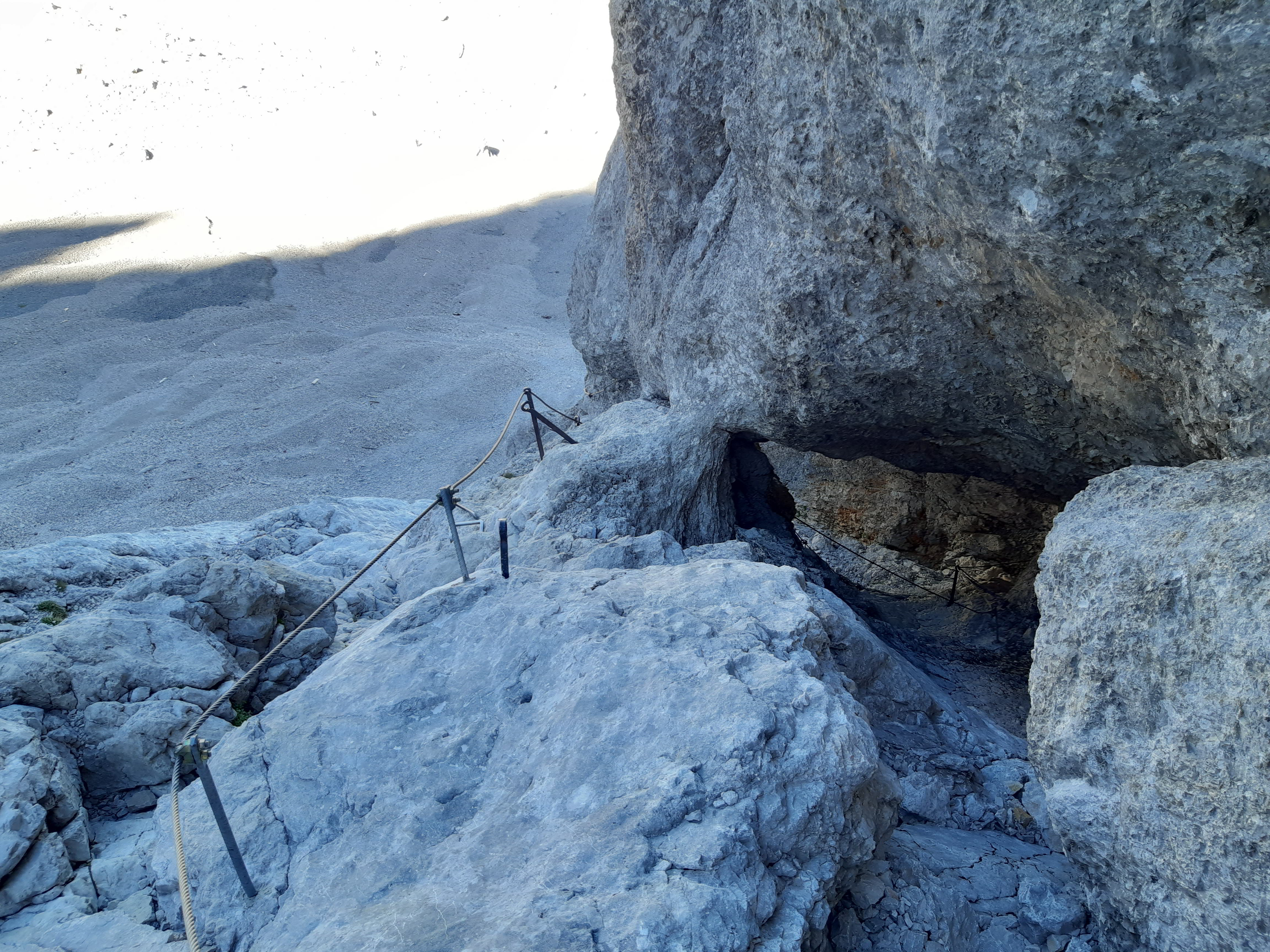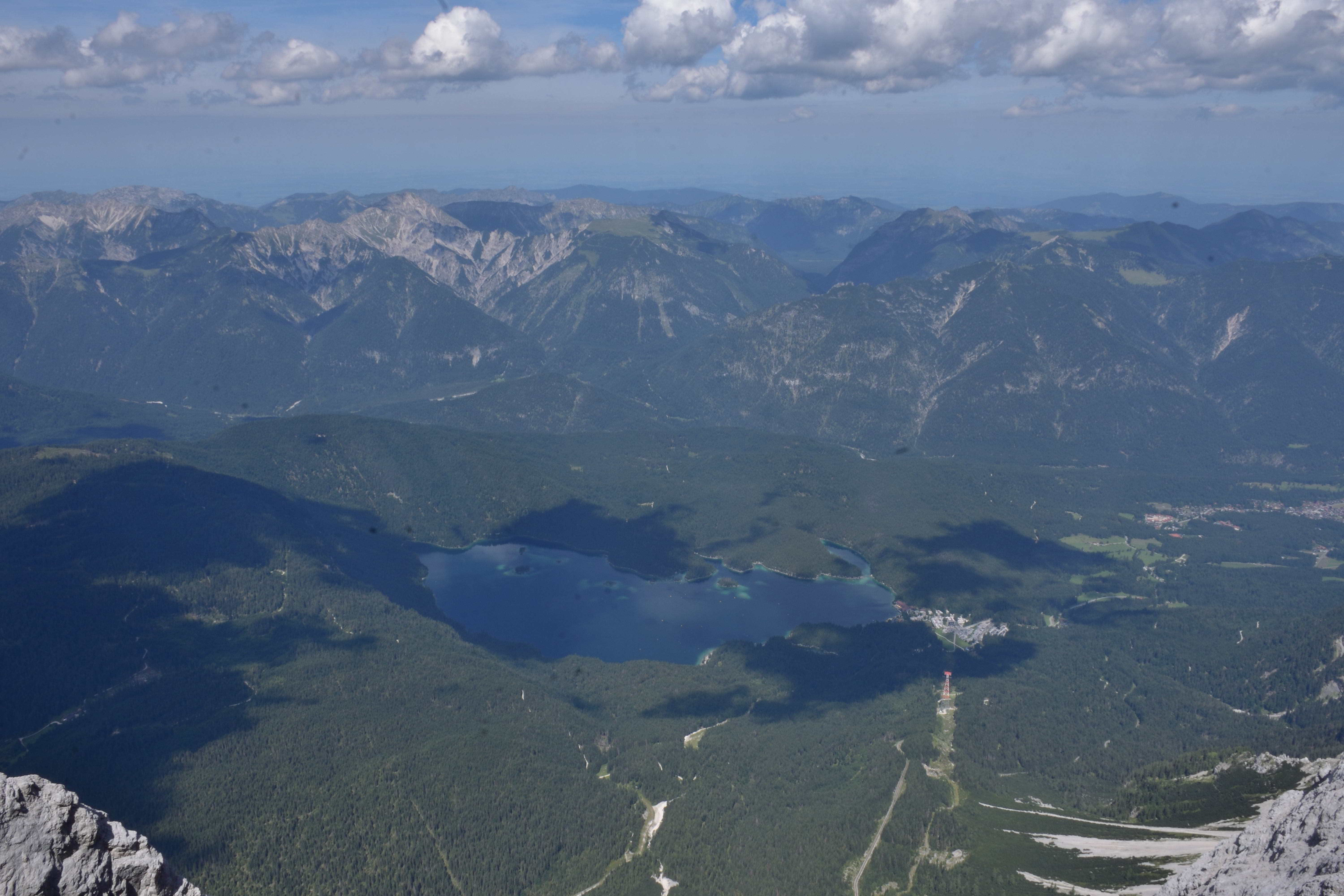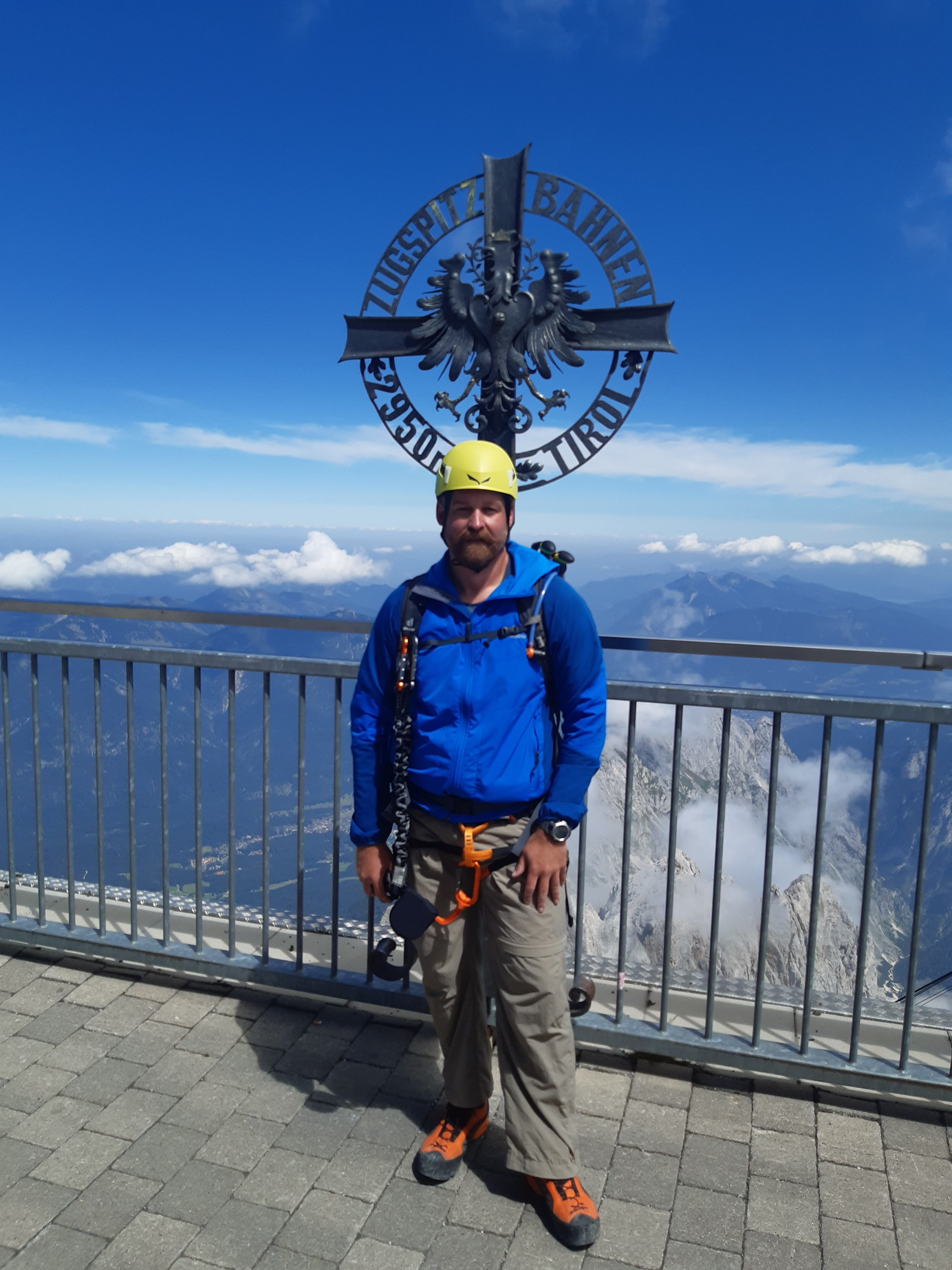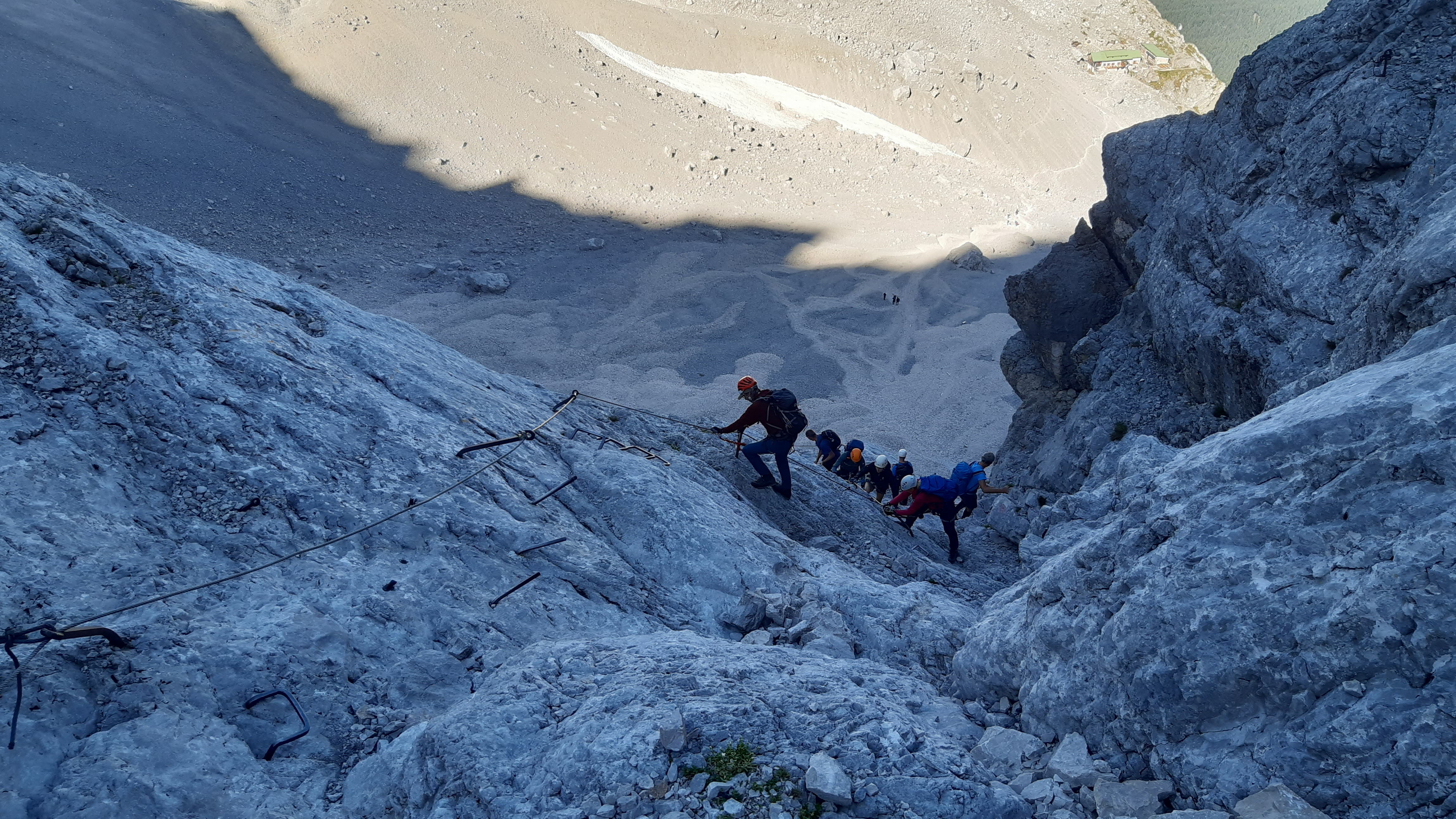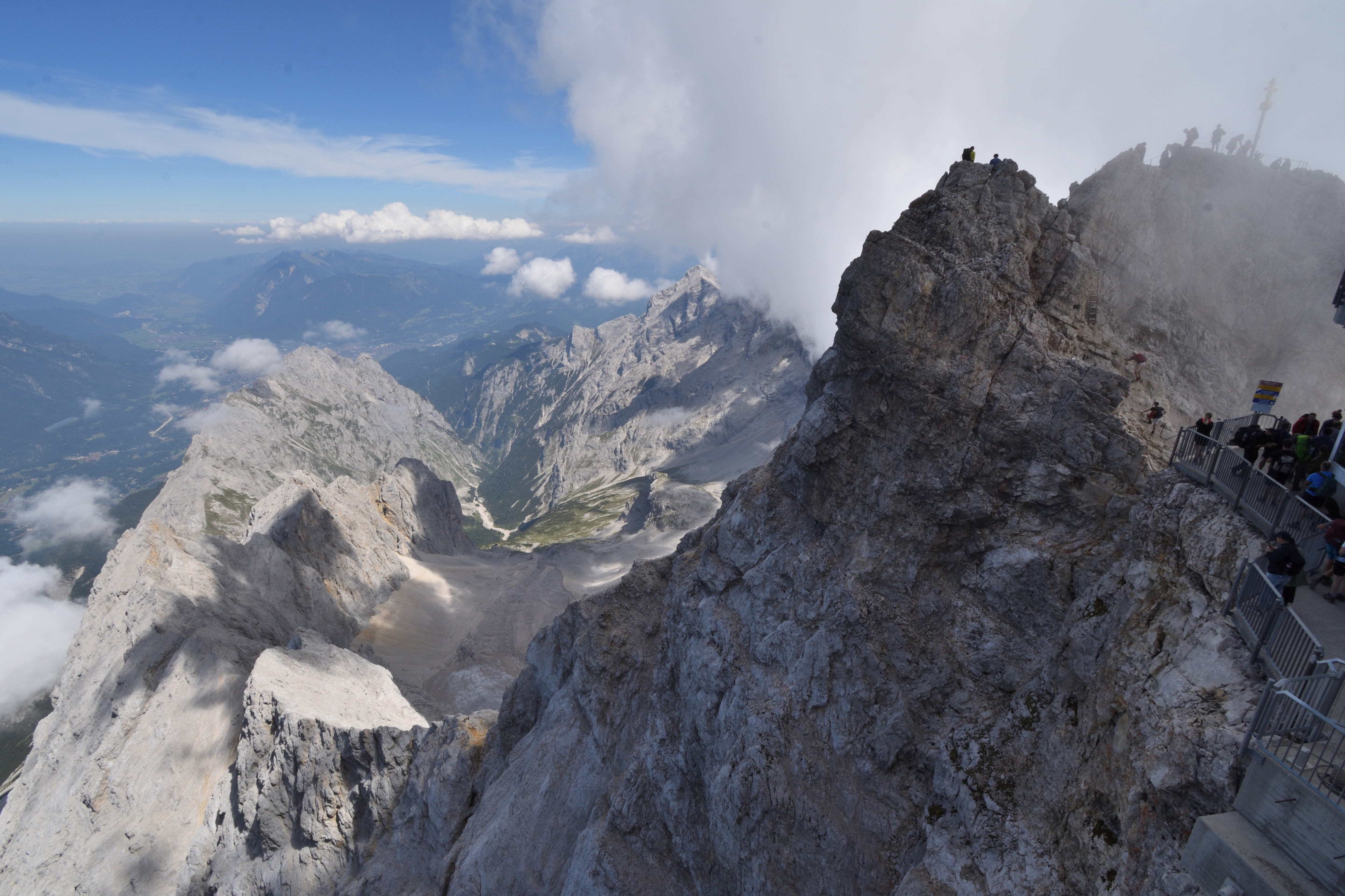 Nachdem ich meine Klettersteigausrüstung angelegt habe, geht es von der Hütte auf einem gut sichtbaren Weg über Geröll, hinüber zum Einstieg des Stopselziehers. Dabei quere ich noch ein Schneefeld. Hier beginnt der Klettersteig. Nach wenigen Metern geht es durch ein großes Felsloch und danach über etliche Tritte und Leitern sehr steil nach oben. Der Klettersteig ist an vielen Stellen drahtseilgesichert und ich seile mich an. Nach dem Stopselzieher wechseln steile Kletterpassagen mit etwas flacheren Abschnitten. Der Weg zieht sich und lässt die Beine spüren. Nach einer Weile kommt endlich die verlassene Bergstation Zugspitzkamm in Sicht. Hier mache ich eine kurze Pause und genieße die Aussicht über den zurückgelegten Weg. Dann geht es noch ein gutes Stück weiter bergauf zum Kamm. Dort mache ich erneut eine kurze Pause und genieße den Blick über das Zugspitzplatt. Der Weg führt nun nach links weiter zur Gipfelstation und zum Münchner Haus. Ich genieße die tolle Aussicht, verzichte aber auf den Gang zum deutschen Gipfelkreuz, aufgrund der langen Schlange und der voraussichtlichen 45-minütigen Wartezeit. Da der Klettersteig doch recht steil und lang ist, und ich ziemlich erschöpft bin entscheide ich mich, mit der Seilbahn ins Tal zu fahren, und habe somit auch noch etwas mehr Zeit den Rundumblick zu genießen.