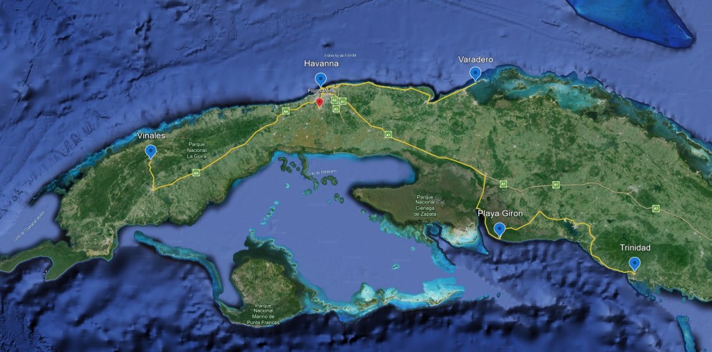 Übersichtskarte von Kuba (Ausschnitt) und die Route unserer Rundreise. Die ersten Stationen unsere Route waren Havanna und Viñales. Von dort ging es nochmal über Havana nach Trinidad und zu unserer letzten Station… Entspannung an den Traumstränden von Varadero.