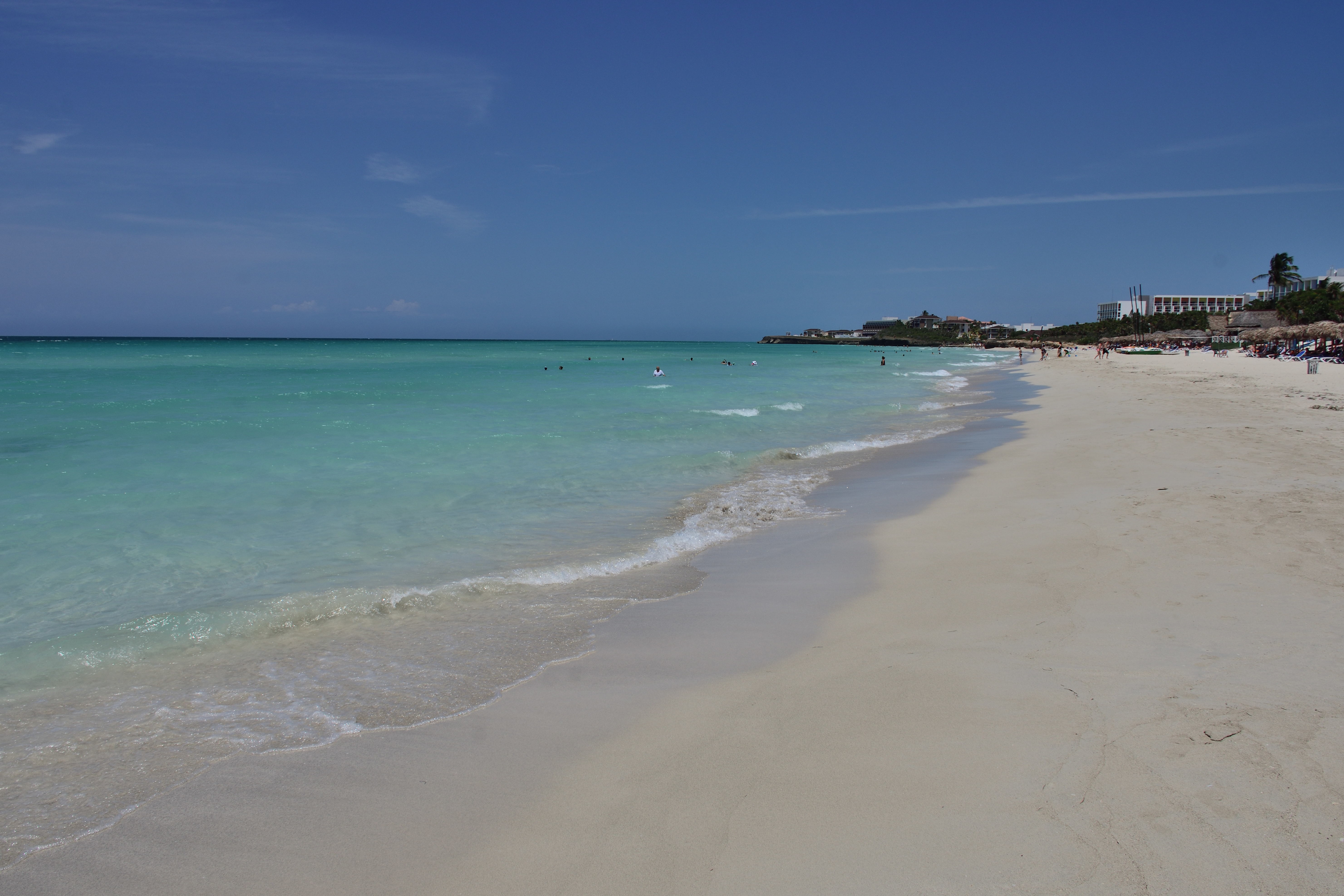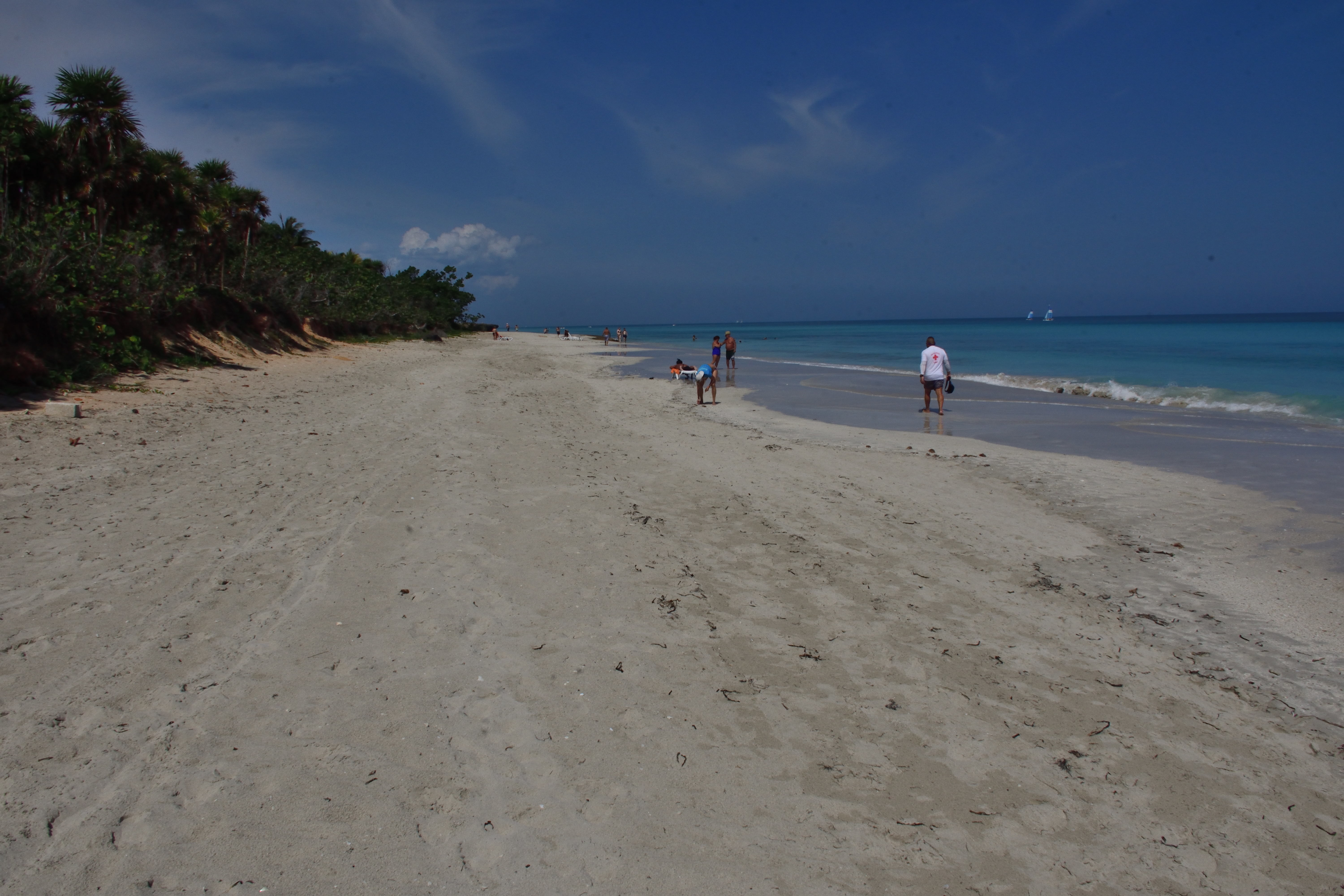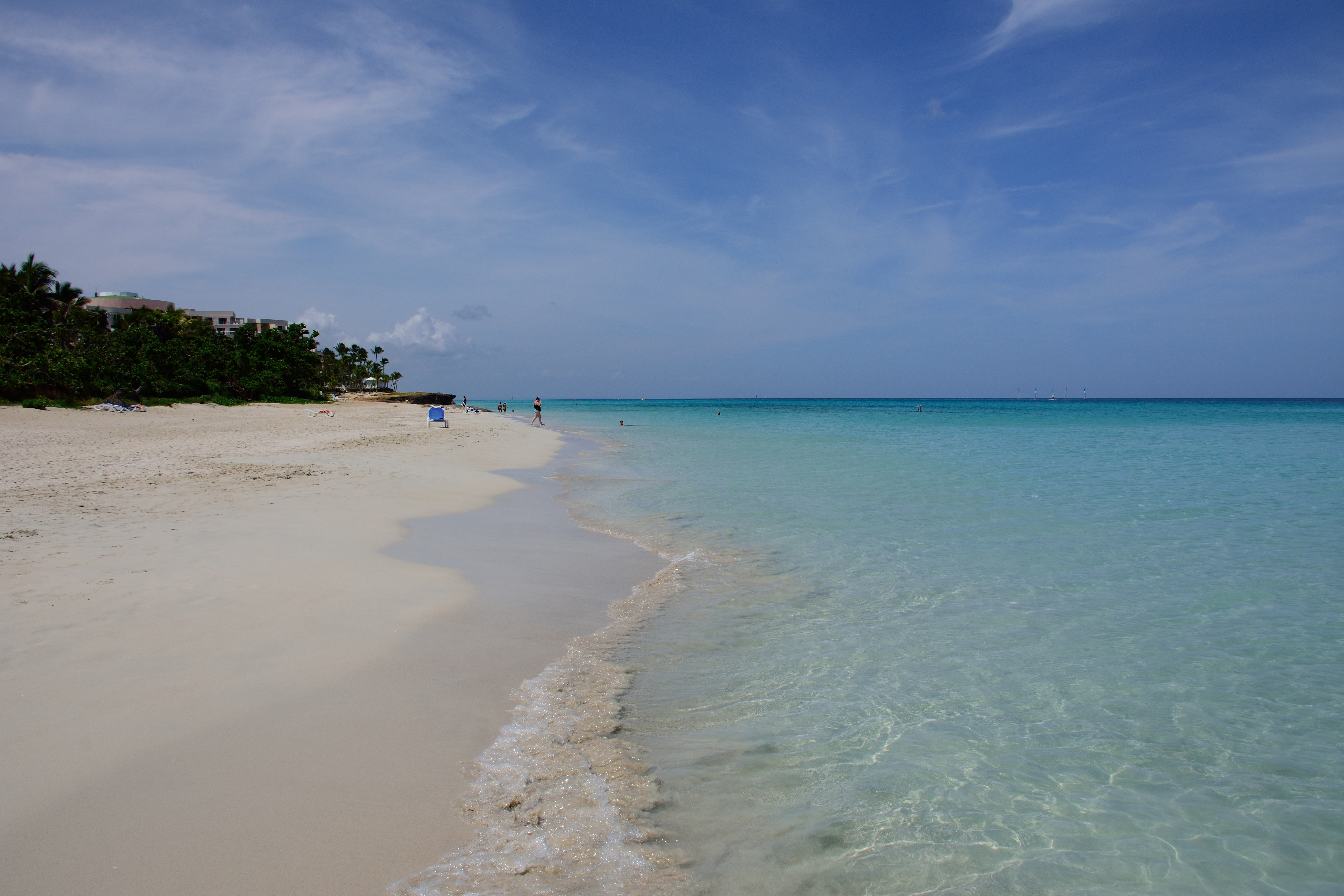 In Varadero angekommen geht es dann noch ein Stück mit dem Taxi Richtung Hotel. Die Karibik hält was sie verspricht. Unfassbar schöne Strände, kristallklares, warmes und türkisblaues Wasser, in das man einfach hineinlaufen und losschwimmen kann. Der Strandabschnitt ist lang sodass wir, trotz vieler Touristen im Hotel, immer einen recht einsamen Platz finden können. Etwa 50 Meter vor dem Strand ist nochmal eine weite Sandbank vorgelagert. Wir können dadurch sehr weit hinausschwimmen und trotzdem an einigen Stellen noch stehen. Auch gibt es hier unzählige kleine und manchmal auch größere Fische, die wir mit unserer kleinen Unterwasserkamera fotografieren können. Das Wasser ist sehr ruhig und es gibt kaum Motorsport-Aktivitäten. Daher eignet sich der Strand auch hervorragend zum Schnorcheln.