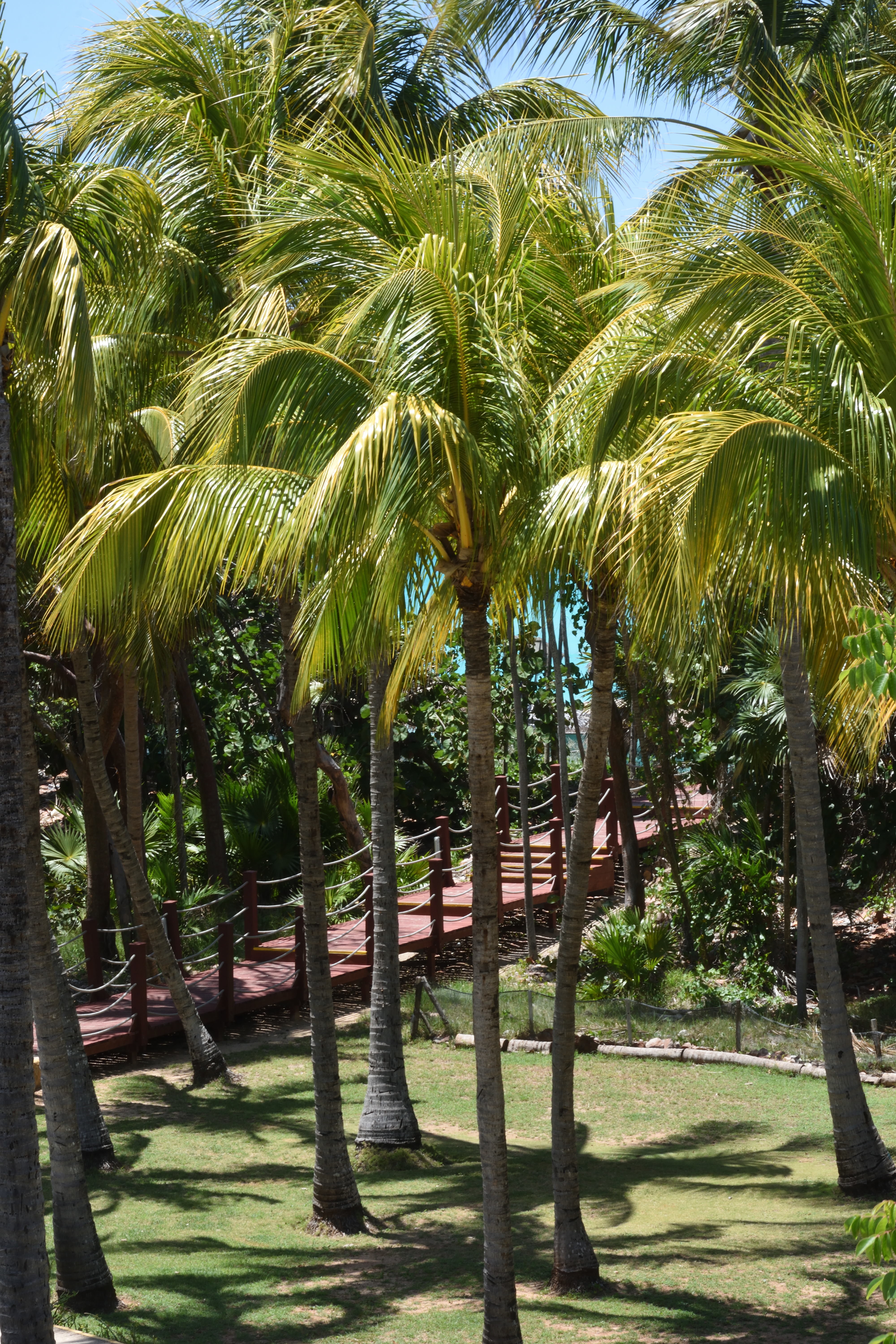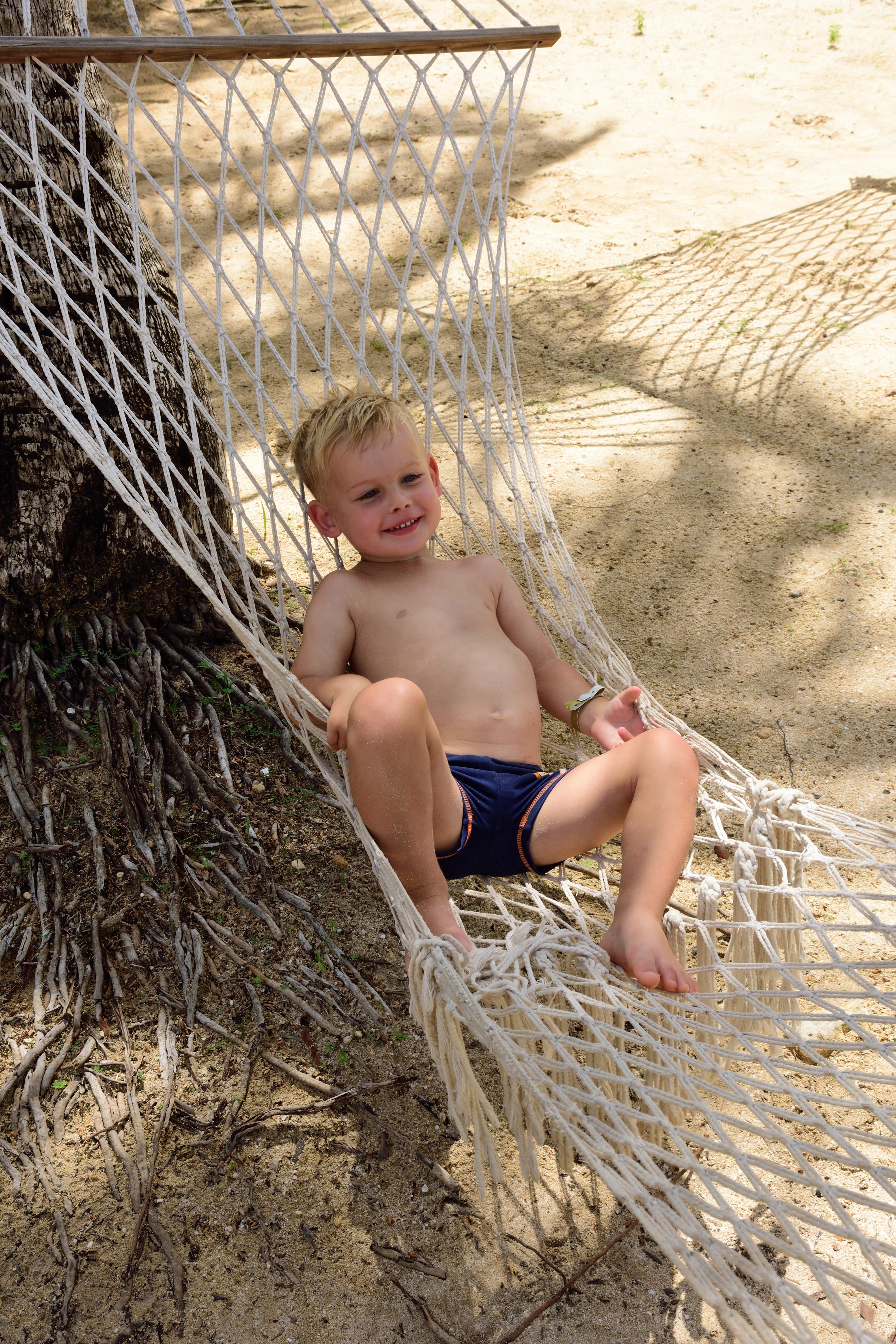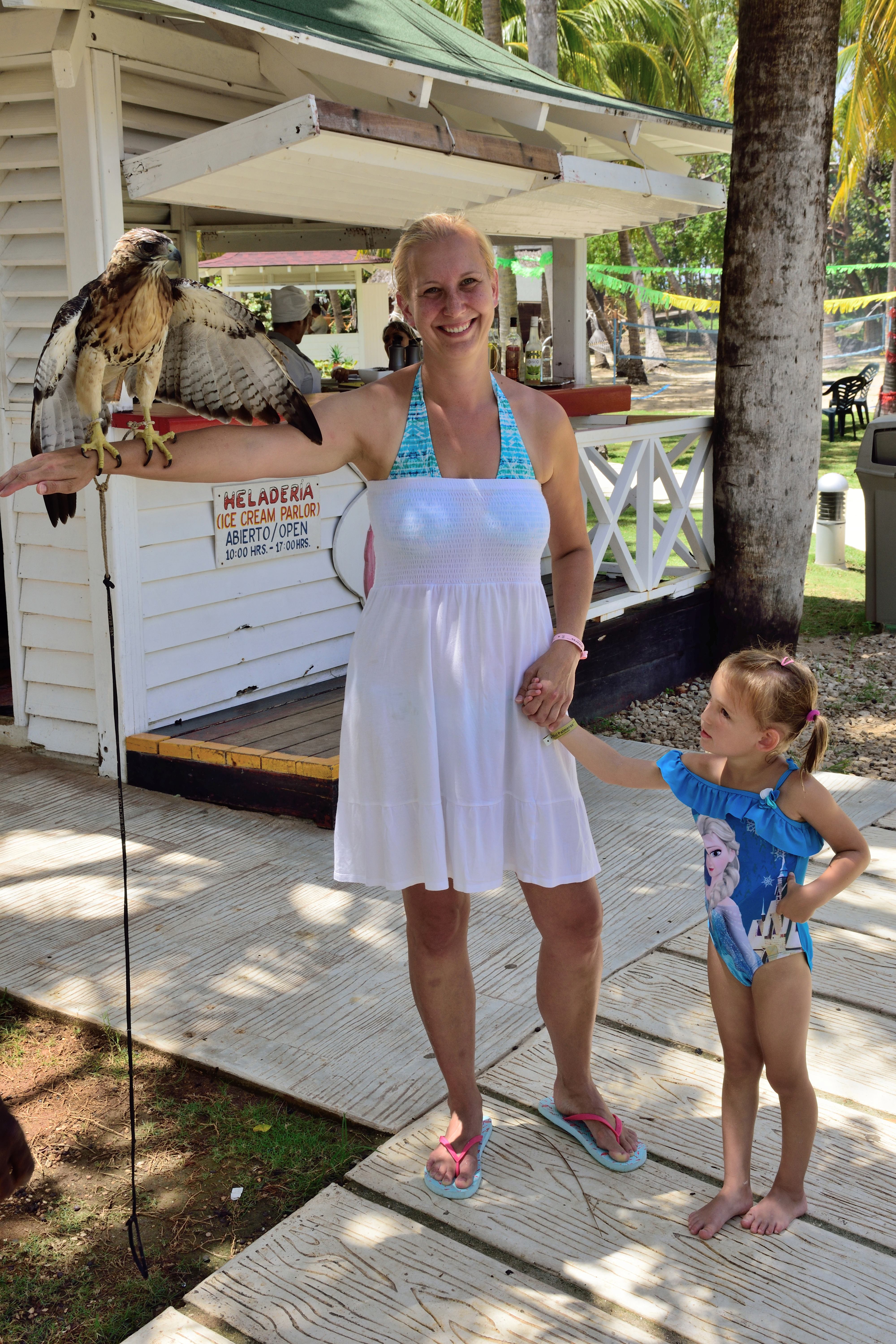 Auf der Anlage ist ein Falkner mit seinen Greifvögeln unterwegs. Bei unserem ersten Urlaub hatte ich einen großen Falken auf dem Arm, der nicht so schwer war wie vermutet. Diesmal darf Matthias einen kleinen Falken auf dem Arm halten. Die Kinder sind total fasziniert von dem winzigen Vogel, haben aber auch ziemlichen Respekt vor seinen Krallen. Wir haben herausgefunden, dass die Gärtner auf der Anlage Kokosnüsse zum Trinken verkaufen. Auf den Pfaden zum Strand muss man nur einen von Ihnen ansprechen und schon hat man eine pflückfrische Kokosnuss. Zurück auf der Liege können wir das erfrischende Kokoswasser trinken. Wenn das Fruchtfleisch schon reif ist, kann man sich die Kokosnuss im Anschluss mit der Machete zerteilen lassen, um es zu essen.