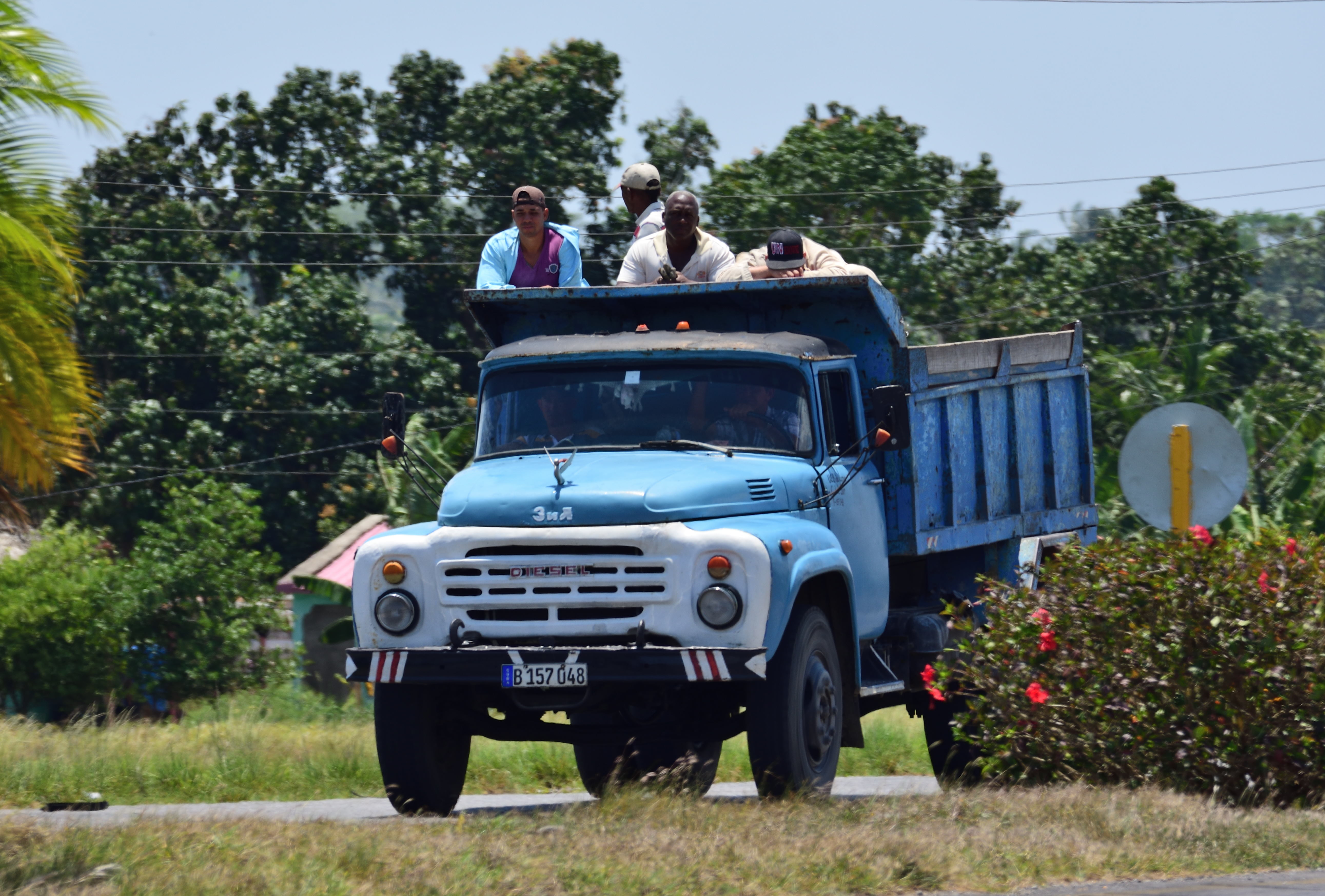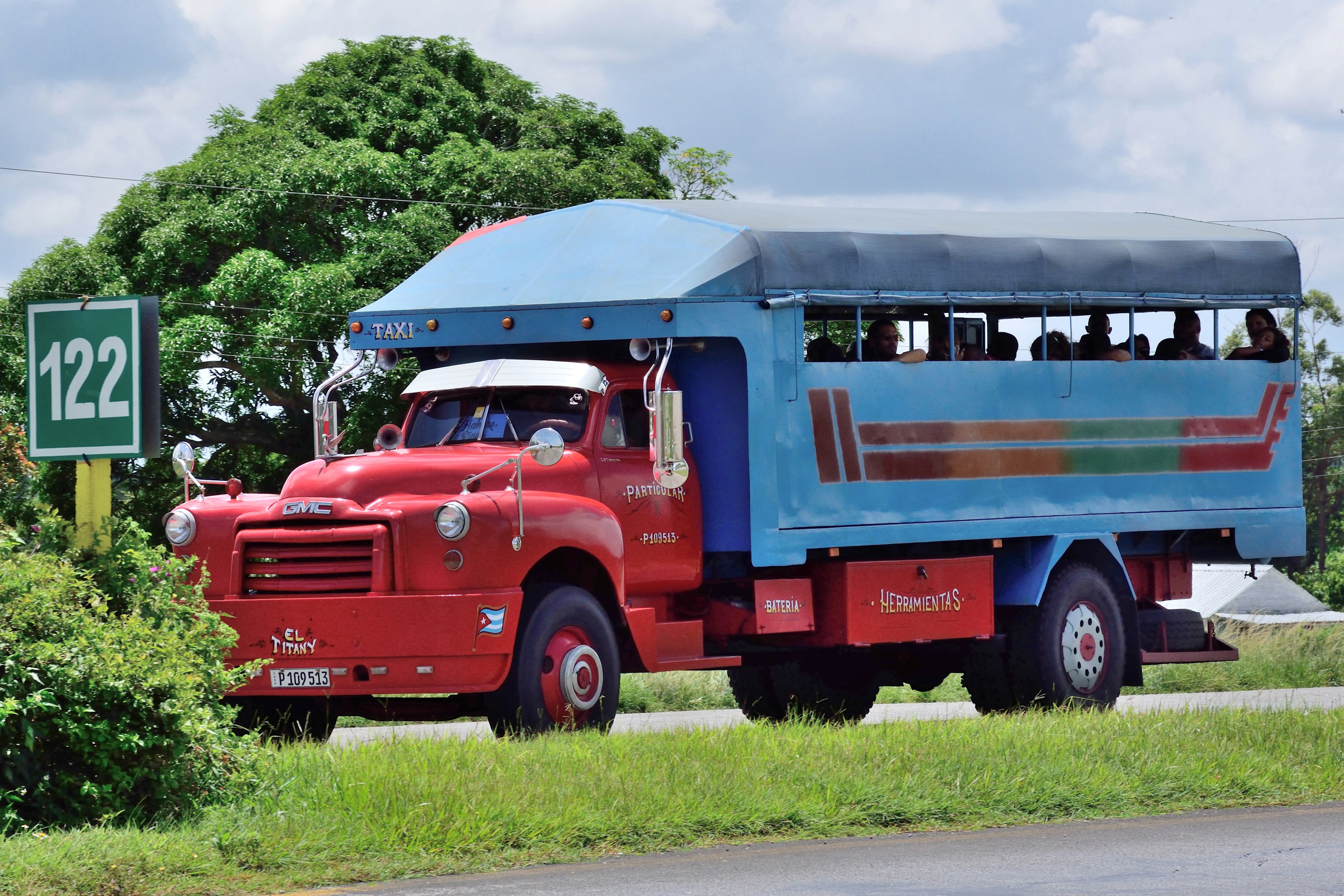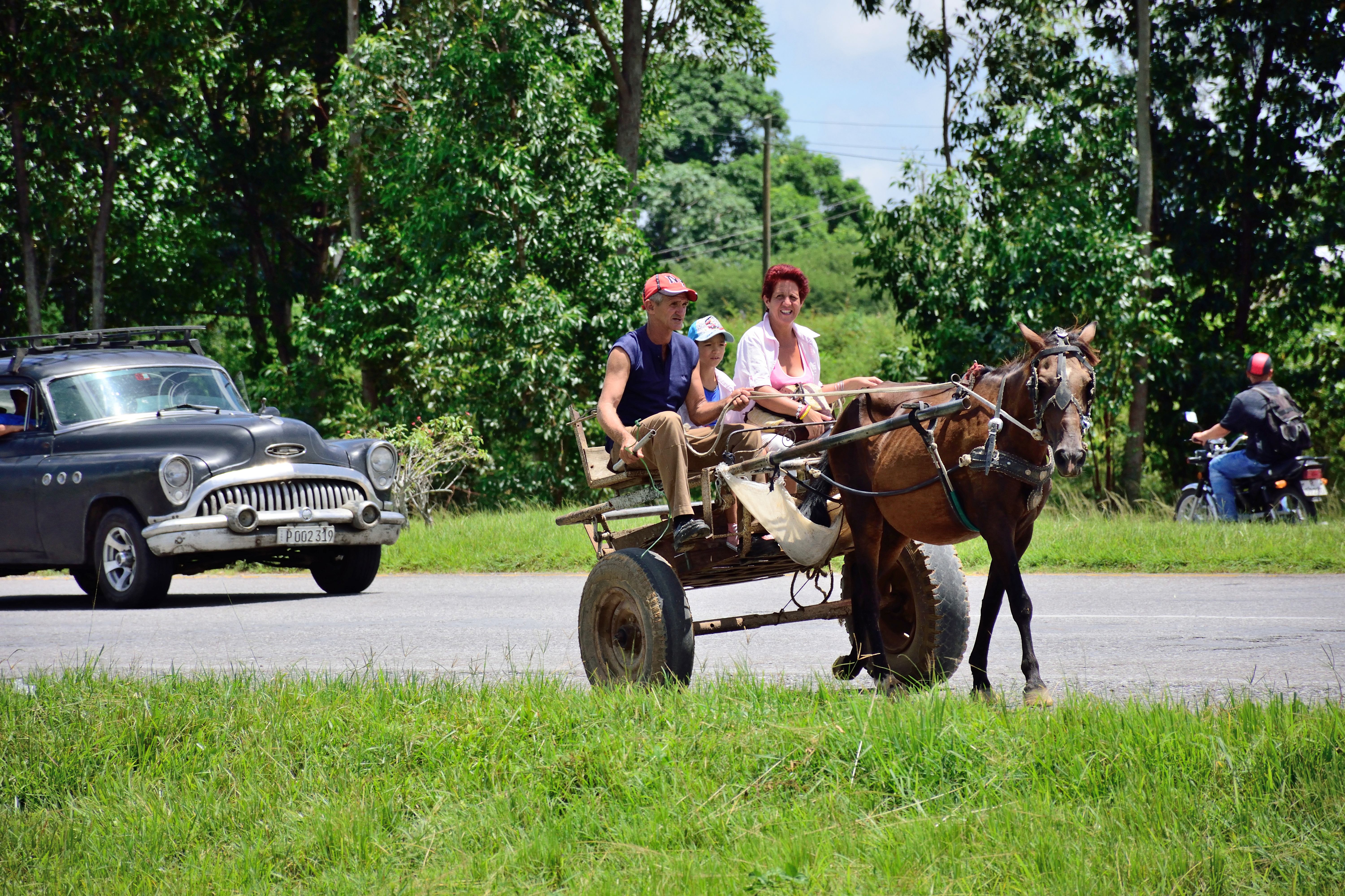 Für die Busfahrten zwischen den einzelnen Stationen haben wir das Busunternehmen Viazul ausgesucht. Hier kann man bequem vorab online von zuhause alle Busfahrten buchen. Die Reisebusse sind vollkommen in Ordnung, etwas in die Jahre gekommen und nicht so sauber, dafür aber noch sehr gut klimatisiert. Wir haben uns für die Fahrten immer Jäckchen oder Pullover eingepackt, damit wir auf den längeren Fahrten nicht frieren. Da es in den Bussen keine Toiletten gibt, machen die Fahrer zwischendurch Pausen. Manchmal gibt es hier die Möglichkeit etwas zu essen oder zu trinken zu kaufen. Die Fahrt von Havanna nach Viñales dauert 4 Std. 15 Min. Auf etwa halber Strecke machen wir eine größere Pause, an einer Art Autobahnraststätte. Die „Autobahnen“ sind doch etwas anders wie in Deutschland. Der Zustand ist meist schlecht und es gibt riesige Schlaglöcher. Auch die Verkehrsteilnehmer sind nicht autobahntypisch. Hauptsächlich fahren hier Oldtimer, alte LKW – meist mit Passagieren auf der Ladefläche, aber auch einfache, meist selbstgebaute Pferdefuhrwerke.