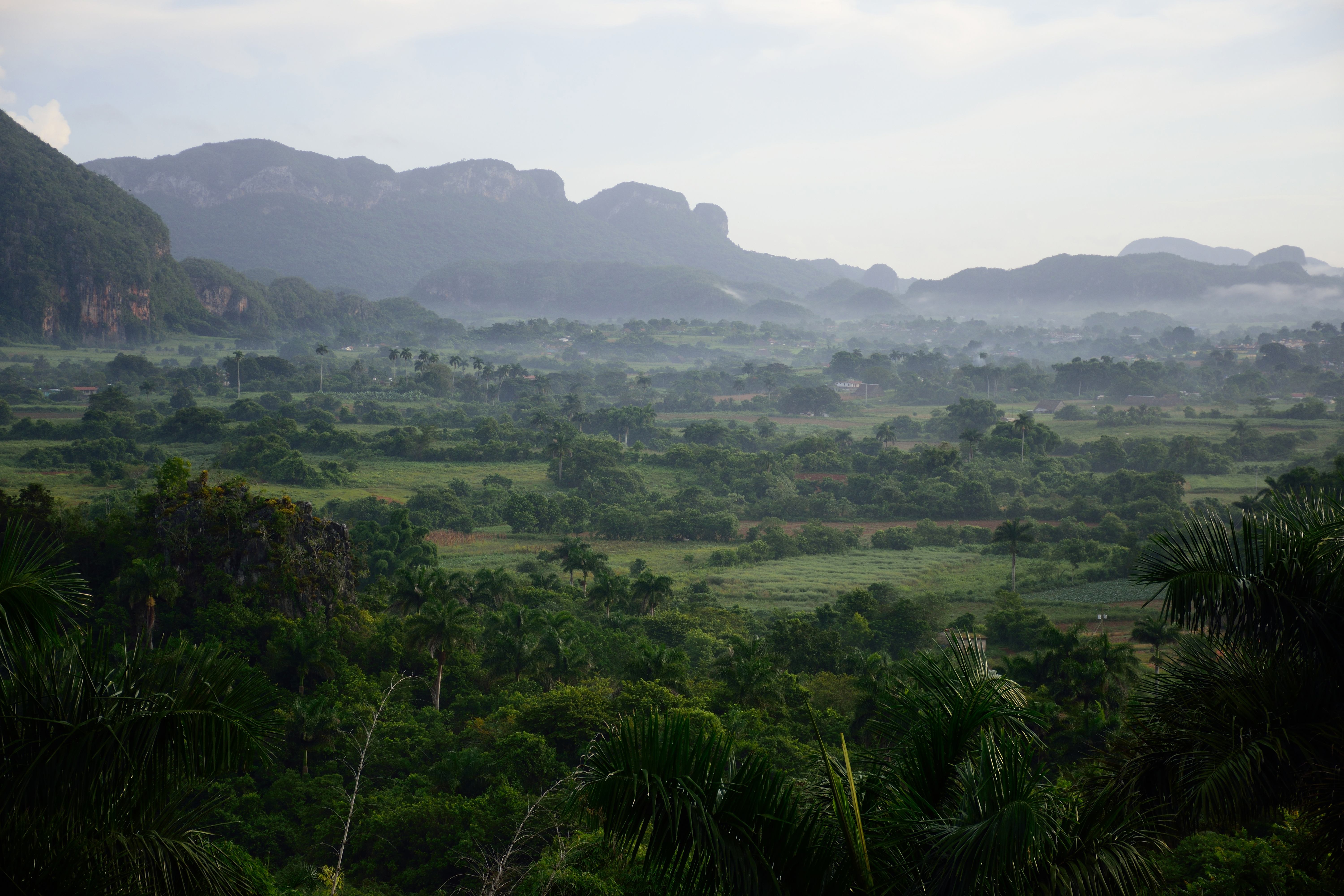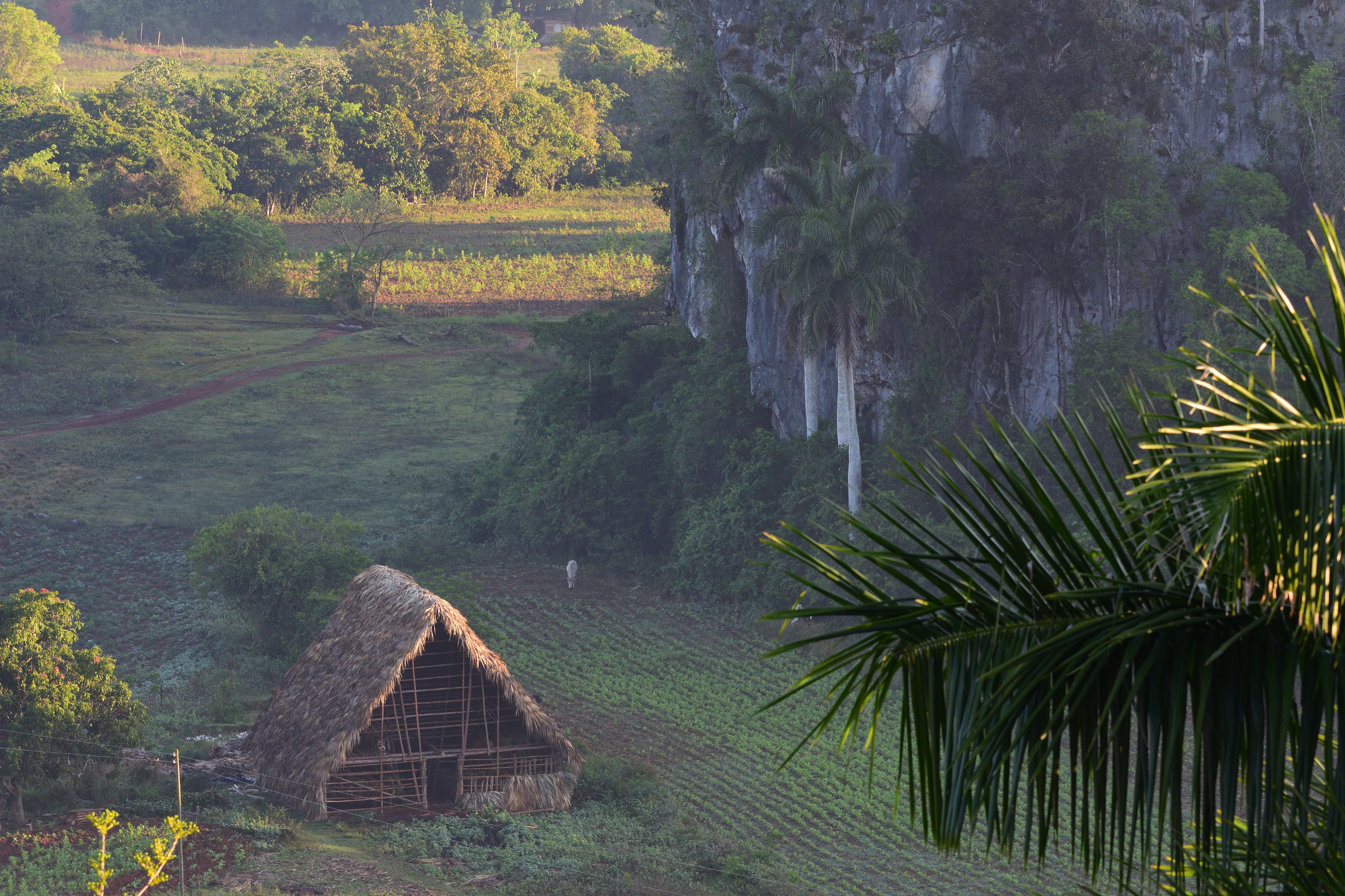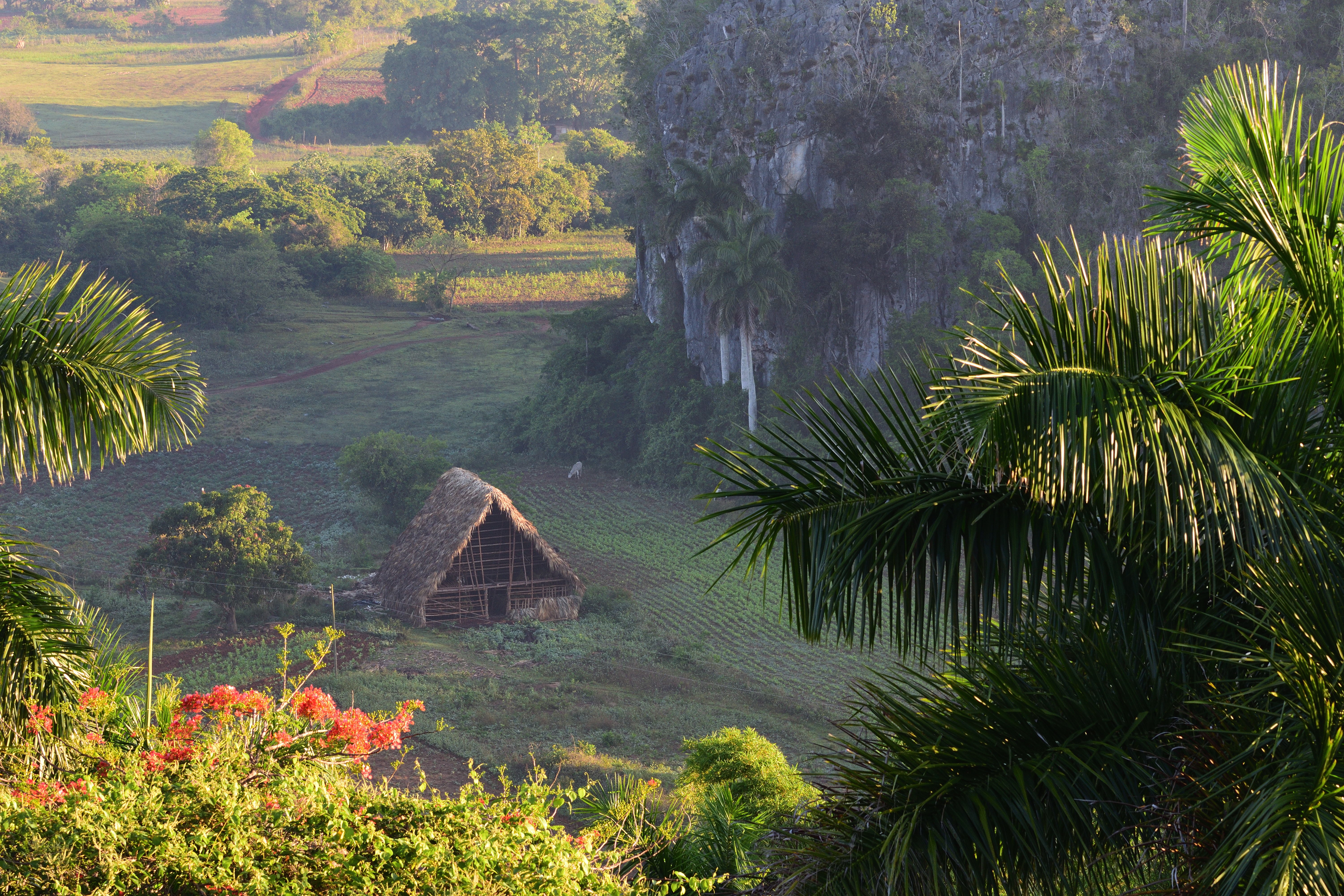 Am ersten Morgen in Viñales fahren wir früh los auf den Aussichtspunkt am Hotel Los Jazmines um diesen atemberaubenden Ausblick zu genießen und zu fotografieren. Kurz nach Sonnenaufgang liegen die Mogotes noch im Nebel. Eine Stunde später ist die Sicht auf die umliegenden Tabakplantagen in den Tälern bereits klar. Viñales gilt als Herz des besten Tabakanbaugebiets der Welt- Vuelta Abajo. Hier entstehen die besten Zigarren der Welt und das alles ohne Maschine in reiner Handarbeit.