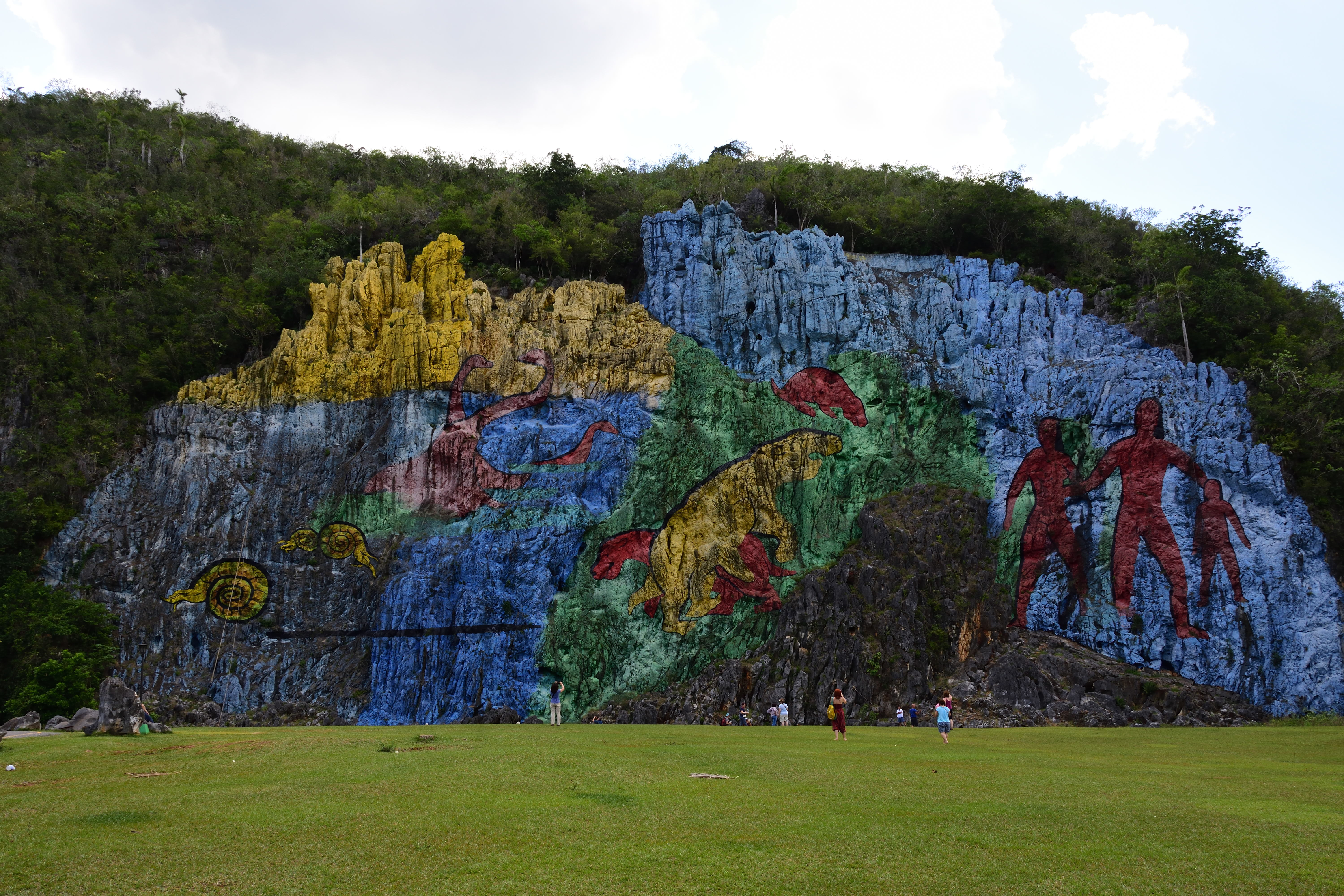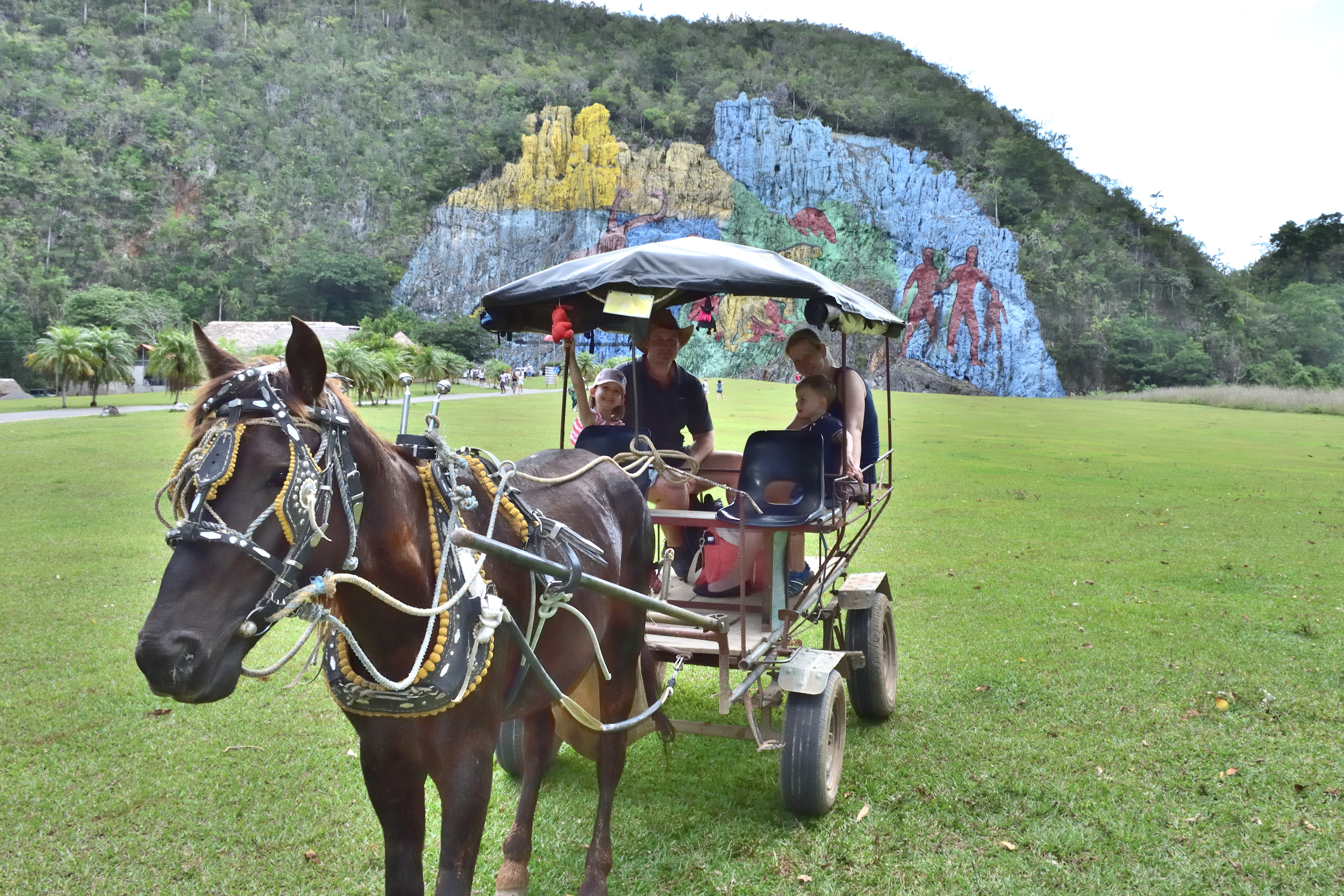 Am Nachmittag organisiert uns Yiñeris eine Kutschfahrt, die nicht weniger abenteuerlich ist als unser Ausritt zu Pferd. Eine selbst gebaute Kutsche, zum Teil aus einfachem Baustahl zusammengeschweißt, ohne Sitzpolster und Federung, dafür aber mit Radio. Wir fahren durch das Tal bis zum Mural de la Préhistoria und zur Casa de Ana. Dort gibt es ein riesiges Wandgemälde an der Felswand eines „Mogotes“. Dieses stellt in 12 Szenen die Evolutionsgeschichte des Menschen dar. Das etwa 120m hohe und etwa 160m breite Kunstwerk soll eines der größten auf der Erde sein. Auf dem „Parkplatz“ der Kutsche stehen einige Pferde und unsere Kinder dürfen, nachdem wir gefragt haben, auf den Pferden sitzen und strahlen um die Wette. Die Casa de Ana ist eine kleine Bar auf einer Anhöhe von der aus man eine fantastische Aussicht auf die umliegenden Mogotes hat.