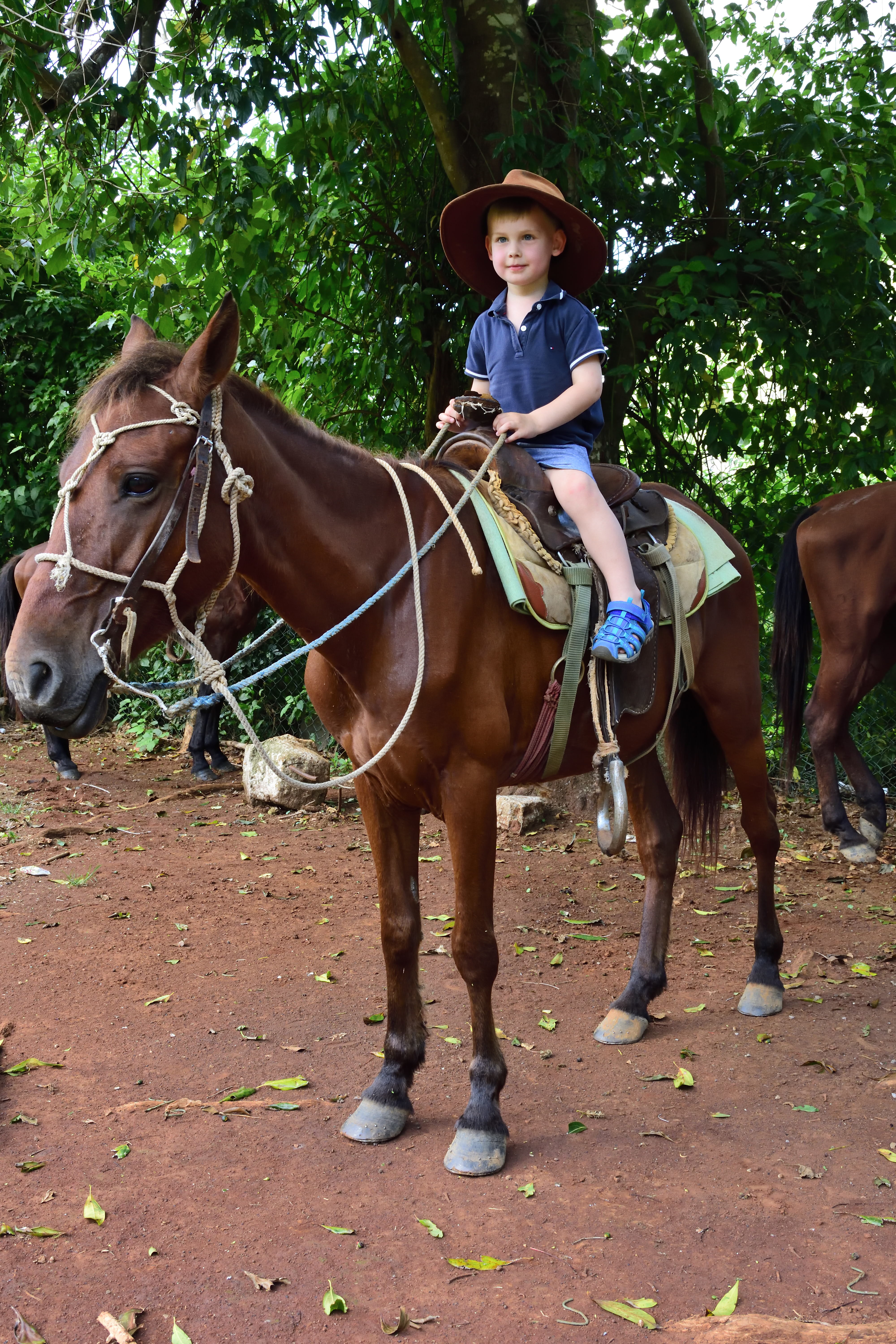 Zurück in unserer Unterkunft gibt es ein kleines Mittagessen und dann wartet das nächste Abenteuer auf uns- ein Ausritt zu Pferd durch das Viñales Tal. Unvergesslich und wunderschön. Wir nehmen die Kinder jeweils vor uns auf den Sattel und schon geht es los. Der Ausritt geht durch wildes, teils steiles Gelände, durch Wasser- und Schlammlöcher in denen die Pferde bis zum Bauch einsinken.