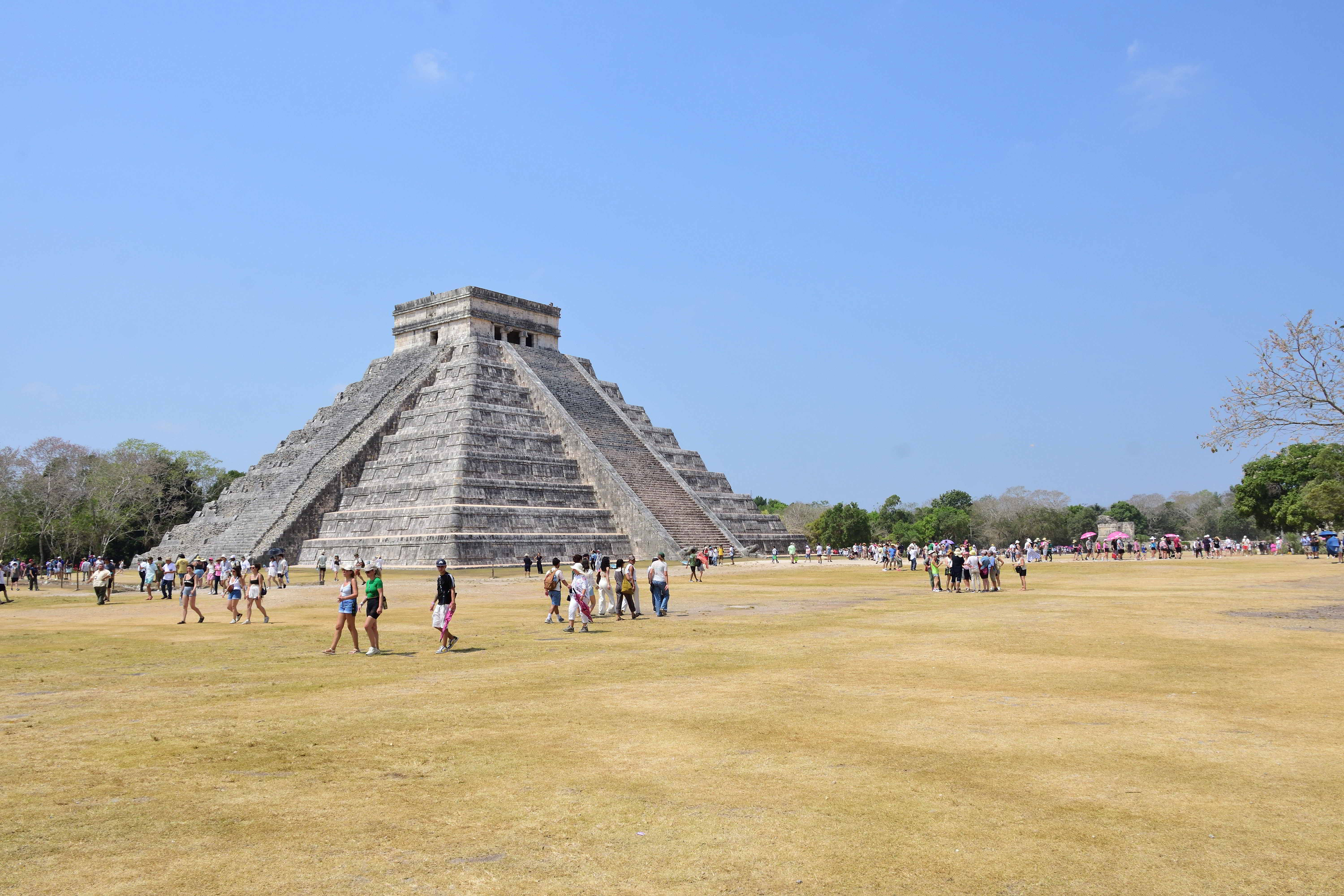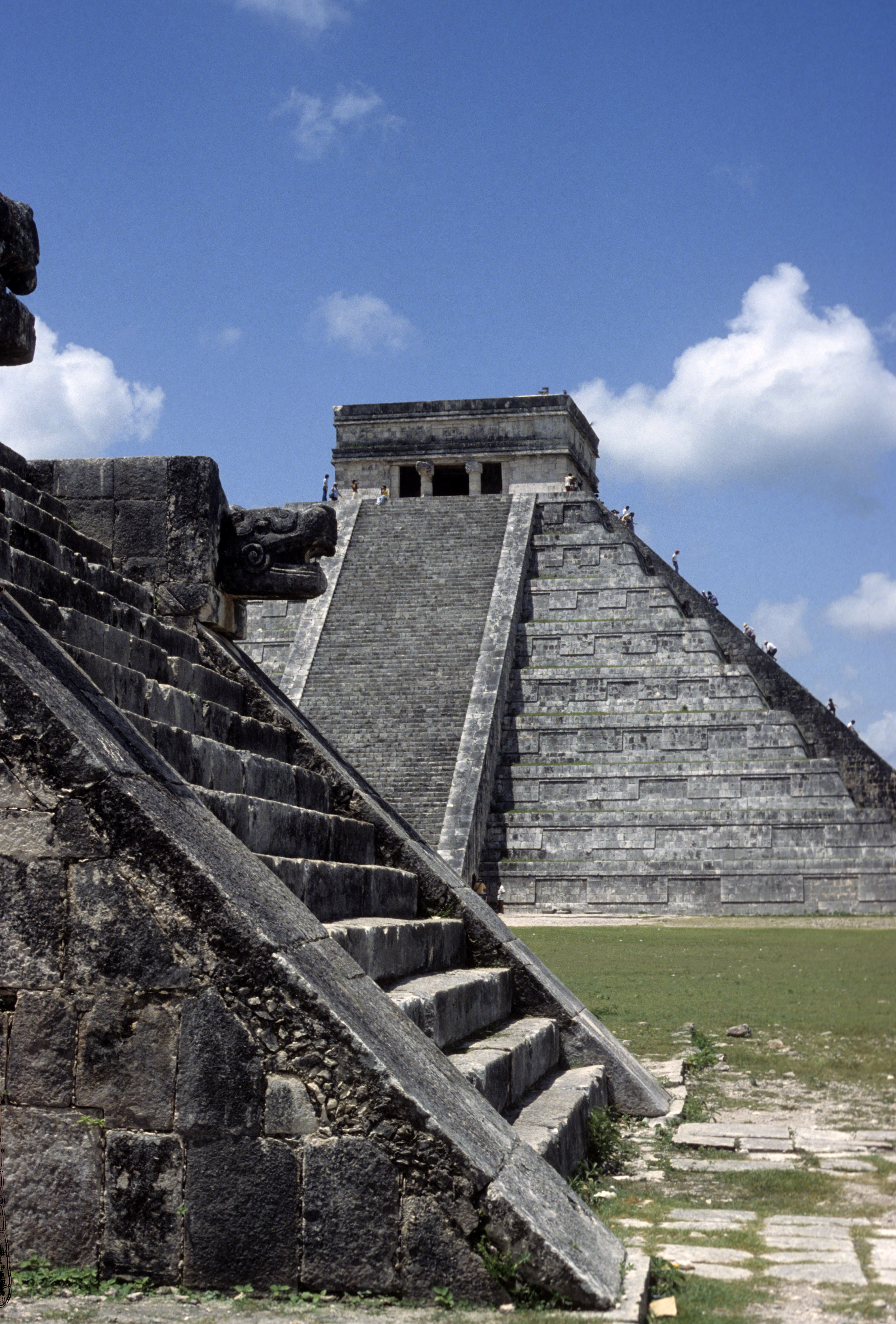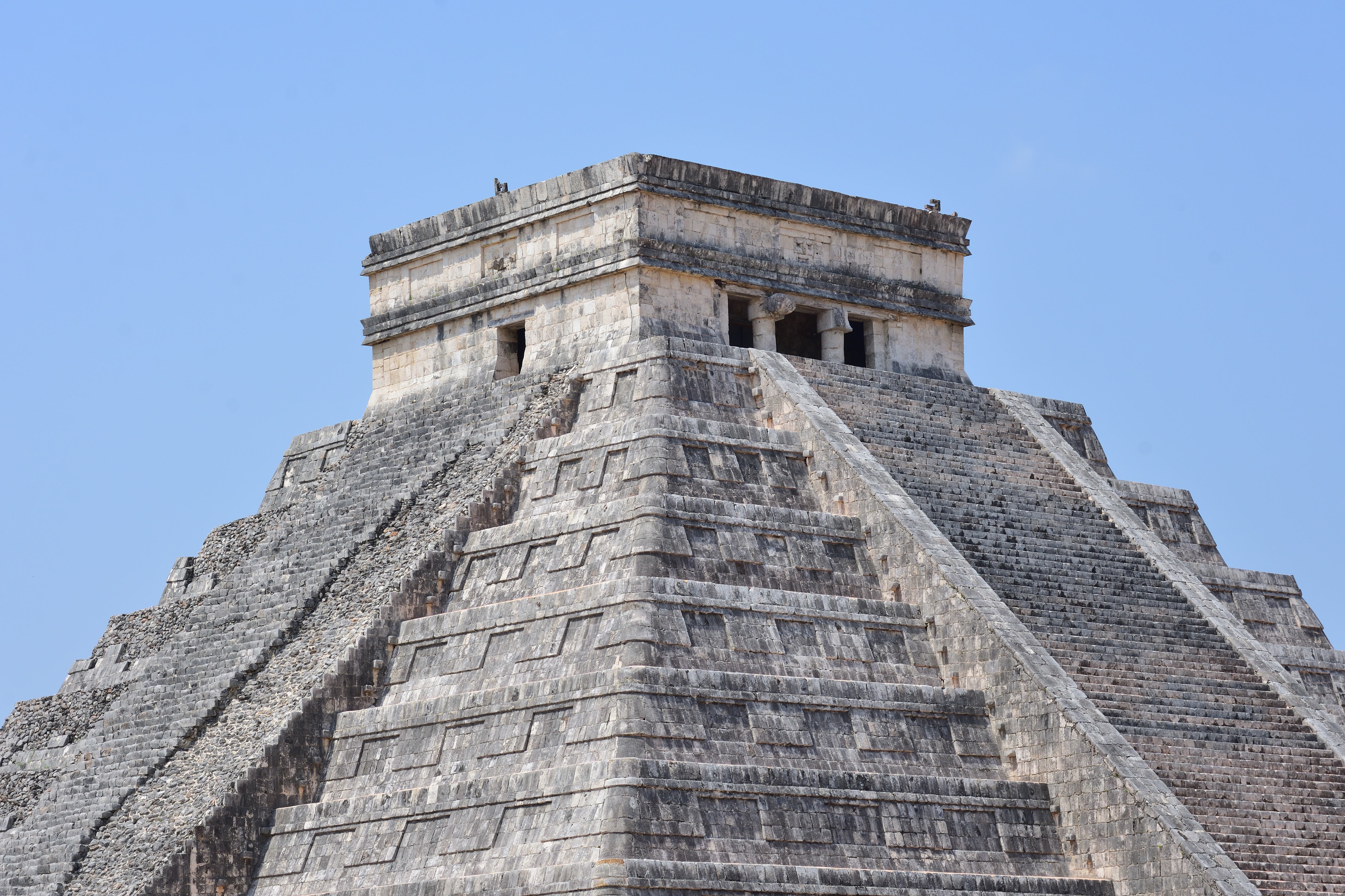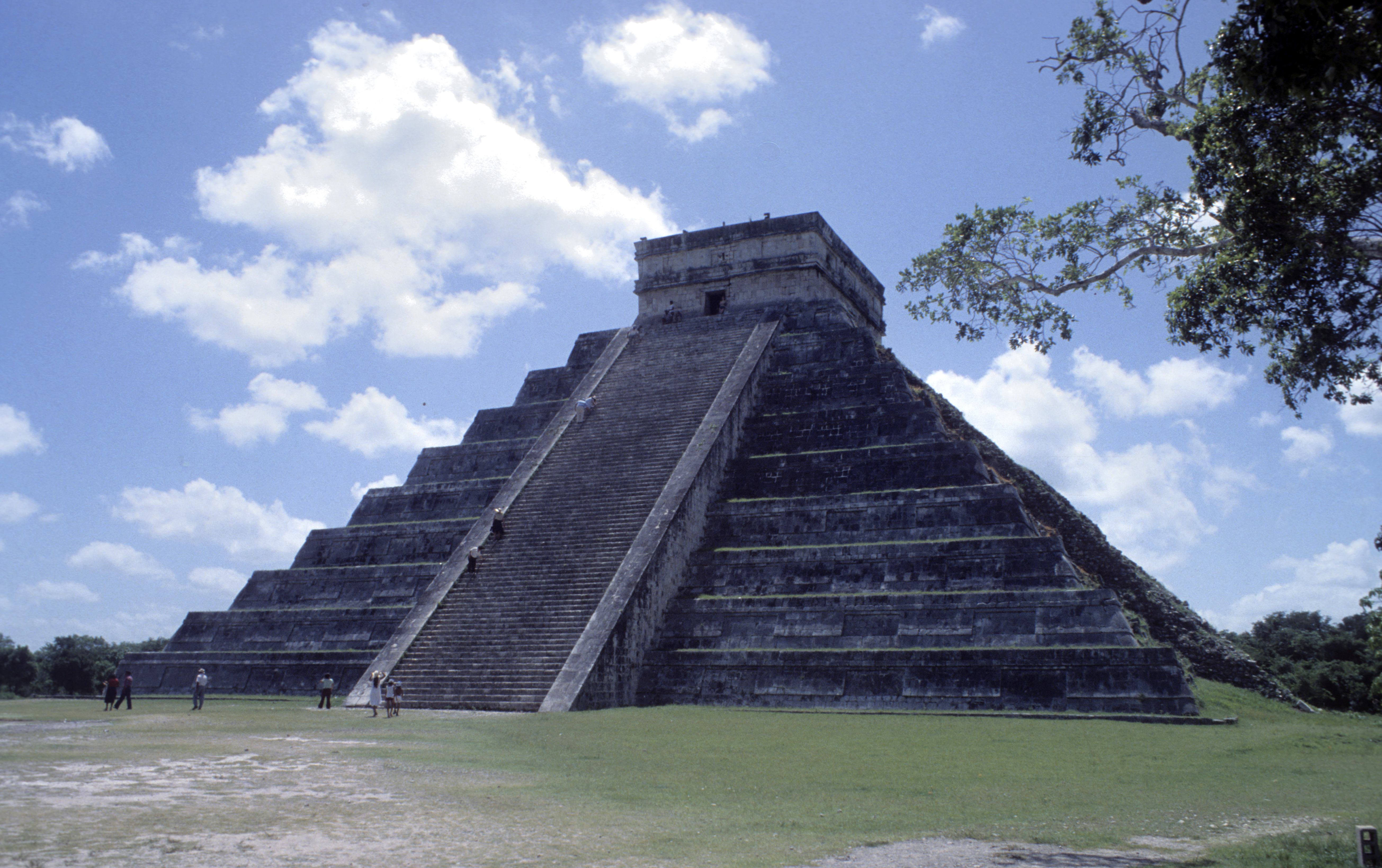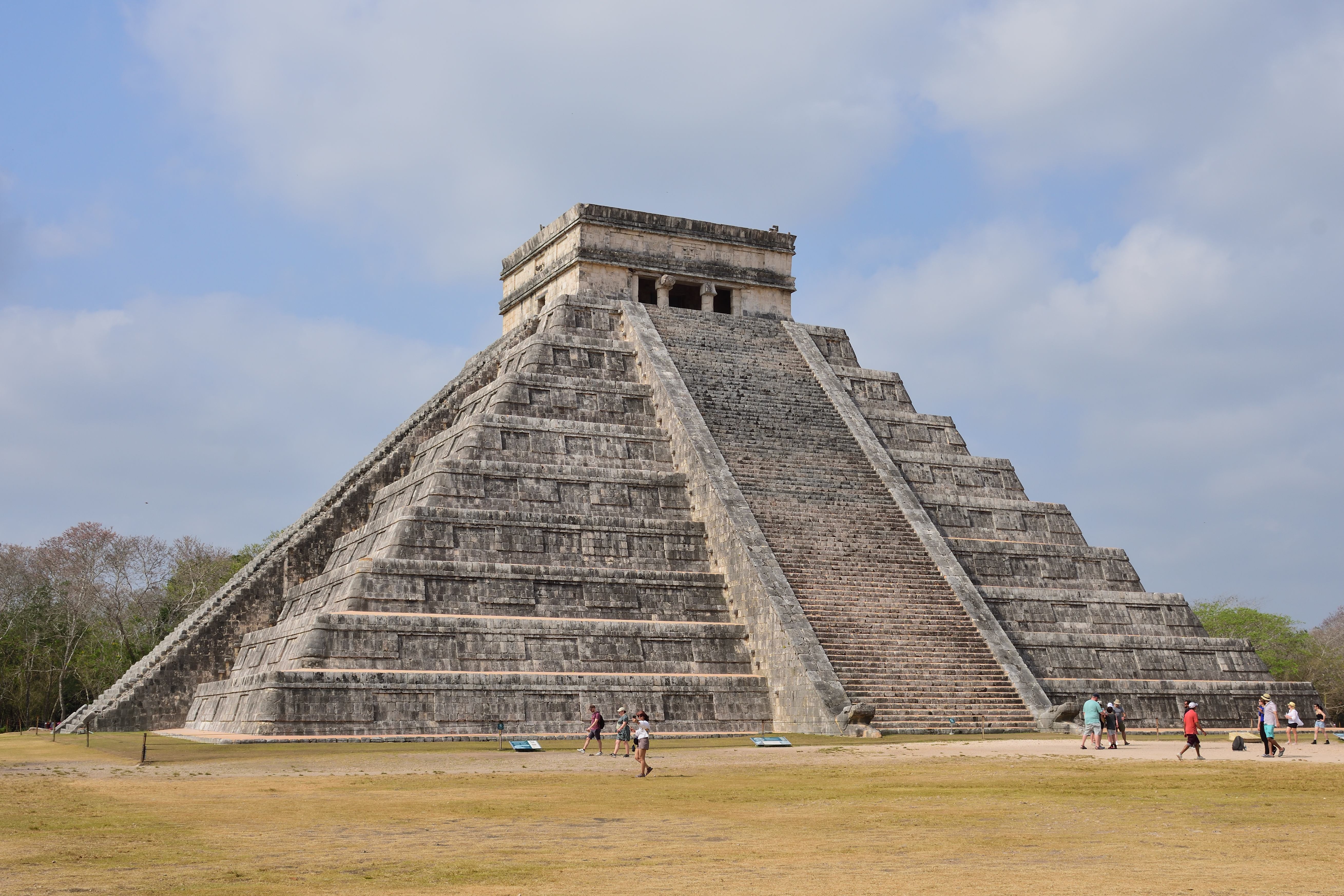 In Chichén Itzá befindet sich das wohl bekanntestes Bauwerk der Maya, die Pyramide des Kukulkan oder auch El Castillo, in deren Inneren mindestens ein Vorgängerbau verborgen ist. Die Pyramide ist 30 m hoch, hat eine quadratische Grundfläche mit knapp 60 m Seitenlänge und erhebt sich in neun abgeschrägten Pyramidenstufen. Die Treppen an allen vier Seiten umfassen 365 Stufen, entsprechend der Anzahl der Tage des Maya Kalenders. Drei Treppen zählen 91 Stufen und die nördliche Treppe zählt 92 Stufen. Die C- Datierung eines Türbalkens auf dem Pyramidentempel lassen auf eine ungefähre Erbauung um 850 n. Chr. schließen. Bemerkenswert ist das „Schauspiel der gefiederten Schlange“, dass alljährlich zur Tagundnachtgleiche auf der Nordseite zu sehen ist. Der Schatten der gestuften und leicht abgeschrägten Pyramidenkanten fällt dabei auf die Seitenwange einer der Treppen. Dabei entsteht der Eindruck, als würde sich dort eine Schlange hinunterwinden. Dies ist wohl auch der Grund, warum nur die nördliche Treppe in zwei steinernen Schlangenköpfen endet. Man geht davon aus, dass schon den Erbauern dieses Phänomen bekannt war, und sie mit der Wahl der unterschiedlichen Neigungswinkel von Pyramide und Treppe darauf hingearbeitet haben. Eine weitere Besonderheit besteht in der Bauakustik. Stellt man sich vor eine der vier Treppen und klatscht in die Hände, hört man ein Echo, welches dem Ruf einer Krähe entspricht. Da die Maya-Bauwerke weitere akustische Besonderheiten aufweisen geht man davon aus, dass auch diese Effekte absichtlich beim Bau berücksichtigt wurden.