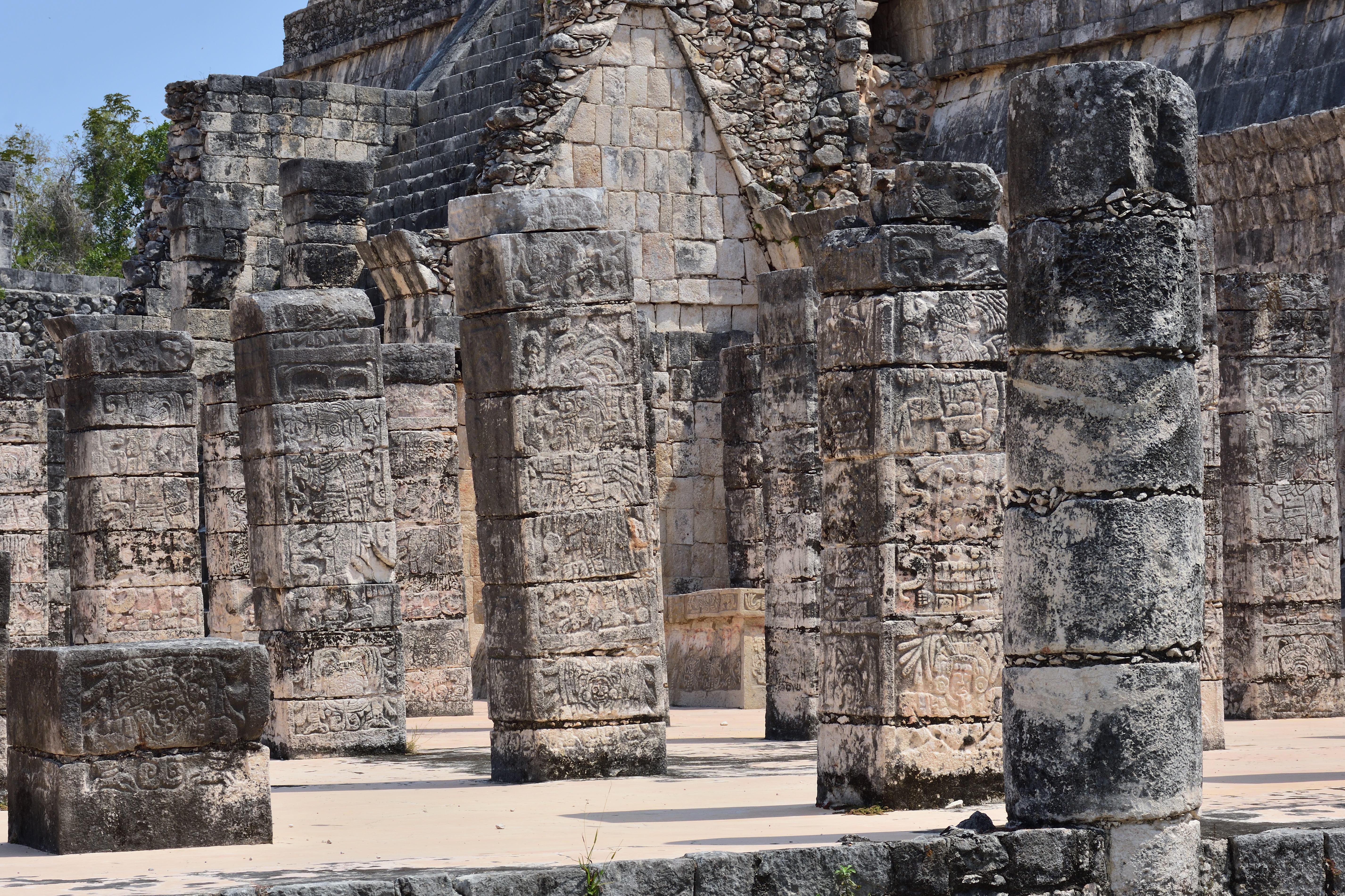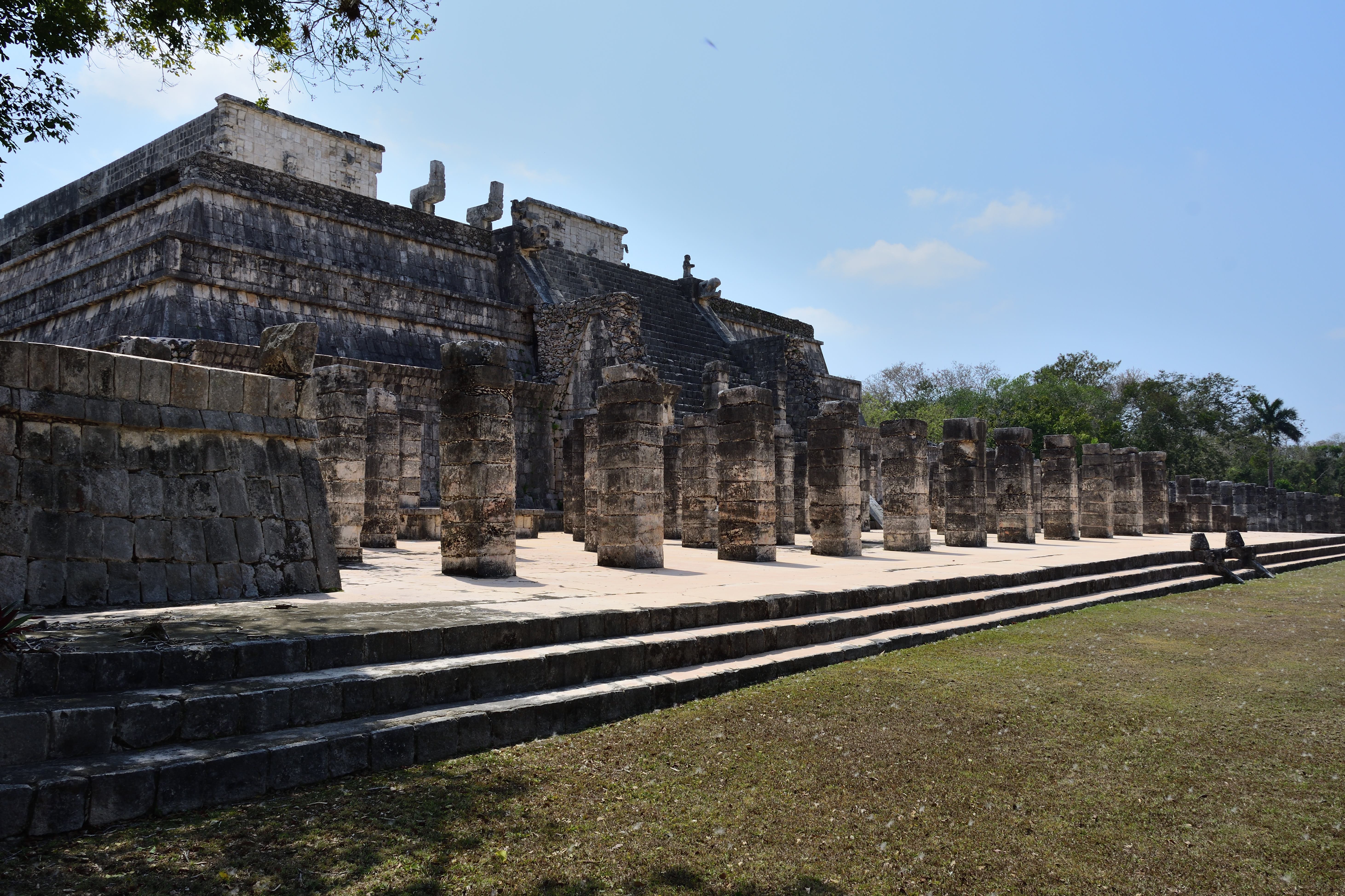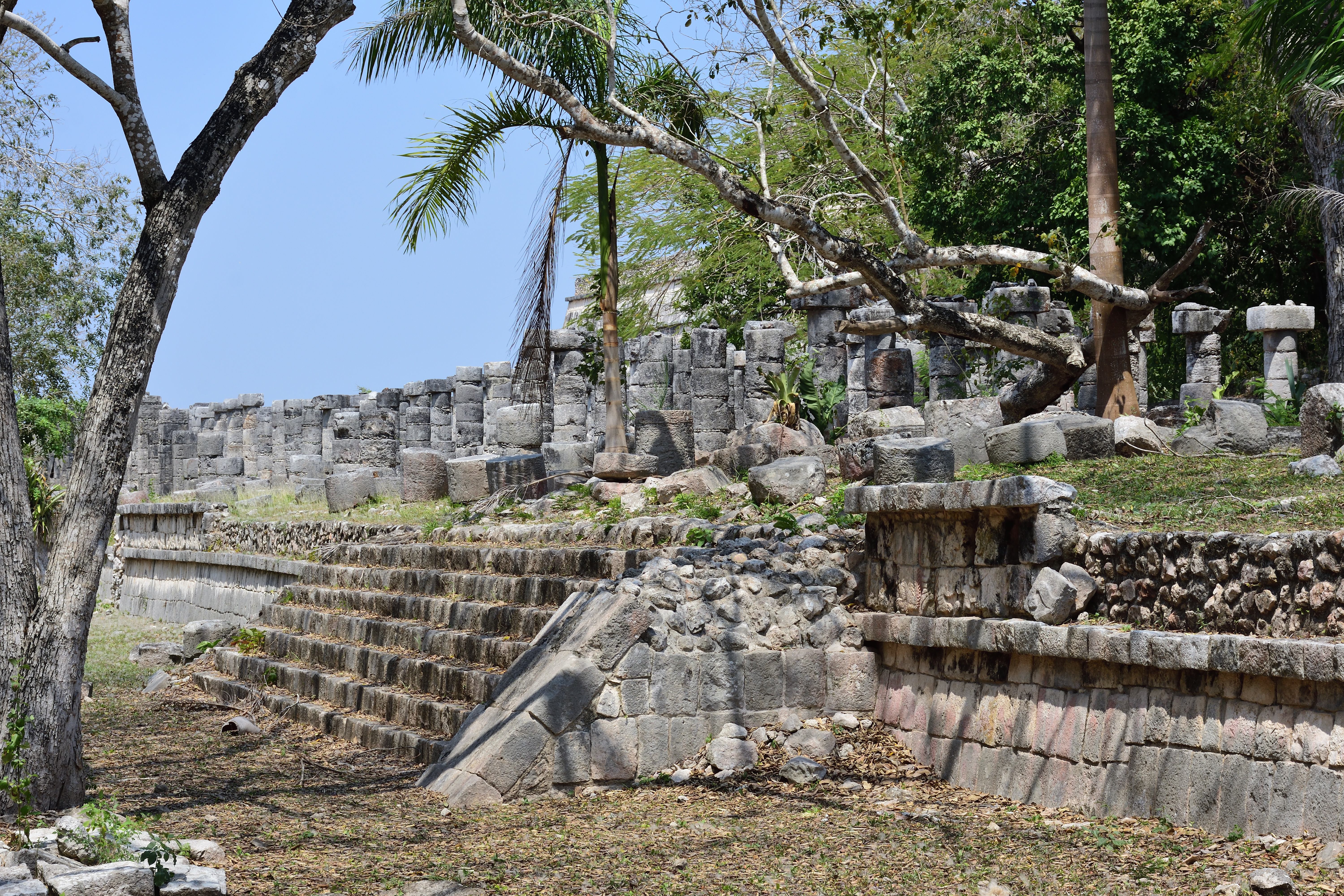 Vor und entlang der Südwand der Tempelpyramide verläuft eine prunkvolle Säulenhalle, bestehend aus vier Flügeln, die sich weiter nach Osten erstreckt und einen großen Hof von drei Seiten umgibt. Sie ist Teil der Halle der 1000 Säulen (Grupo de las Mil Columnas). Südlich und östlich des Kriegertempels verläuft eine ursprünglich mit Maya-Gewölben überdeckte Säulenhalle. Sie ist überall eingestürzt, da die Holzbalken, die die Pfeiler überspannten, verrottet sind. Die Pfeiler aus quadratischen Steinblöcken sind meist allseitig mit aufwendigen Reliefs versehen. Sie zeigen Krieger in toltekischer Tracht und Ausrüstung, sowie Darstellungen von Schlangen und des Vogelmenschen. Aufgrund der Architektur und der Darstellungen in den Steinreliefs geht man davon aus, dass die Hallen zur Versammlung von Kriegern genutzt wurden.