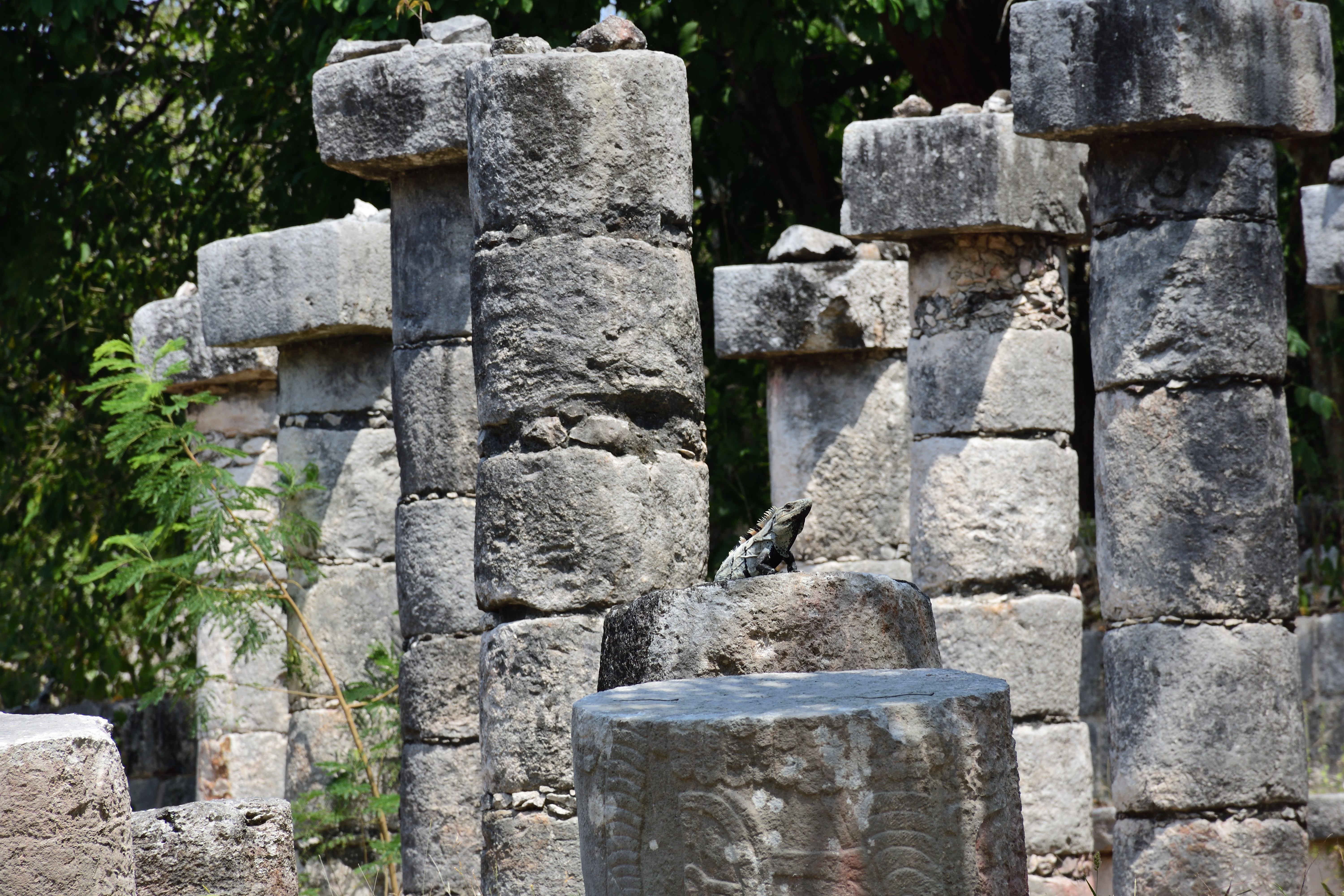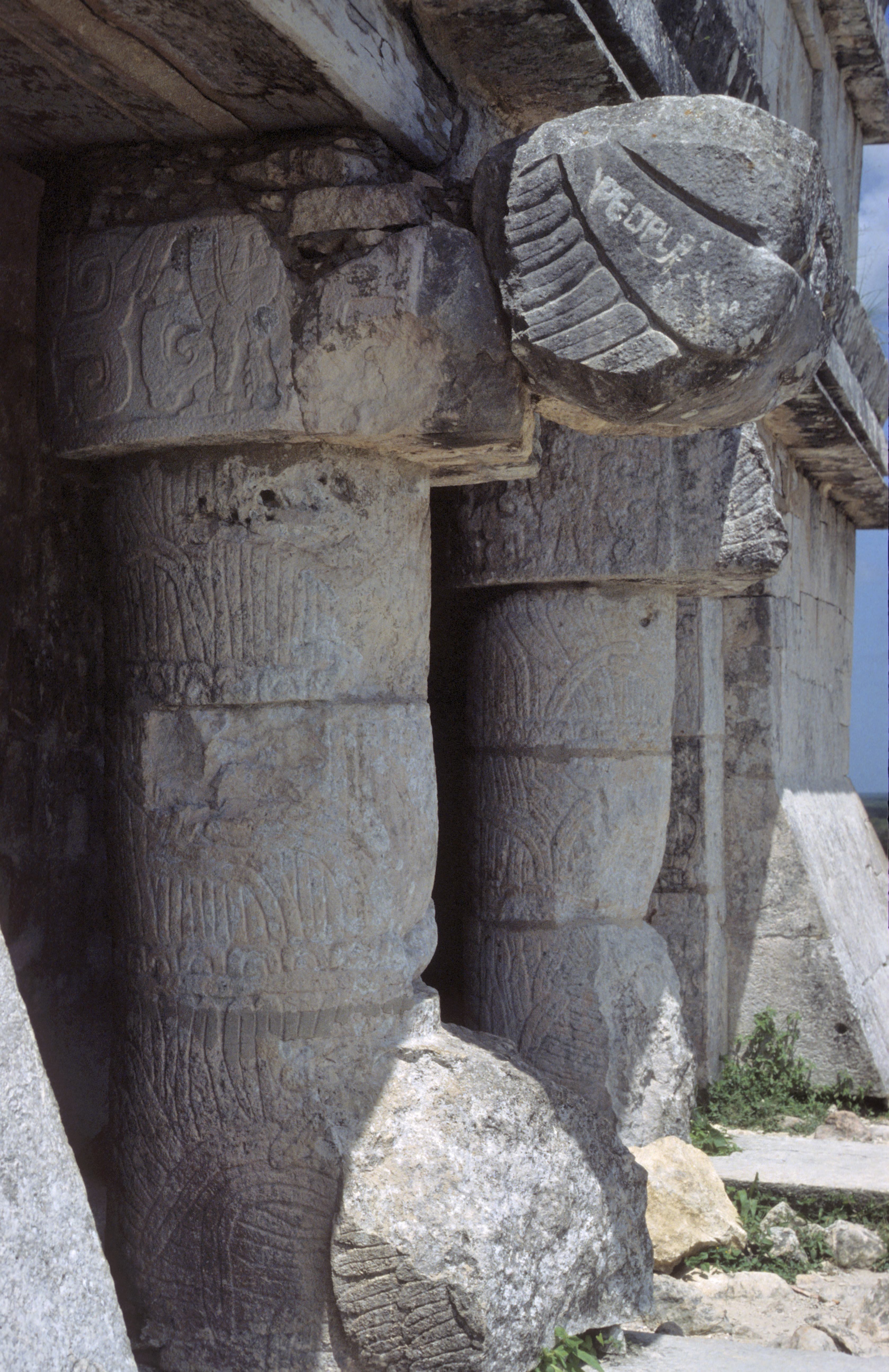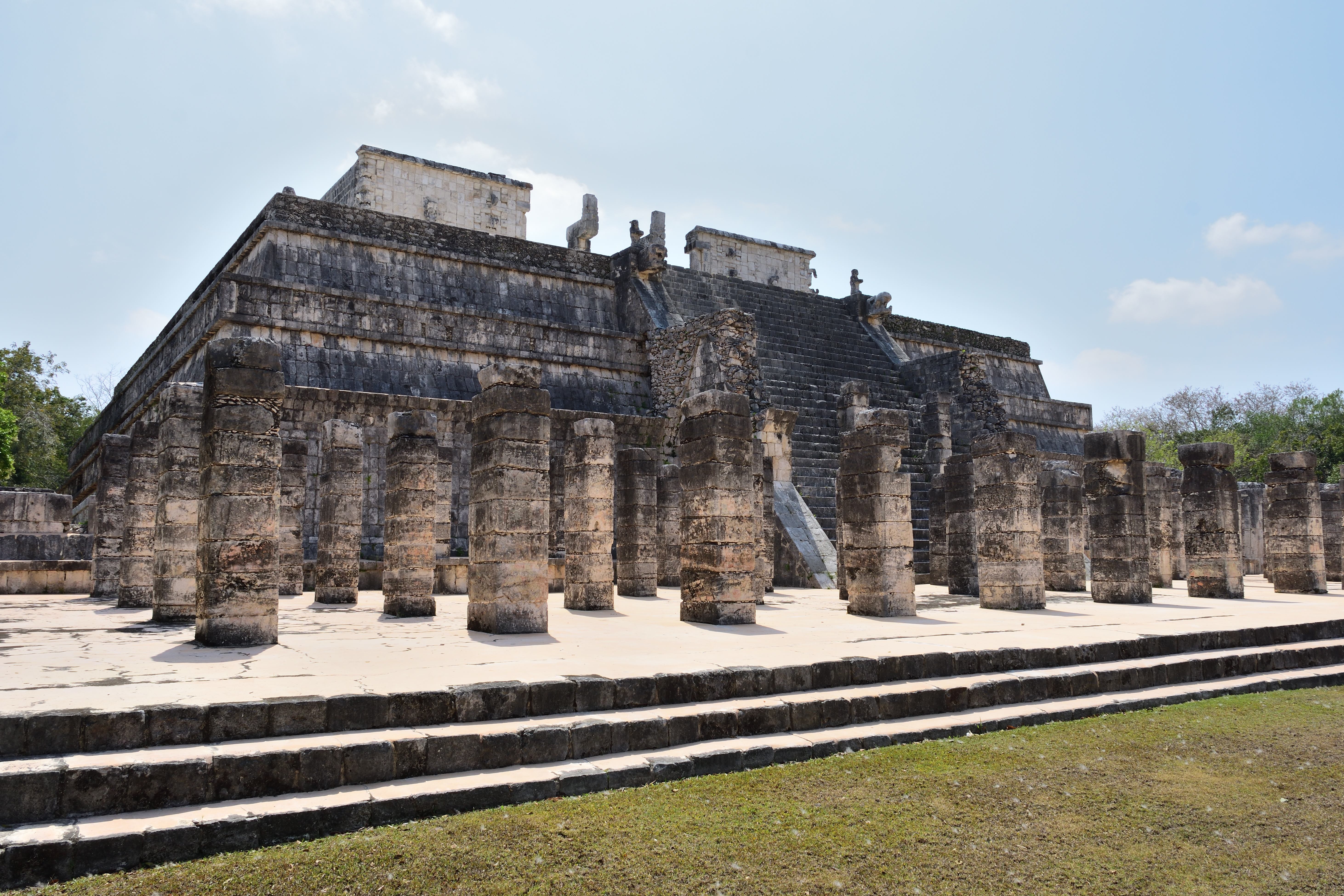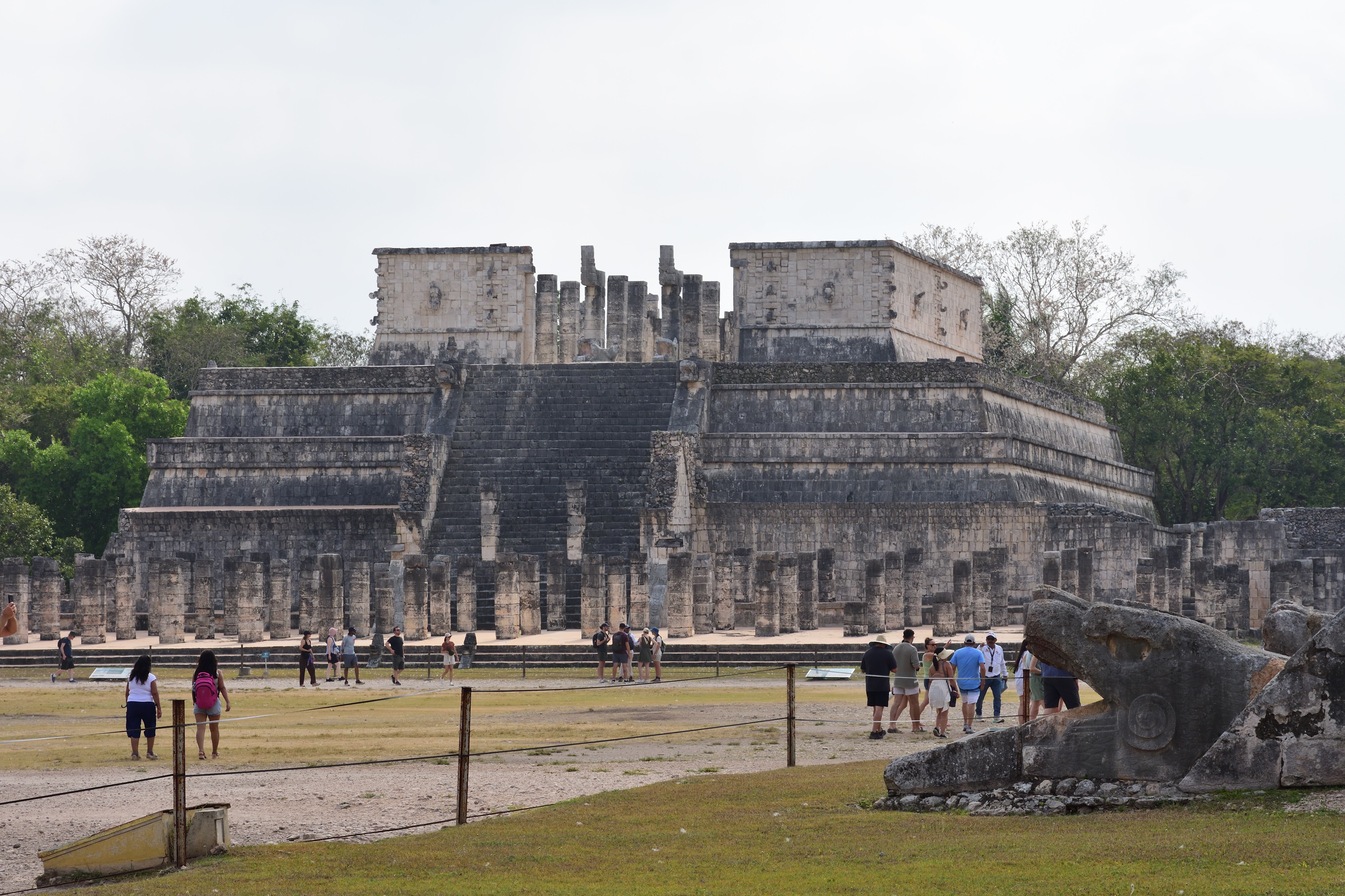 Vor und entlang der Südwand der Tempelpyramide verläuft eine prunkvolle Säulenhalle, bestehend aus vier Flügeln, die sich weiter nach Osten erstreckt und einen großen Hof von drei Seiten umgibt. Sie ist Teil der Halle der 1000 Säulen (Grupo de las Mil Columnas). Südlich und östlich des Kriegertempels verläuft eine ursprünglich mit Maya-Gewölben überdeckte Säulenhalle. Sie ist überall eingestürzt, da die Holzbalken, die die Pfeiler überspannten, verrottet sind. Die Pfeiler aus quadratischen Steinblöcken sind meist allseitig mit aufwendigen Reliefs versehen. Sie zeigen Krieger in toltekischer Tracht und Ausrüstung, sowie Darstellungen von Schlangen und des Vogelmenschen. Aufgrund der Architektur und der Darstellungen in den Steinreliefs geht man davon aus, dass die Hallen zur Versammlung von Kriegern genutzt wurden.