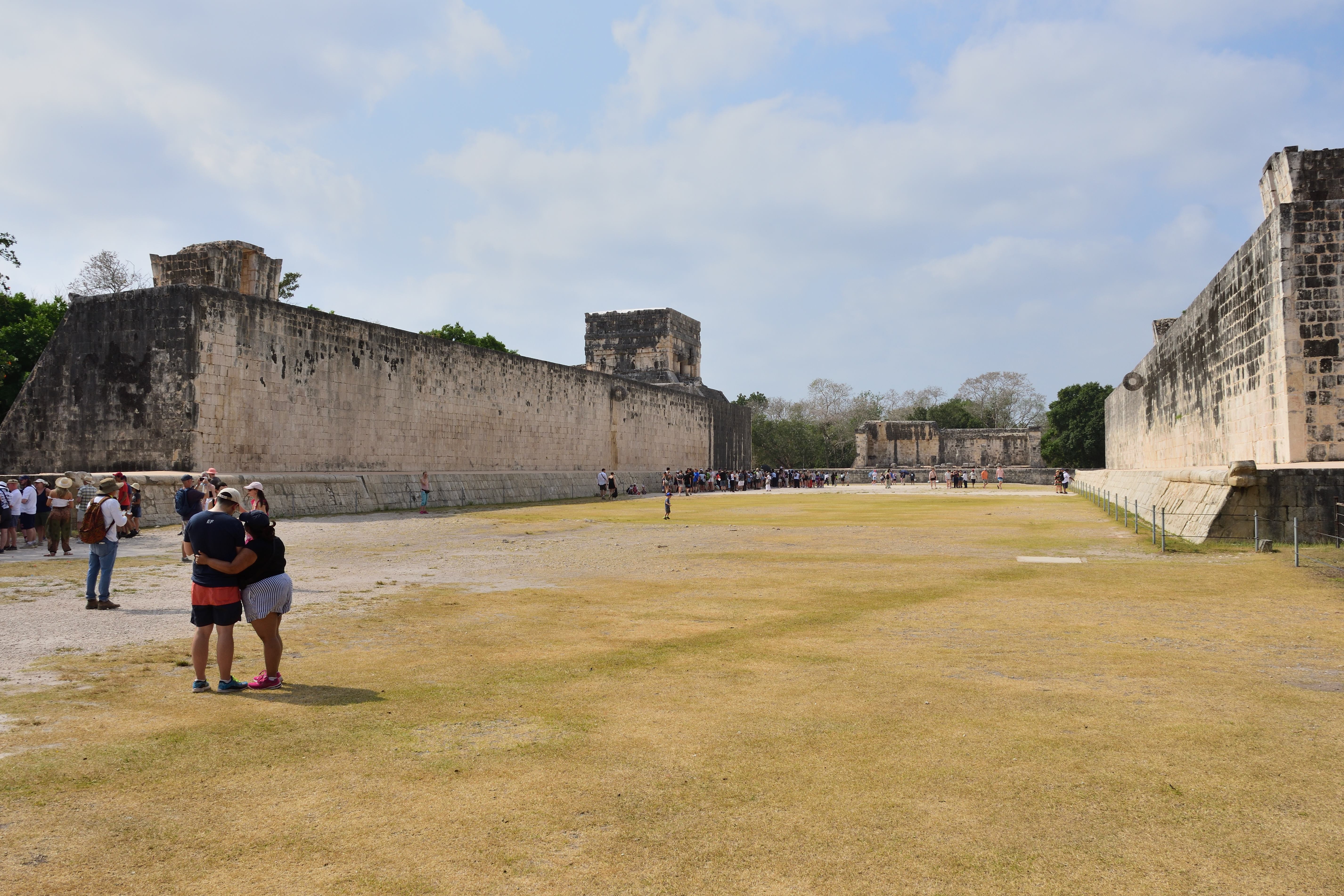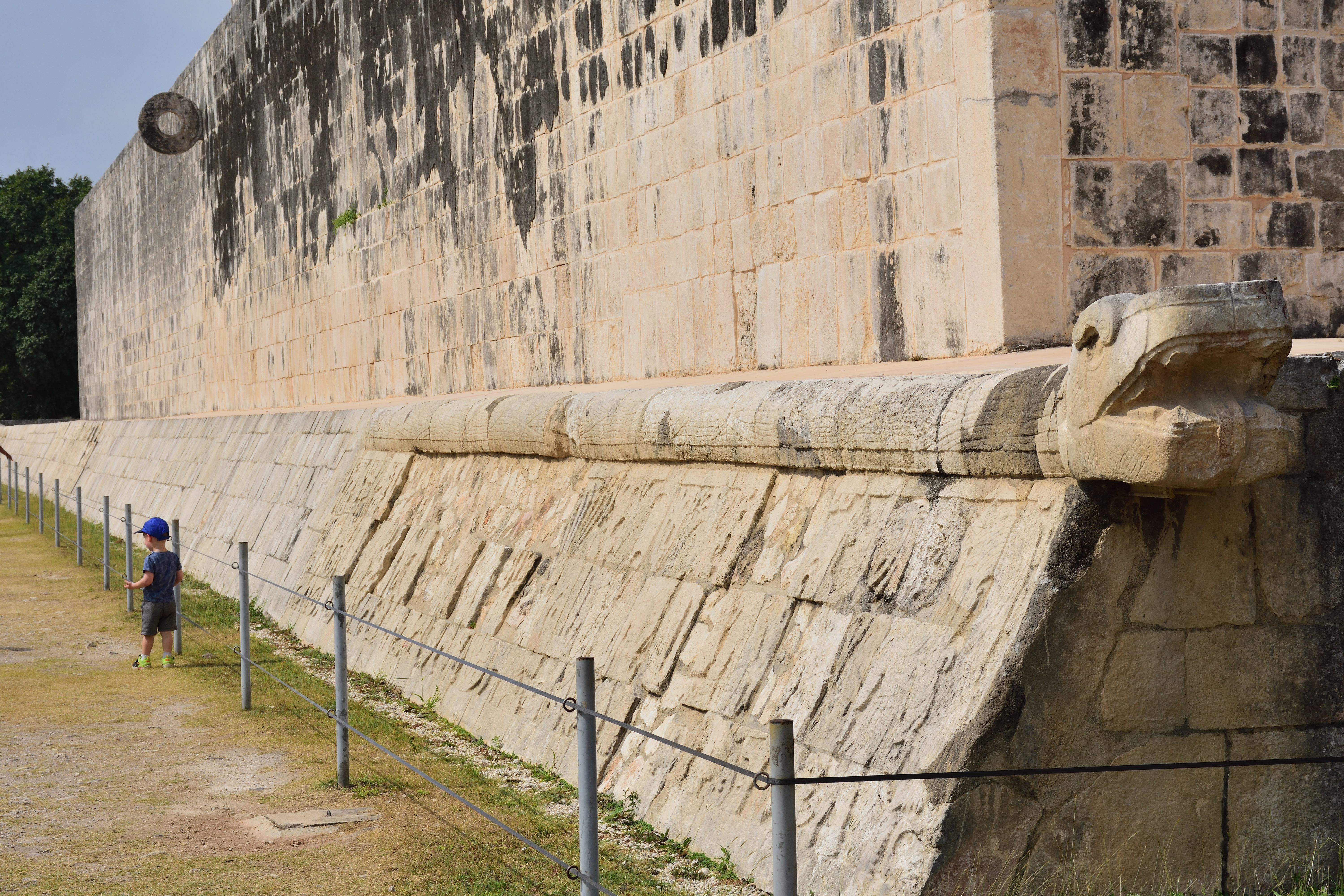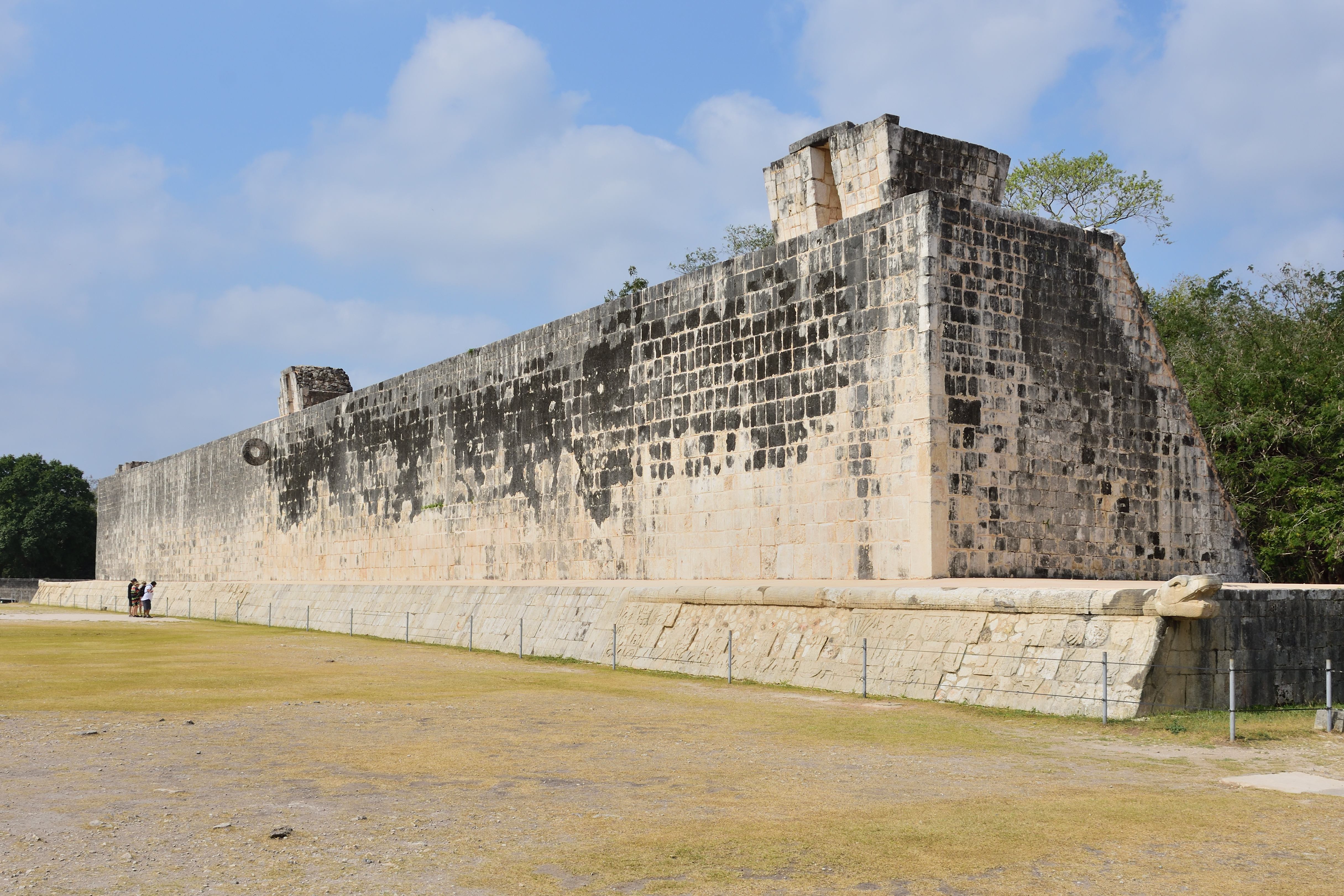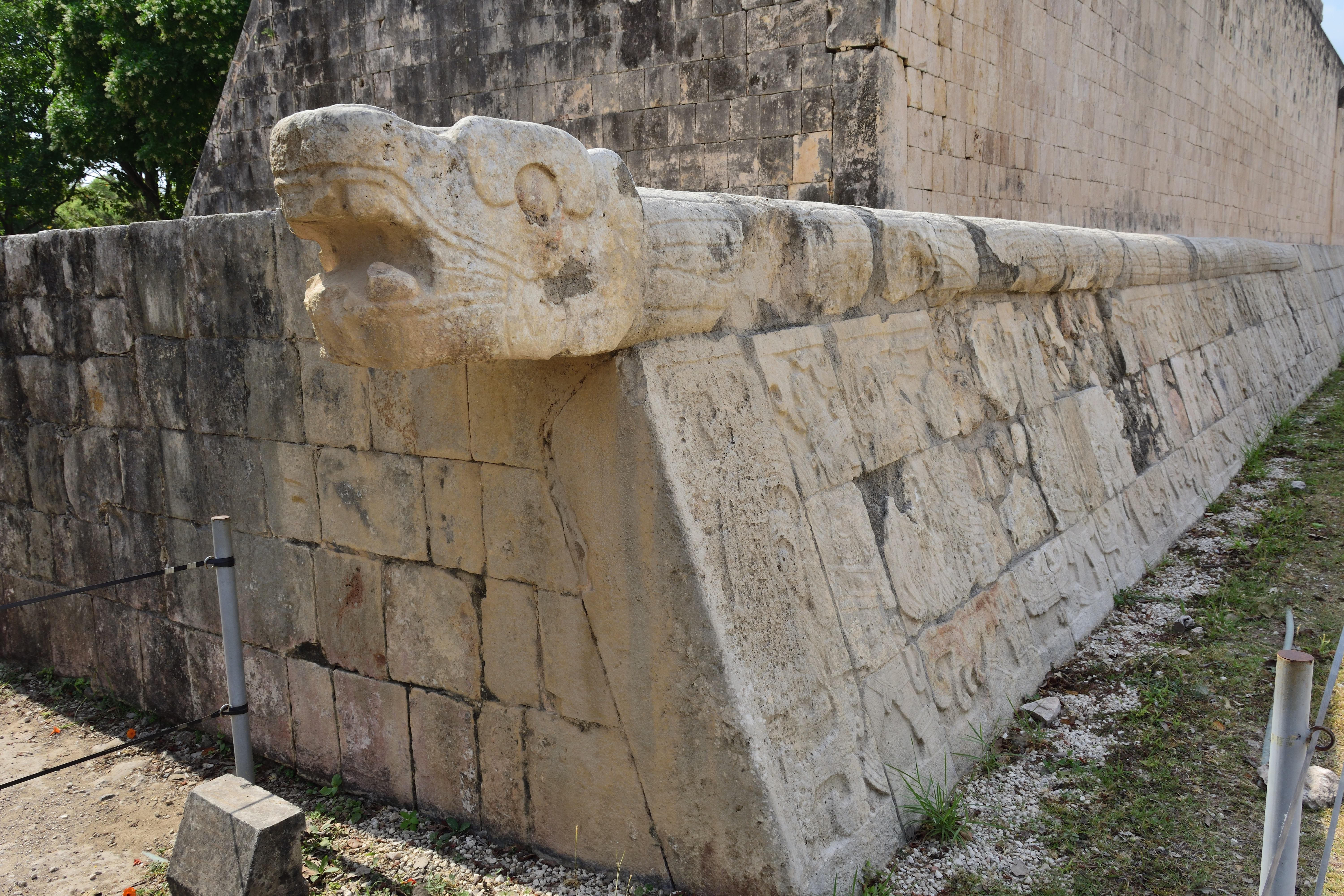 Der Große Ballspielplatz (Juego de pelota) war vermutlich für zeremonielle Zwecke bestimmt. Er befindet sich ca. hundert Meter nordwestlich der Pyramide des Kukulcán. Er ist der größte und bedeutendste der Mayakultur. Das Spielfeld ist 168 m lang und 38 m breit. Die Form der Spielfläche erinnert an zwei gegeneinandergestellte „T“ und wird von acht Meter hohen Mauern eingerahmt. Die Mauern sind ungewöhnlich dick. Von außen führen über fast die gesamte Länge Treppen auf die Oberfläche der Mauern. An den Mauern befinden sich detaillierte Reliefs, die das Geschehen zeigen. Auf den Reliefs ist zu erkennen, dass jemand enthauptet wurde. Aus dem Hals der Enthaupteten wird das herausschießende Blut in Form von sieben Schlangen dargestellt, die bei den Mayas auch als Symbol für Fruchtbarkeit galten. Aus dem Blut, das auf den Boden fließt, erwächst der „Baum des Lebens“. Die Darstellung lässt keine Rückschlüsse darauf zu, ob Gewinner oder Verlierer den Kopf verloren.